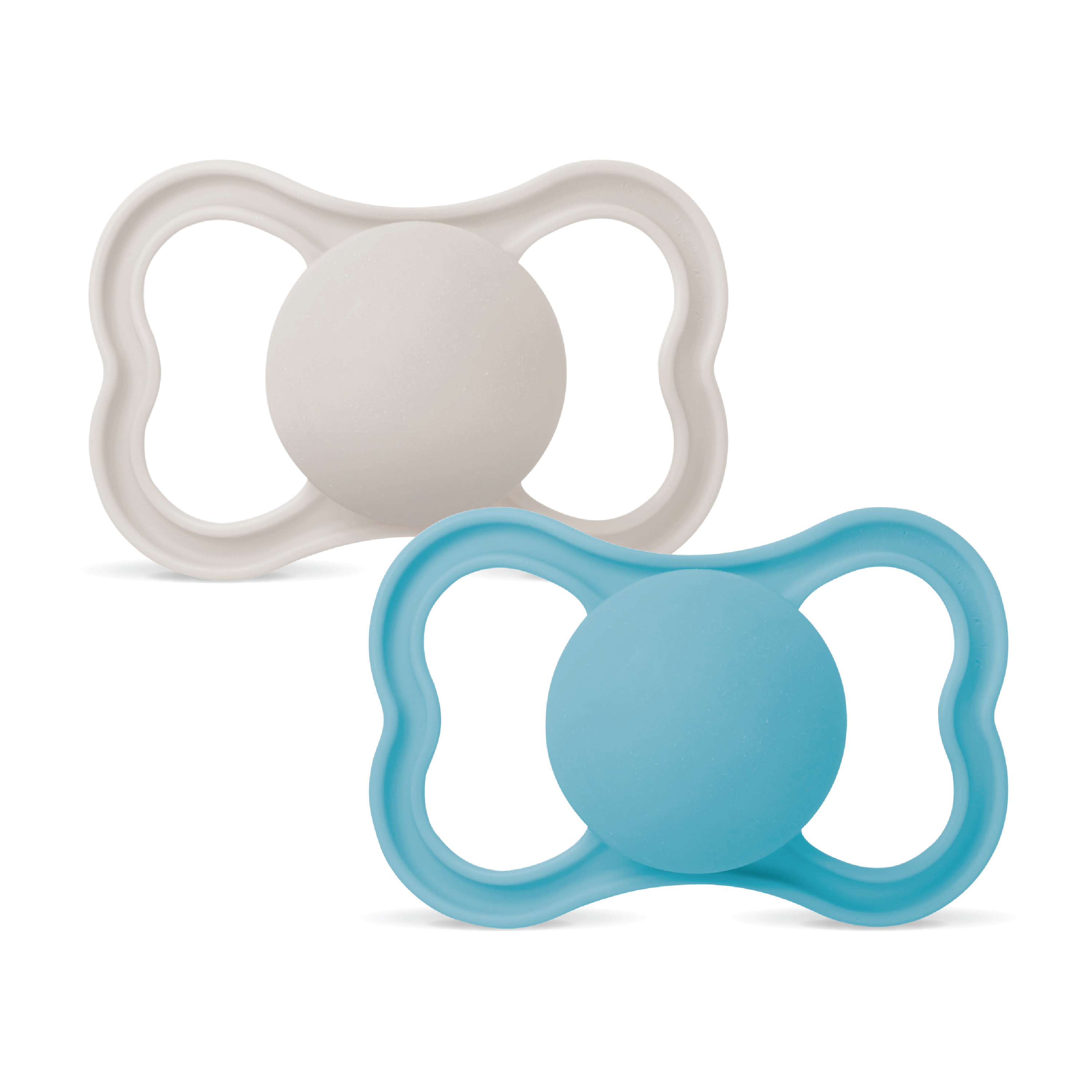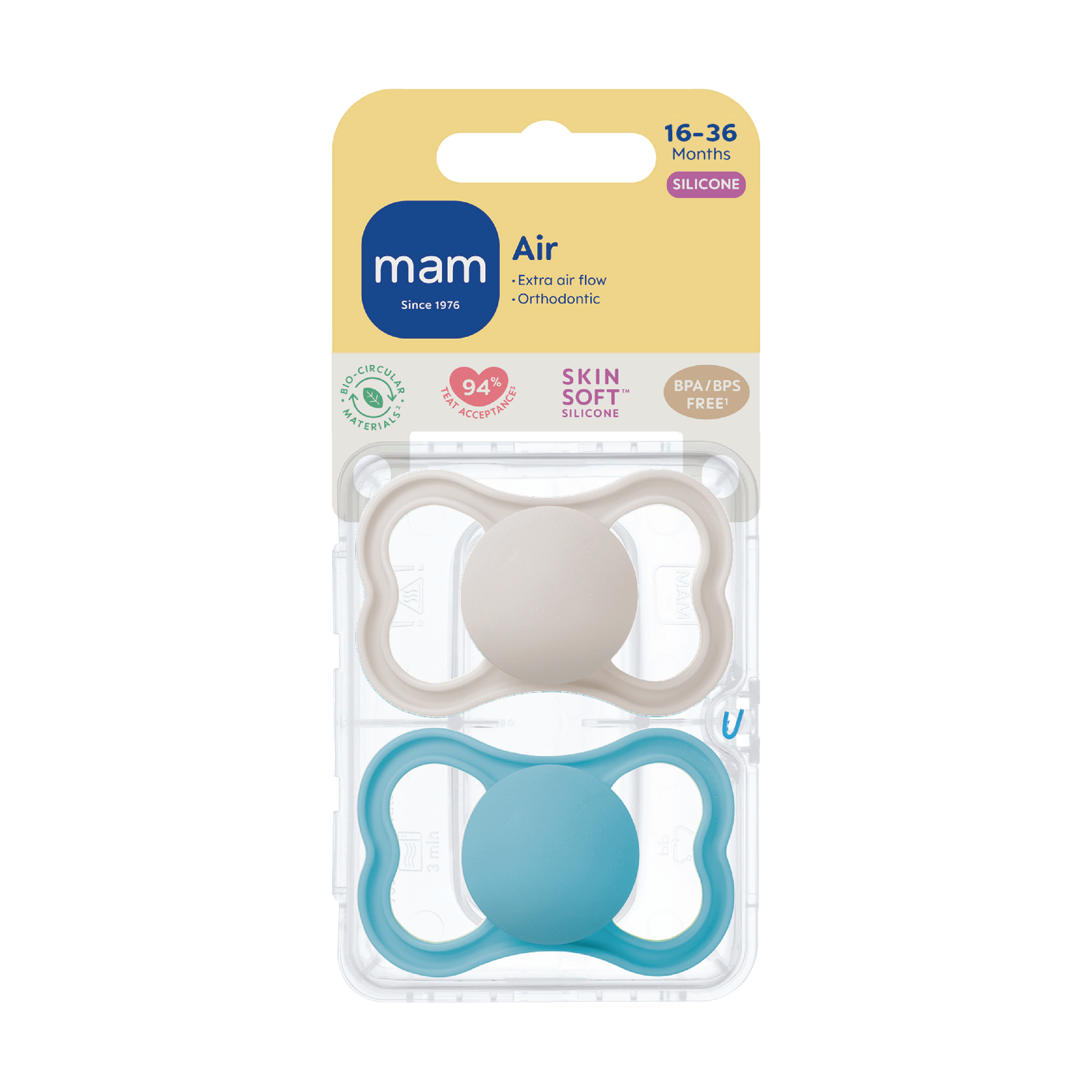 MAM Air Silicone Smokk har en flat og symmetrisk form på smokken. Med sitt unike design gjør smokken at foreldrene kan se babyens smil selv når den er i bruk. Smokken er laget av silkemyk MAM SkinSoft™-silikon, som føles myk, naturlig og som mors hud. Smokkene leveres med en praktisk oppbevarings- og steriliseringsboks, som gjør det enkelt å sterilisere dem i mikrobølgeovnen. Skjoldet, knoppen og steriliseringsboksen er laget av biosirkulære materialer.