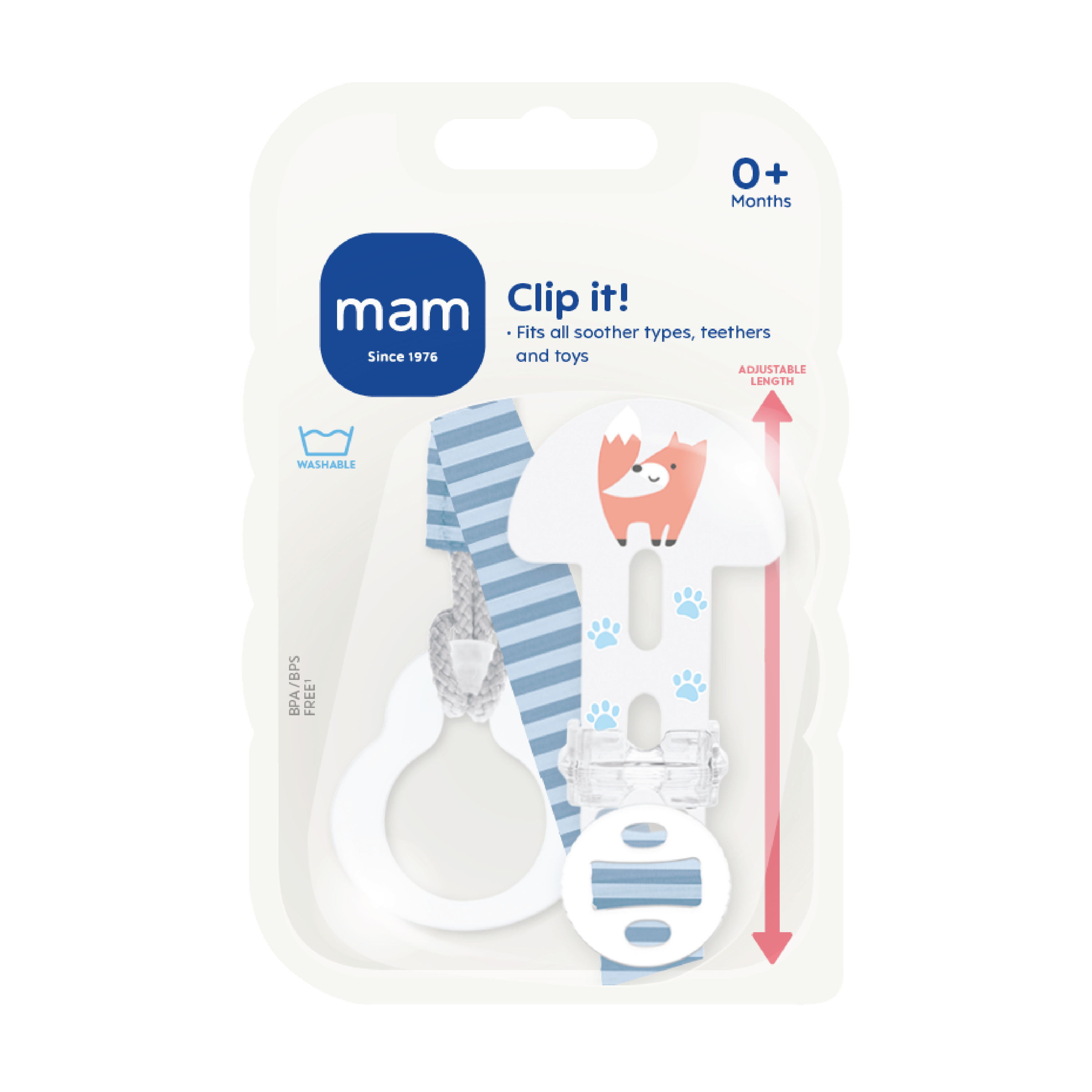 MAM har utviklet en mer stabil og allsidig smokkeholder. Den nye MAM Clip It kan brukes med ulike smokker og til annet tilbehør. Festesnoren består av en innovativ lengdejusterer, en fleksibel sløyfe og en enkel klipsmekanisme. Du kan enkelt justere lengden på klipsen, slik at den passer i enhver situasjon. Med den fleksible sløyfen kan du feste smokker med ring, biteringer, leker og annet til klipsen i en enkel håndvending. Smokkelenken har en ring til feste MAM-smokker og andre smokker med knopp, som enkelt kan tas av. Den nye klipsmekanismen åpnes automatisk når du skyver glidebryteren tilbake, og kan lett betjenes med en hånd.