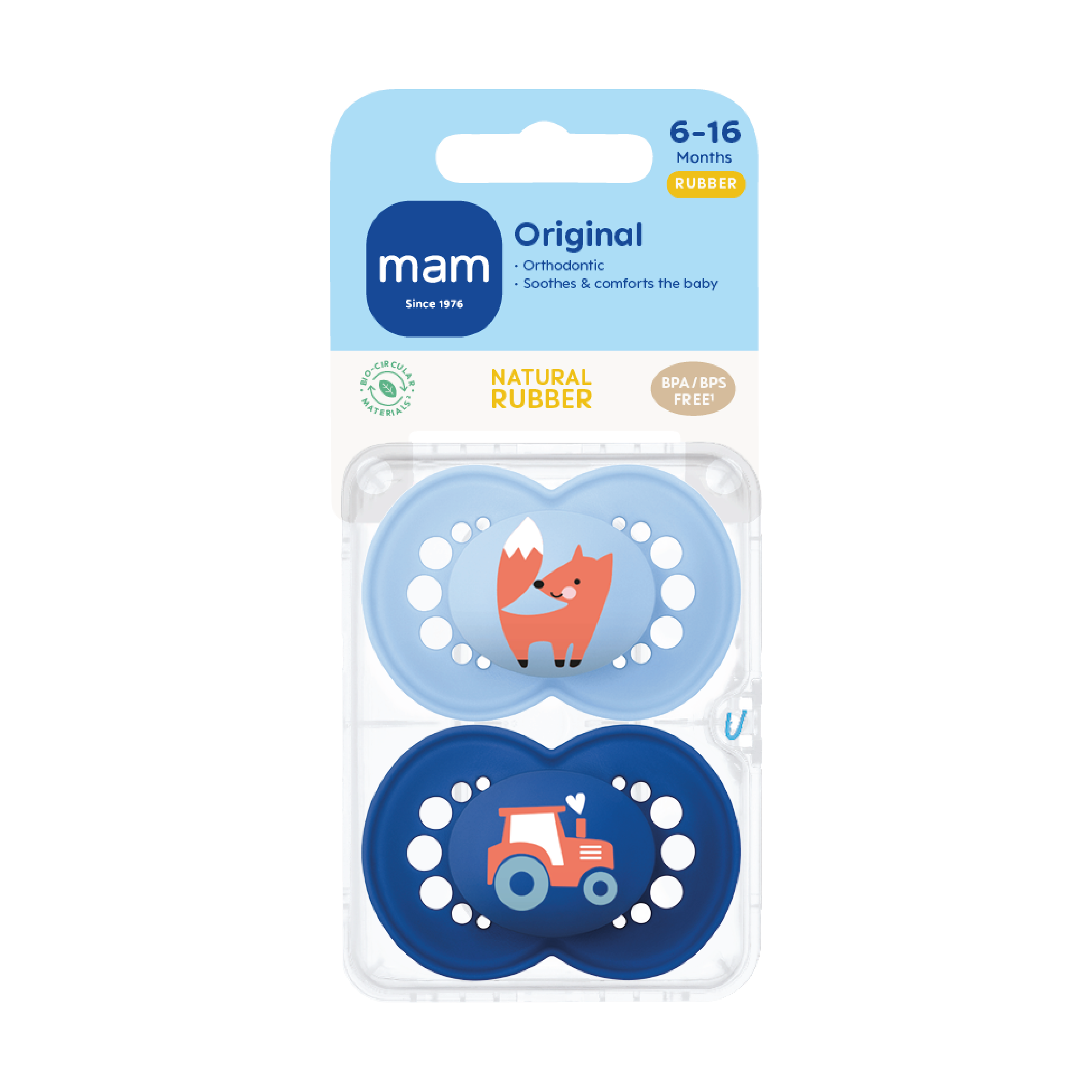 MAM Original Naturgummi Smokk er laget av Fair Rubber-sertifisert naturgummi, som gir en myk og behagelig følelse og er mer bitebestandig enn silikon. Skjoldet har store lufthull og en knudrete innside som gjør den mer skånsom mot huden. Smokken leveres med en praktisk oppbevarings- og steriliseringsboks som gjør det enkelt å sterilisere i mikrobølgeovn.