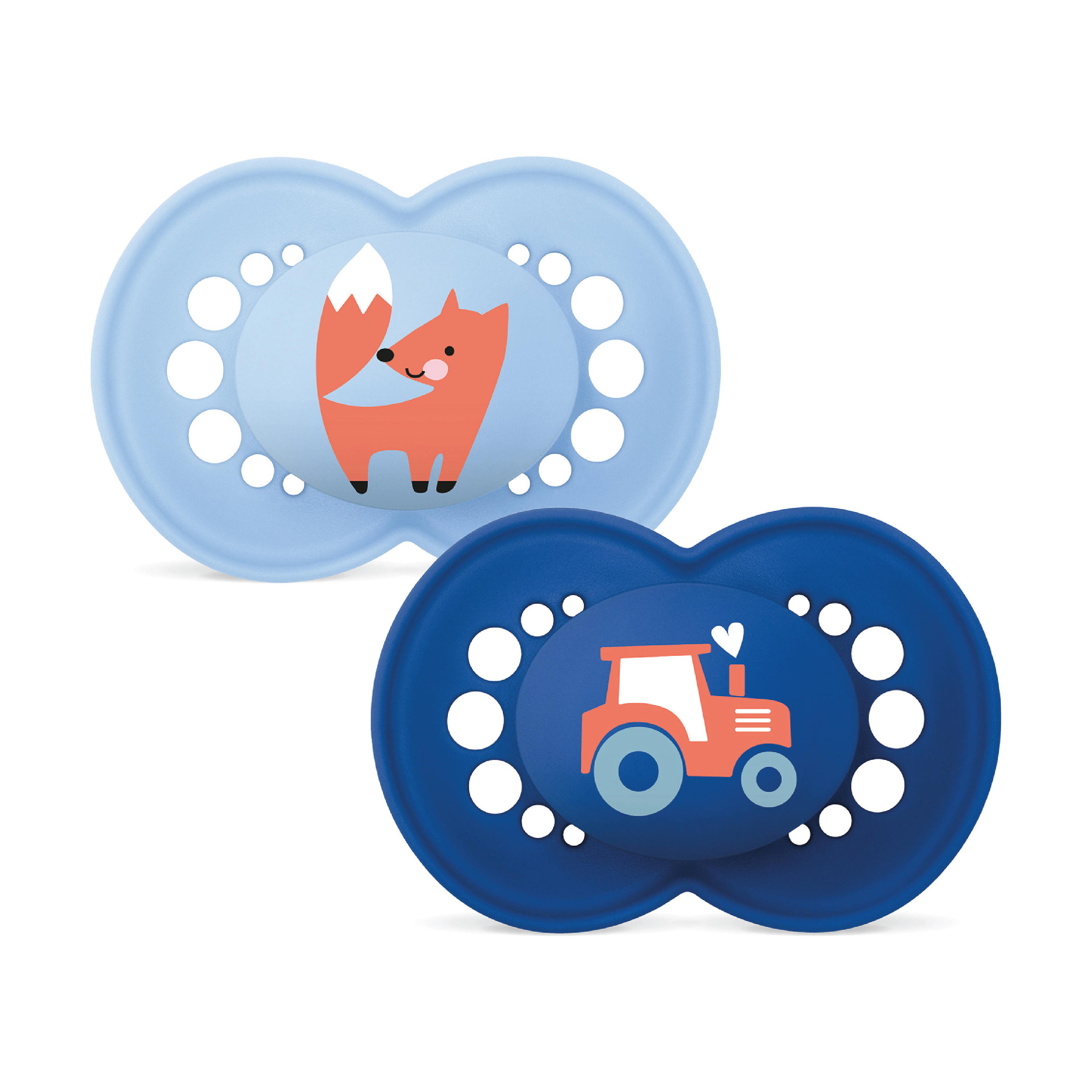 MAM Original Naturgummi Smokk er smokker av naturgummi som er skånsomme mot huden takket være de store lufthullene og den knudrete innsiden.