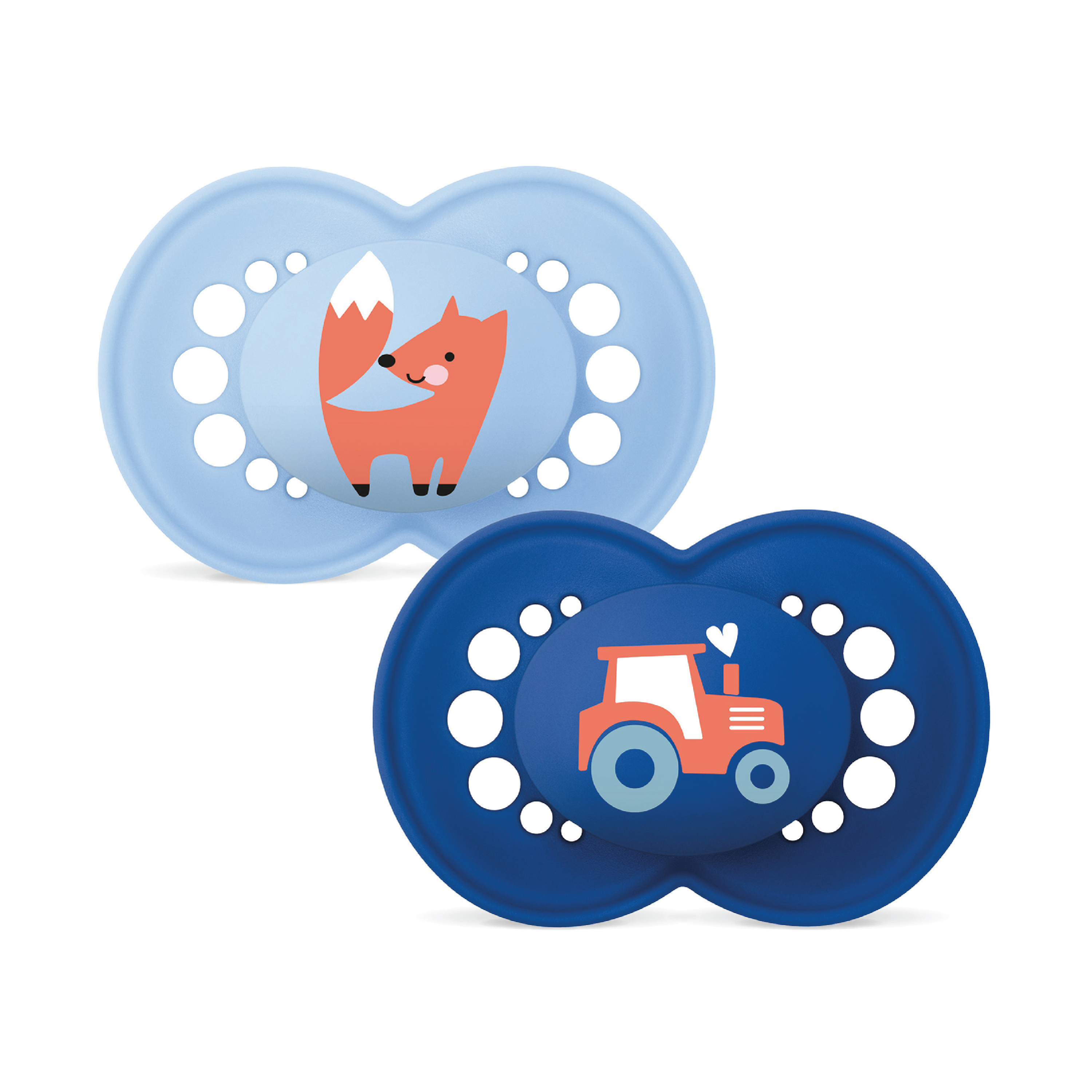 Til barn fra 16-36 måneder. I fargen lyseblå og mørkeblå. Pakken inneholder 2 stk. smokker.