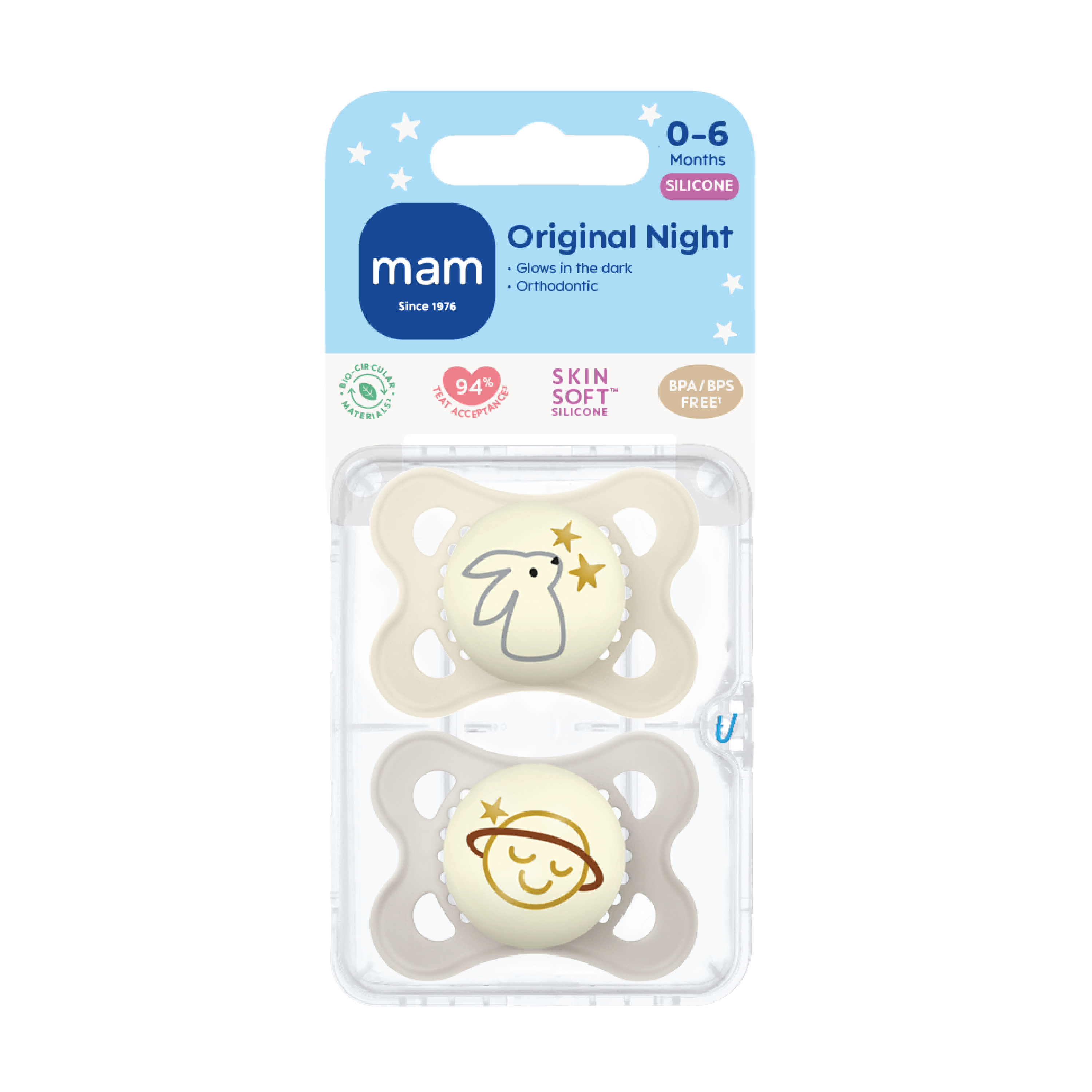 MAM Original Night Smokk er designet med mange lufthull, som gjør den ekstra skånsom mot huden ved å gi bedre luftstrøm, noe som reduserer risikoen for hudirritasjon. Sugedelen til smokken er anatomisk utformet og minimerer påvirkningen på munn og kjeve. Smokken har også en knudrete innside som sikrer ekstra komfort for babyen din. Smokken har en selvlysende knott som gjør det enkelt å finne smokken i mørket. Smokken er laget av MAM sin silkemyke SkinSoftTM silikon, som føles behagelig mot babyens hud. Leveres i en steriliseringsboks som gjør det enkelt å rengjøre og oppbevare smokken hygienisk.