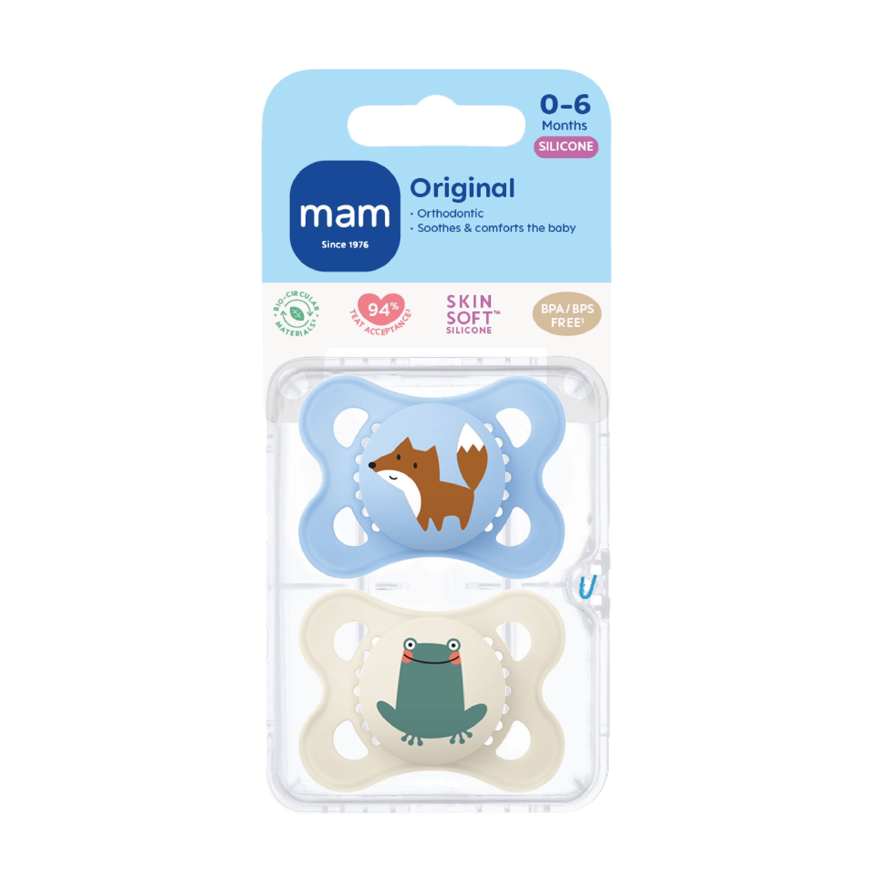 MAM Original Smokk har store lufthull og en knudrete innside som reduserer risikoen for hudirritasjon. Sugedelen er laget av den silkemyke MAM SkinSoft™-silikonen, som minner om mors hud. Smokkene leveres med en praktisk oppbevarings- og steriliseringsboks som gjør det enkelt å sterilisere smokkene direkte i mikrobølgeovnen. Skjoldet, knoppen og steriliseringsboksen er laget av biosirkulære materialer, noe som bidrar til en mer bærekraftig fremtid.