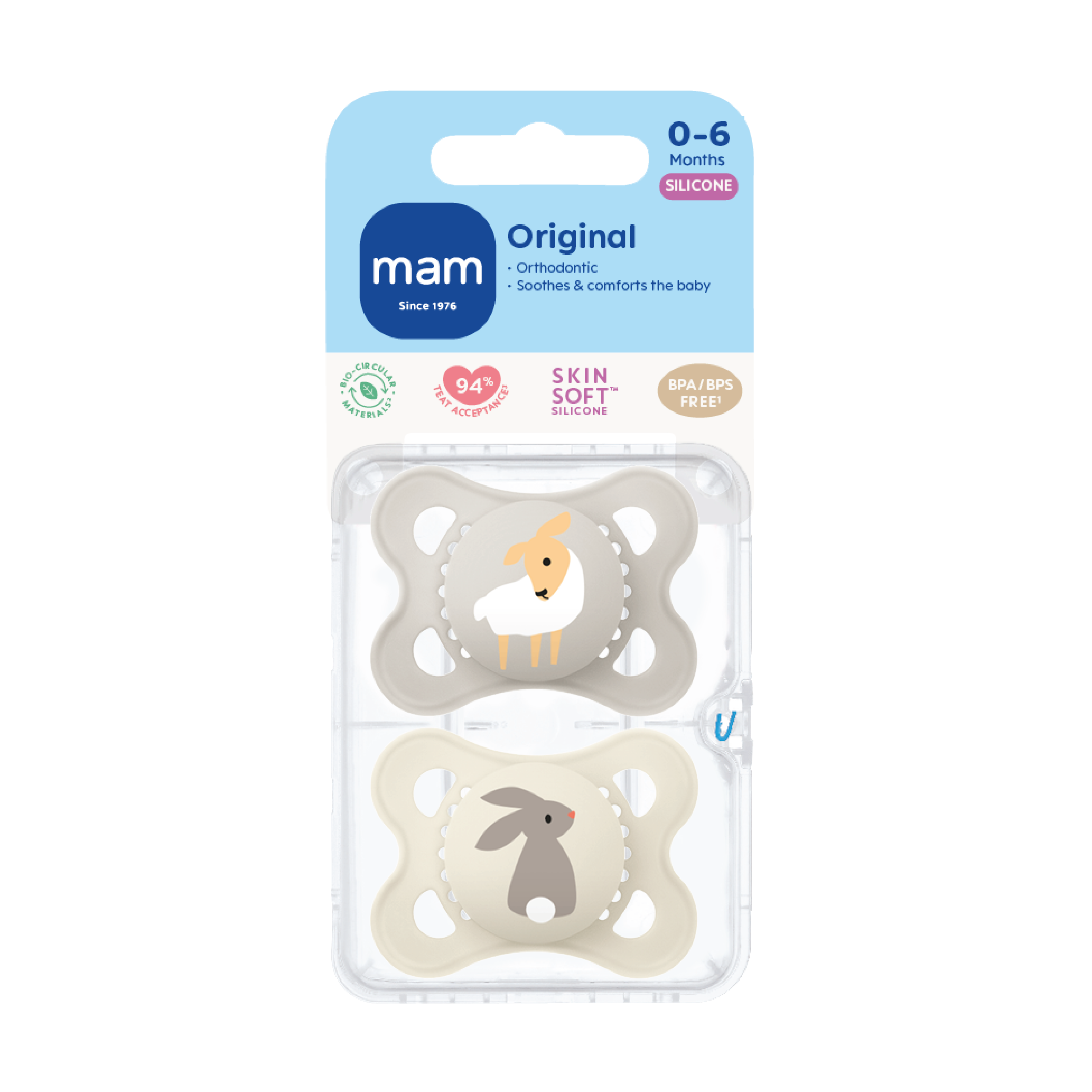 MAM Original Smokk har store lufthull og en knudrete innside som reduserer risikoen for hudirritasjon. Sugedelen er laget av den silkemyke MAM SkinSoft™-silikonen, som minner om mors hud. Smokkene leveres med en praktisk oppbevarings- og steriliseringsboks som gjør det enkelt å sterilisere smokkene direkte i mikrobølgeovnen. Skjoldet, knoppen og steriliseringsboksen er laget av biosirkulære materialer, noe som bidrar til en mer bærekraftig fremtid.