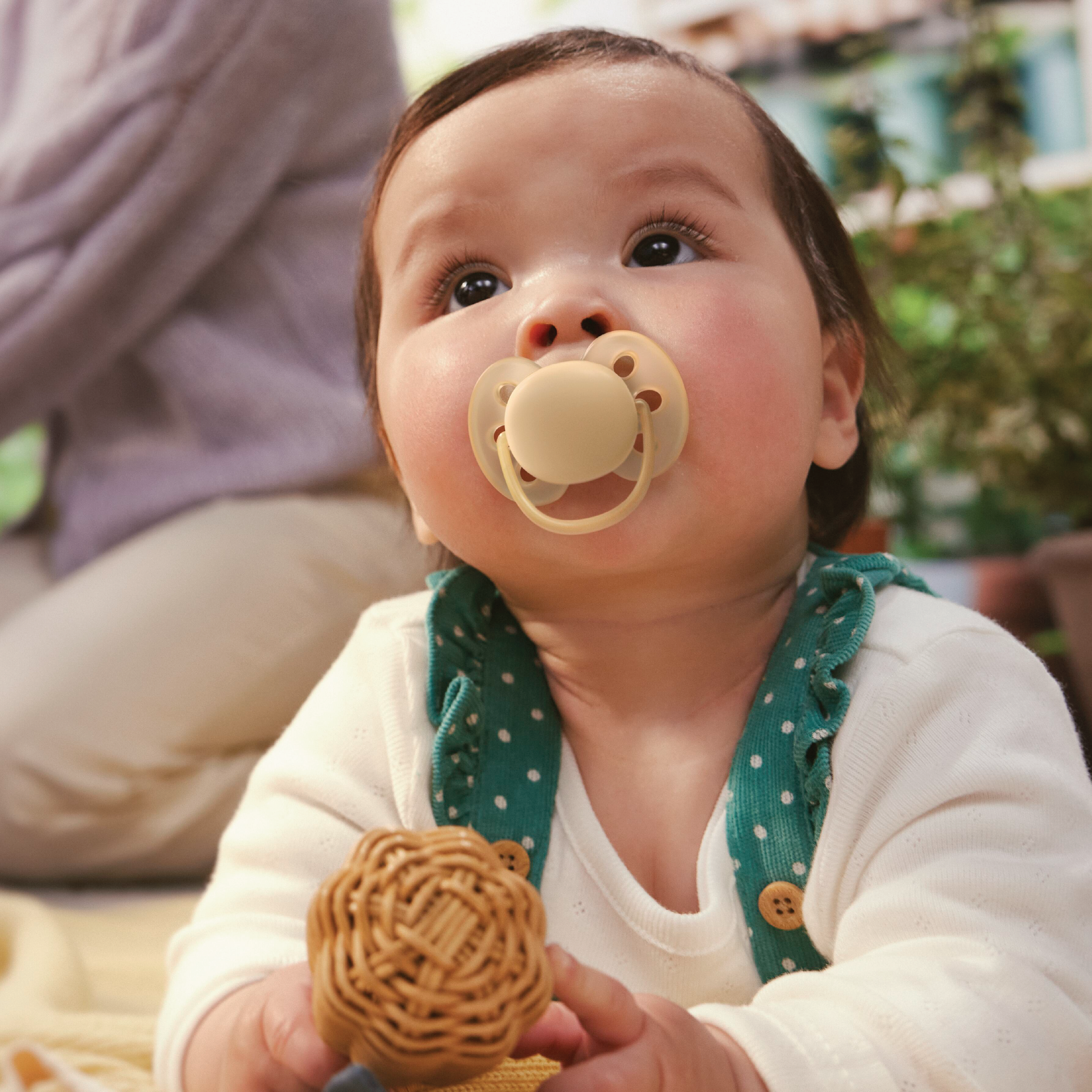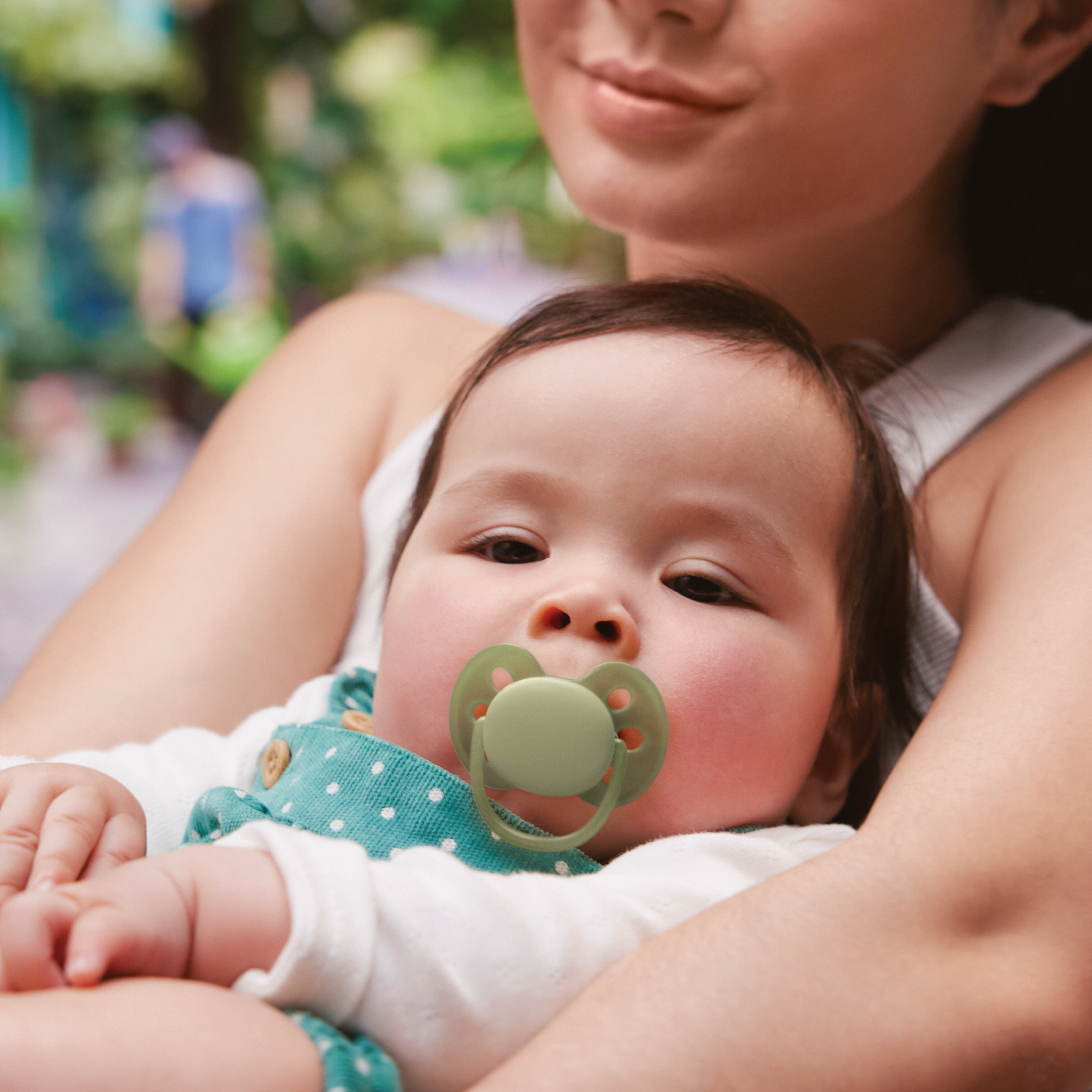 - Ortodontisk utformet smokk i myk silikon.