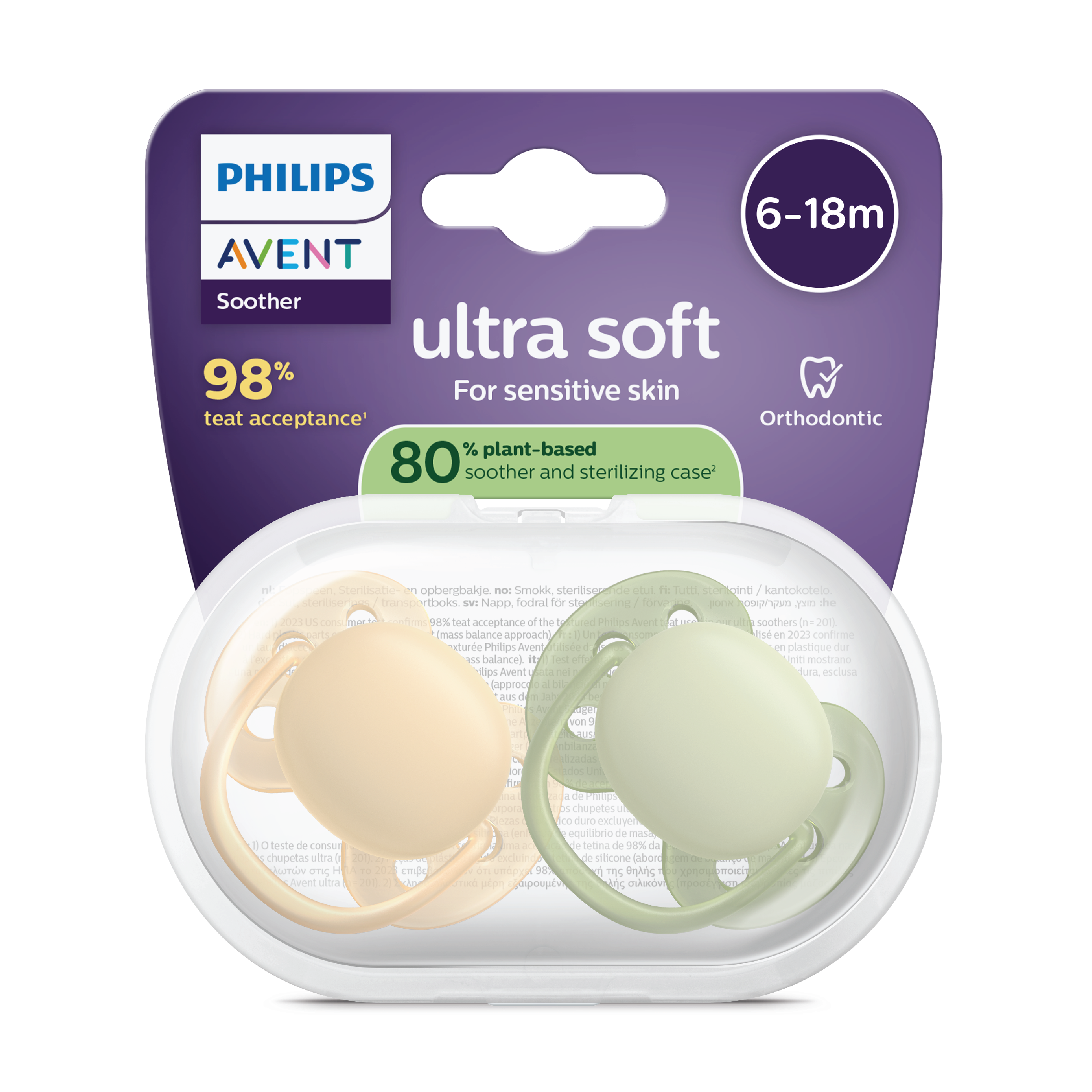 Philips Avent Ultra Soft Smokk har en myk skjoldteknologi som følger de naturlige konturene i barnets ansikt og bidrar til færre merker i huden og mindre irritasjon. Det avrundede smokkeskjoldet gir et minimalt og skånsomt trykk mot kinnene. Den ortodontiske smokken er laget av 100 % silikon i matkvalitet og støtter de naturlige muskelbevegelsene i munnen for å minske risikoen for feilbitt. Den smale smokkehalsen er utformet for å redusere presset mellom tungen og ganen. Den teksturerte smokken er utviklet for å gjenskape følelsen av mors bryst. Oppbevaringsetuiet kan brukes til sterilisering ved å fylle det med vann og plassere det i mikrobølgeovnen i tre minutter, noe som genererer opptil 50 % lavere CO2-utslipp.