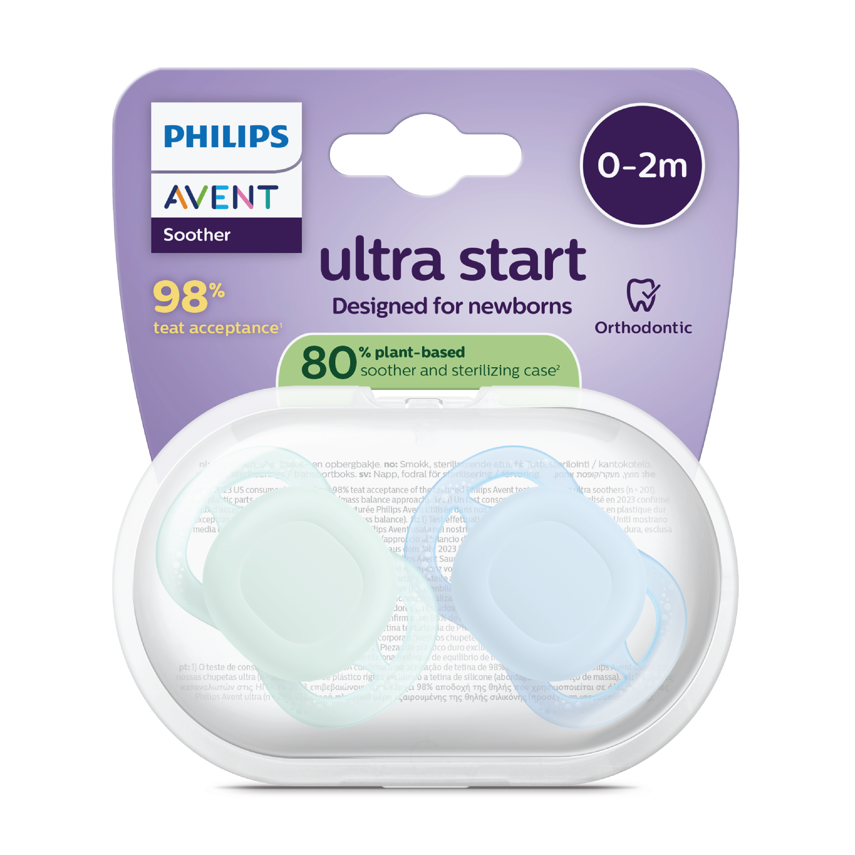 Philips Avent Ultra Start Smokk har en lett og ringløs utforming som gjør den godt egnet som barnets første smokk. Den ortodontiske og symmetriske silikonsmokken er myk og utviklet for naturlig utvikling av munnhulen. Smokkeskjoldet og oppbevaringsetuiet er laget med 80 % plantebaserte materialer, for å være et mer miljøvennlig valg. Det medfølgende oppbevaringsetuiet fungerer også som steriliseringsboks: fyll på vann og plasser i mikrobølgeovnen i tre minutter for enkel sterilisering, som genererer opptil 50 % lavere CO2-utslipp.