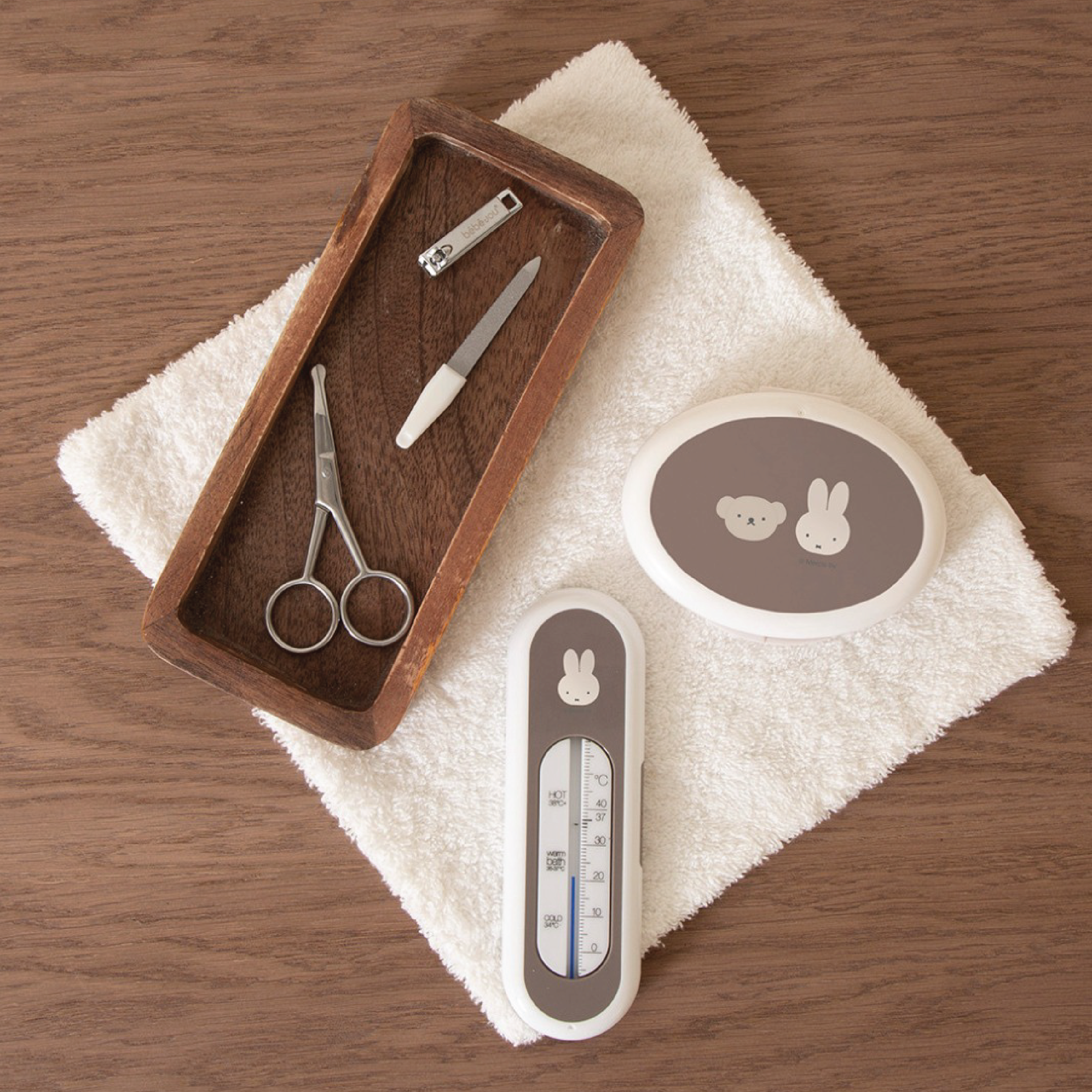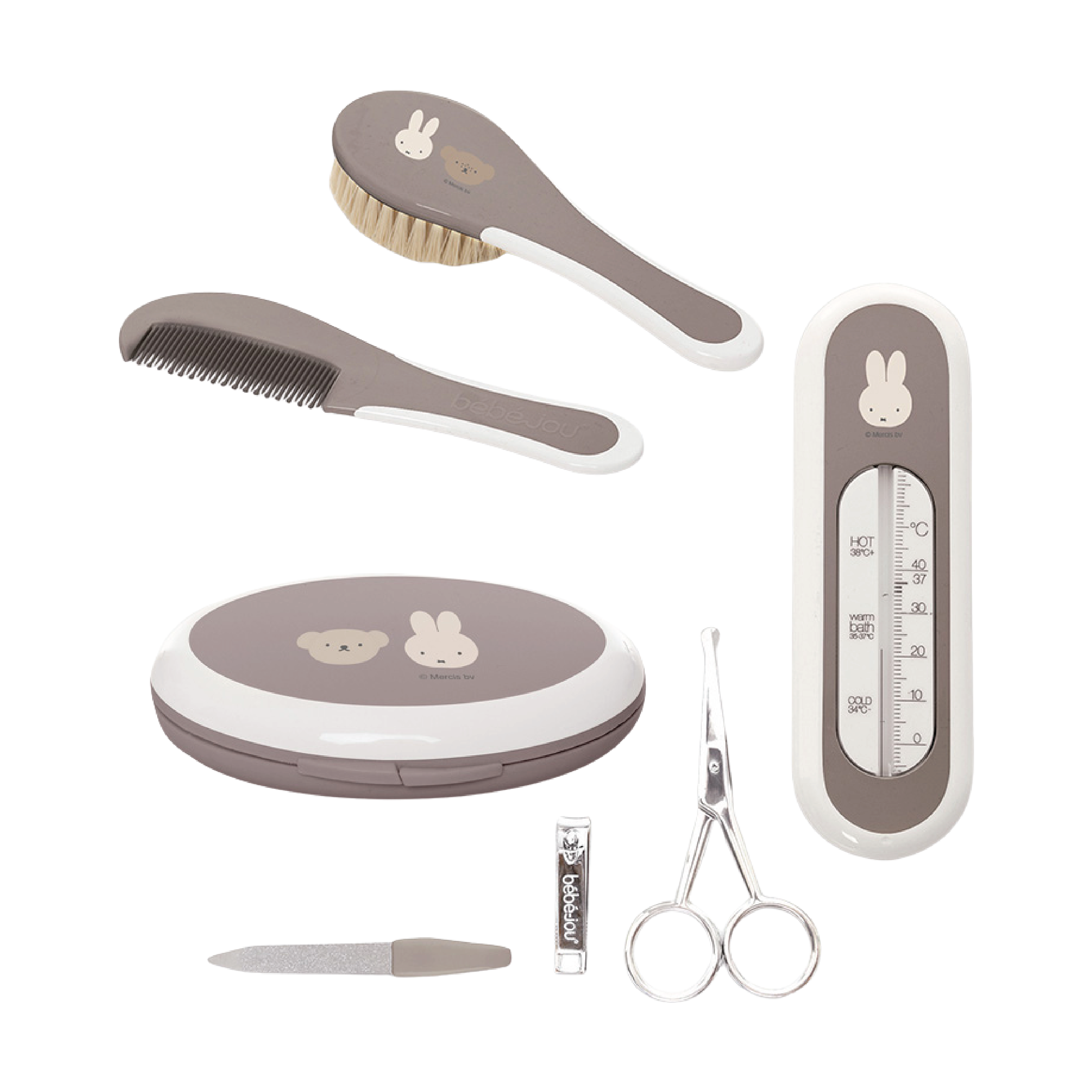 Settet inneholder 1 x hårbørste, 1 x kam, 1 x negleklipper, 1 x neglesaks og 1 x neglefil. I fargen grå med motiv av Miffy.