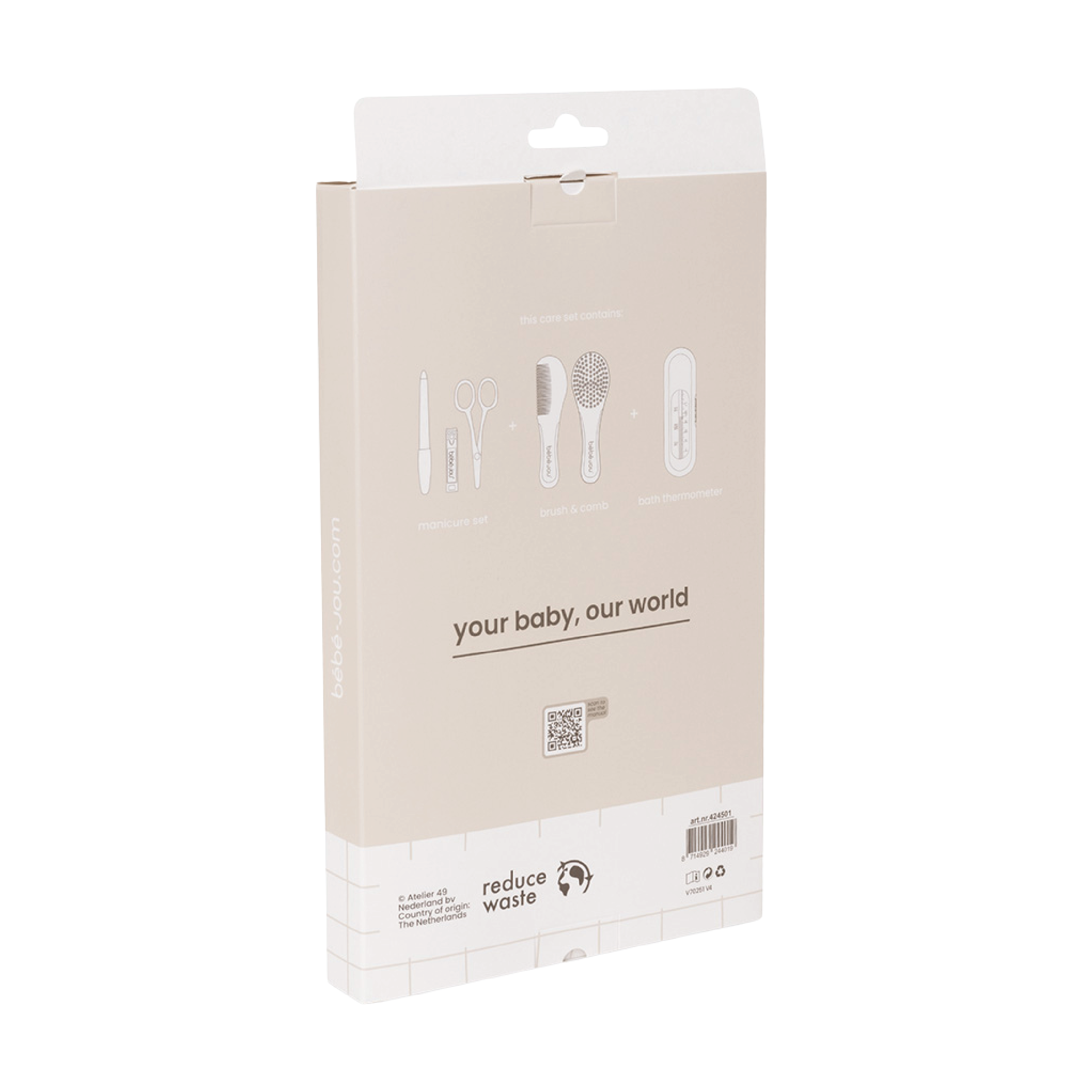 Bébé-Jou Care Set samler flere av de viktigste pleieproduktene i ett praktisk sett, utviklet for babyens sensitive hud og hår. Settet inneholder en myk babybørste som er skånsom mot hodebunnen, kam med avrundede tenner for enkel utredning, negleklipper tilpasset små fingre, neglesaks med avrundede tupper og en neglefil for jevn etterbehandling. Produktene er utformet for trygg bruk og gir godt grep og god kontroll under stell. Settet leveres i et praktisk etui som egner seg både hjemme og på reise.