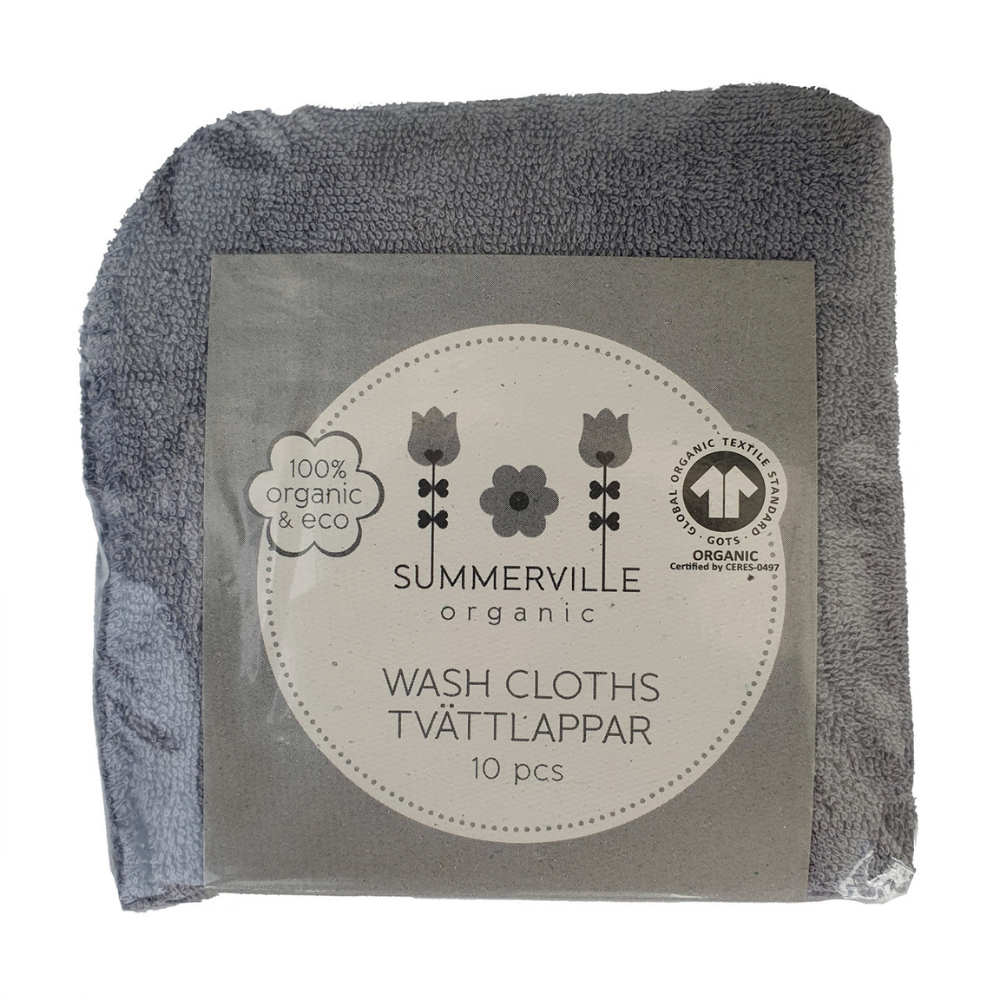 Summerville Organic Vaskekluter 10-pk er en pakke med ti vaskekluter i 100 % økologisk bomull, i fargen grå.
