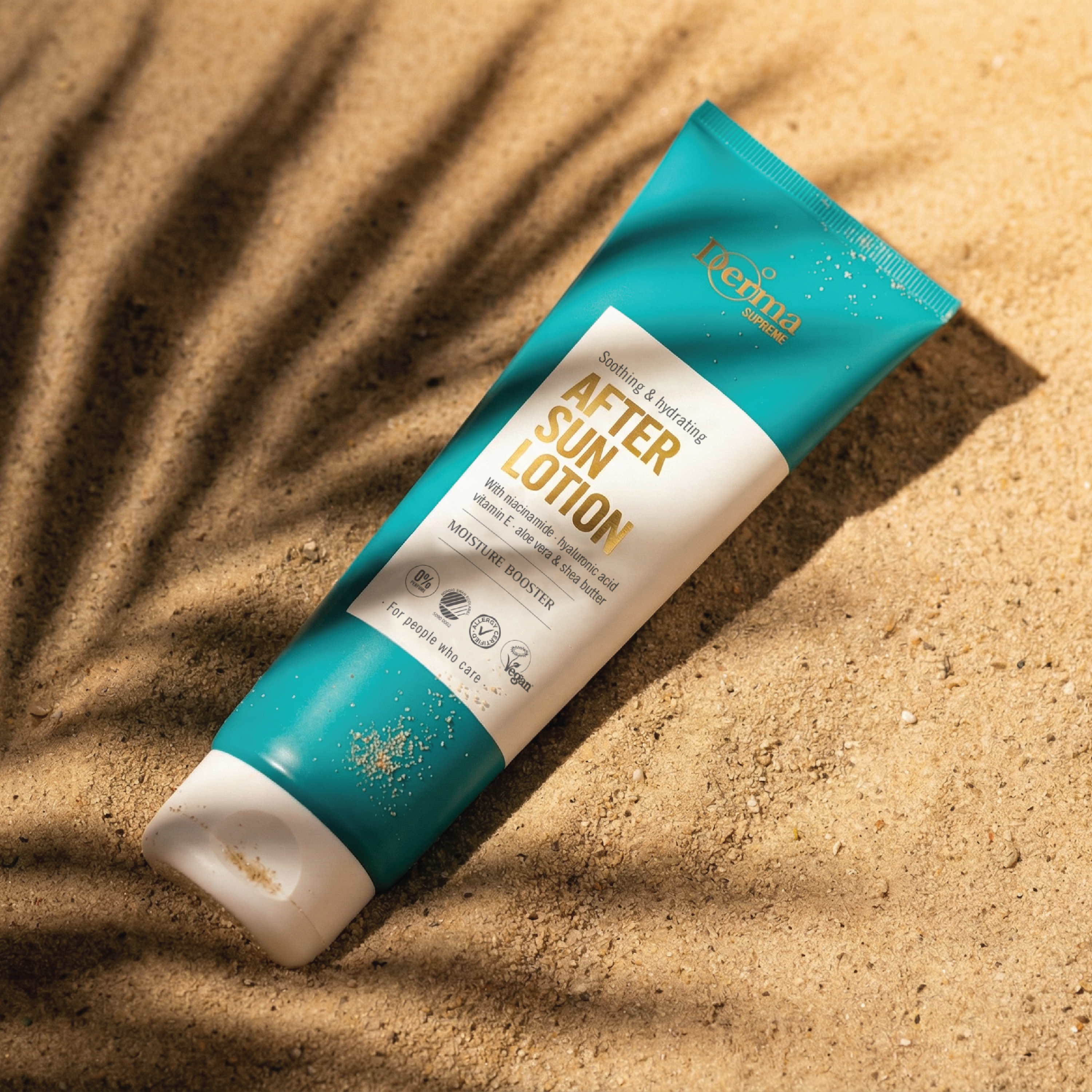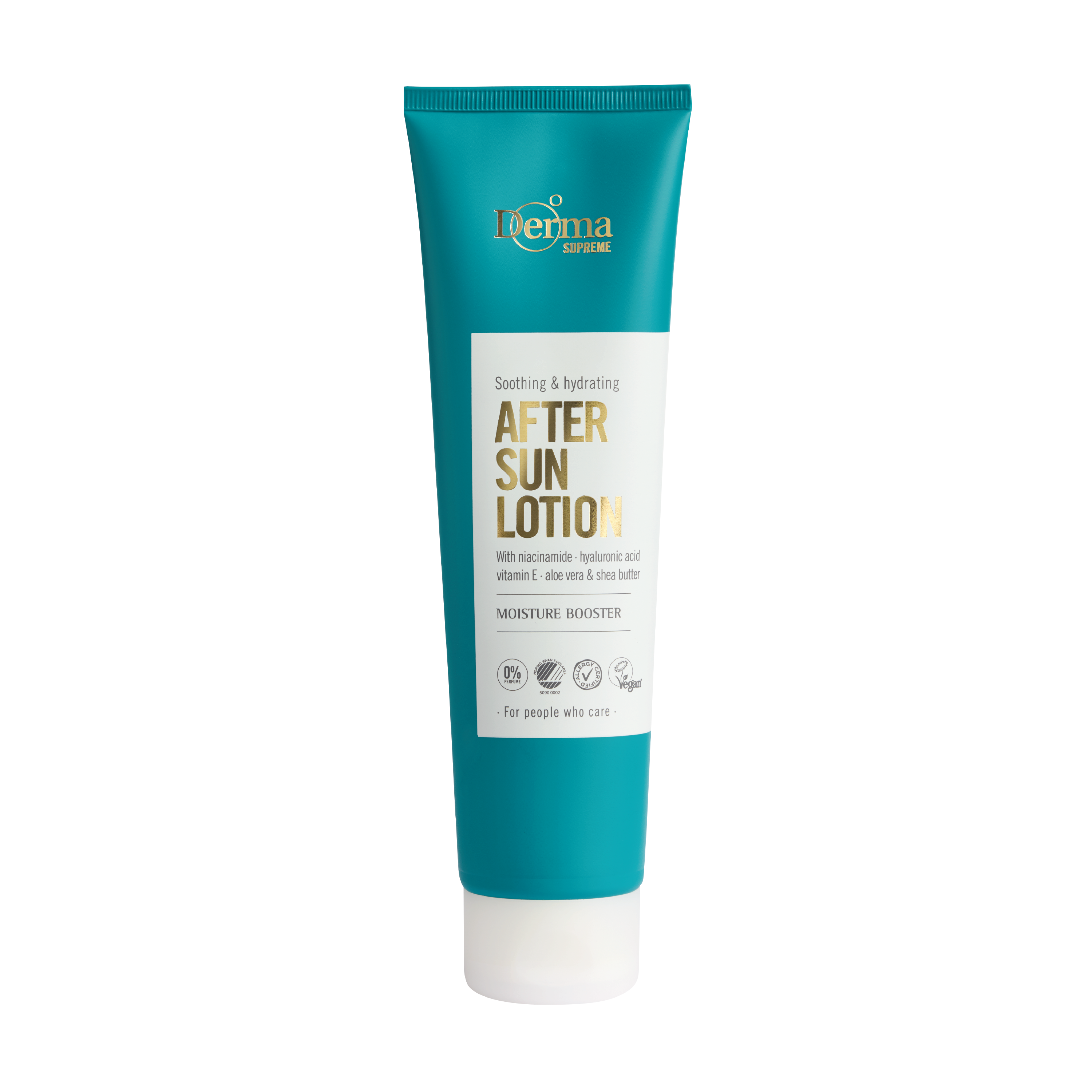 Derma Supreme After Sun Lotion er formulert med hyaluronsyre som tilfører og binder fuktighet slik at huden føles myk og smidig, aloe vera som virker kjølende og beroligende, niacinamid som bidrar til å styrke hudbarrieren og motvirke uttørking, E-vitamin som beskytter mot frie radikaler, og sheasmør som nærer huden og bidrar til å bevare elastisiteten. Den lette konsistensen trekker raskt inn og gir en behagelig følelse etter en lang dag i solen.