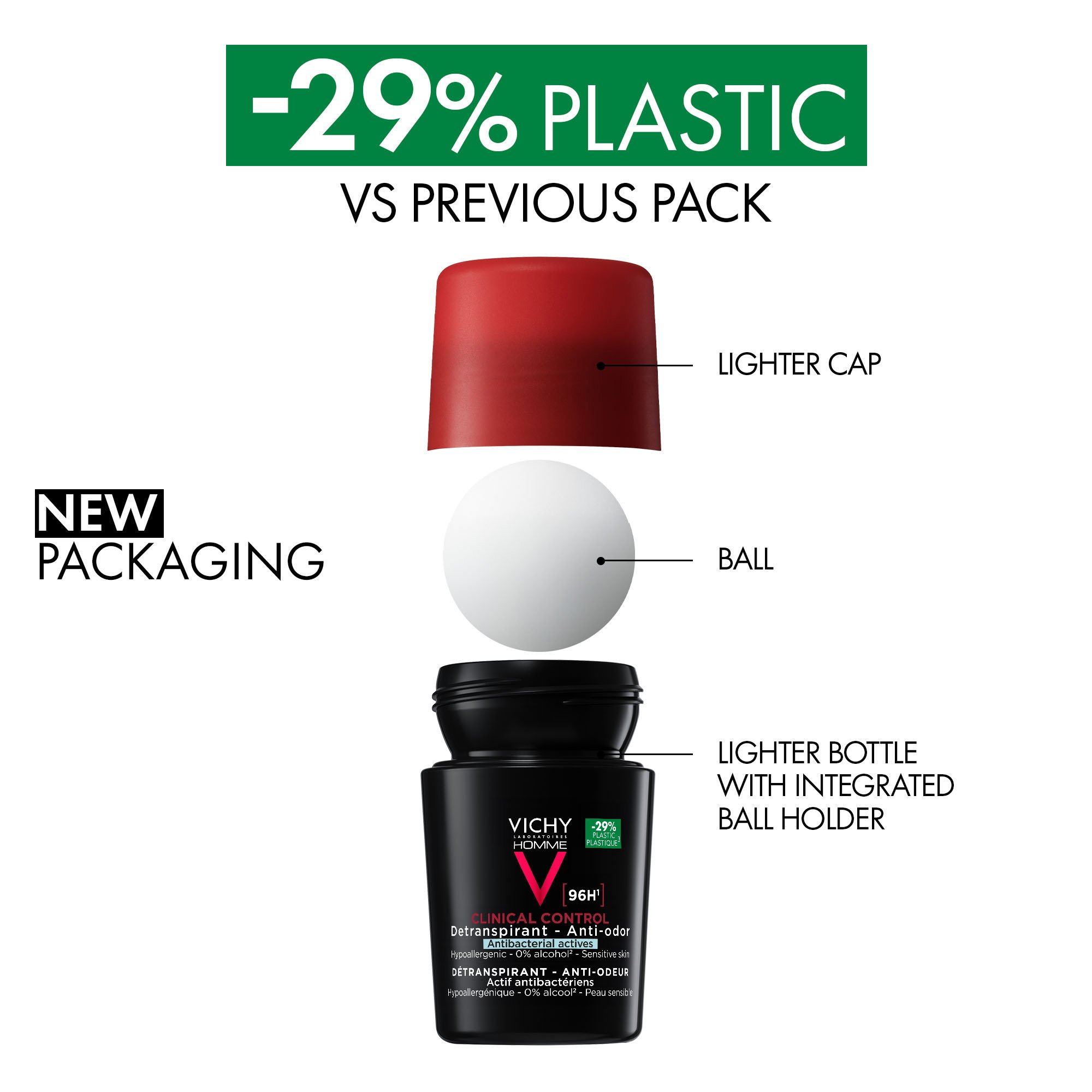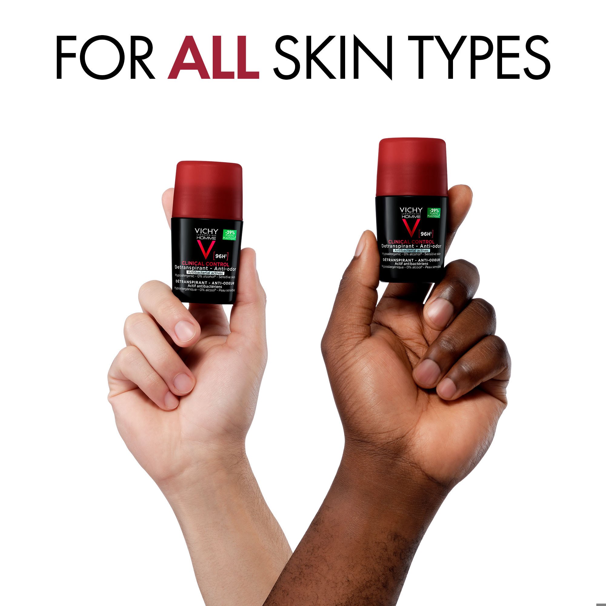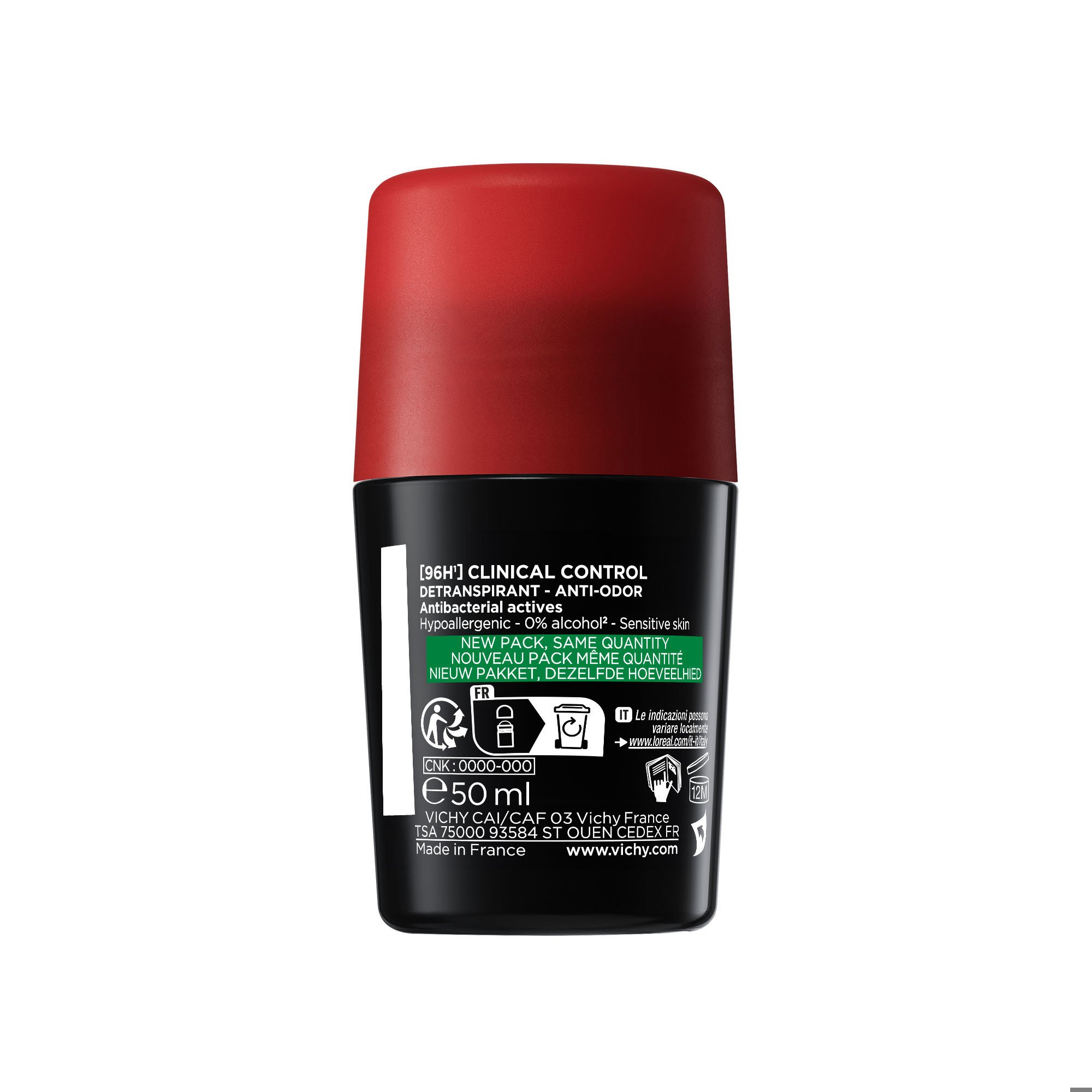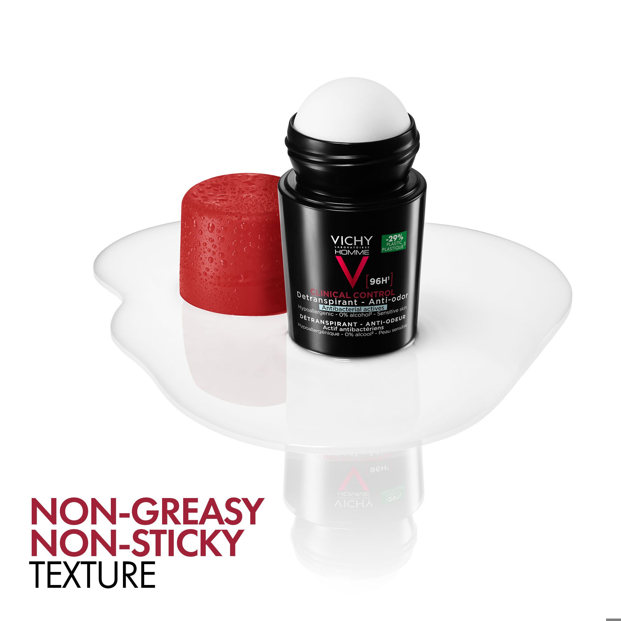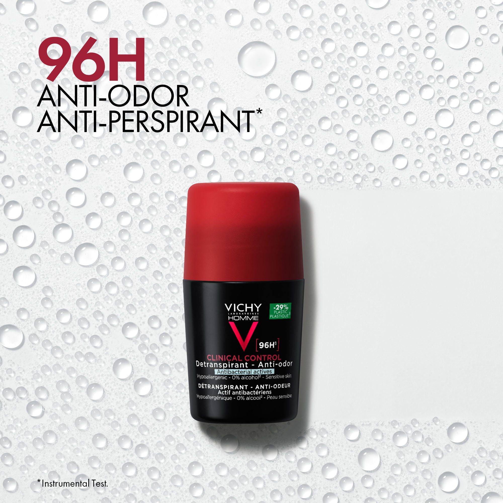 Vichy Homme Anti-Perspirant Clinical Control 96H er en svettekontrollerende antiperspirant med effekt i opptil 96 timer. Inneholder antibakteriell sink som eliminerer vond lukt samt perlite som absorberer fukt og lar huden puste. Antiperspiranten absorberes raskt uten å etterlate huden fet eller klissete. Antiperspiranten har en frisk duft med toppnoter av bergamot og rosmarin, hjertenotene er kardemomme og muskatnøtt, samt base av musk og sandeltre. Egner seg godt også til sensitiv hud.
