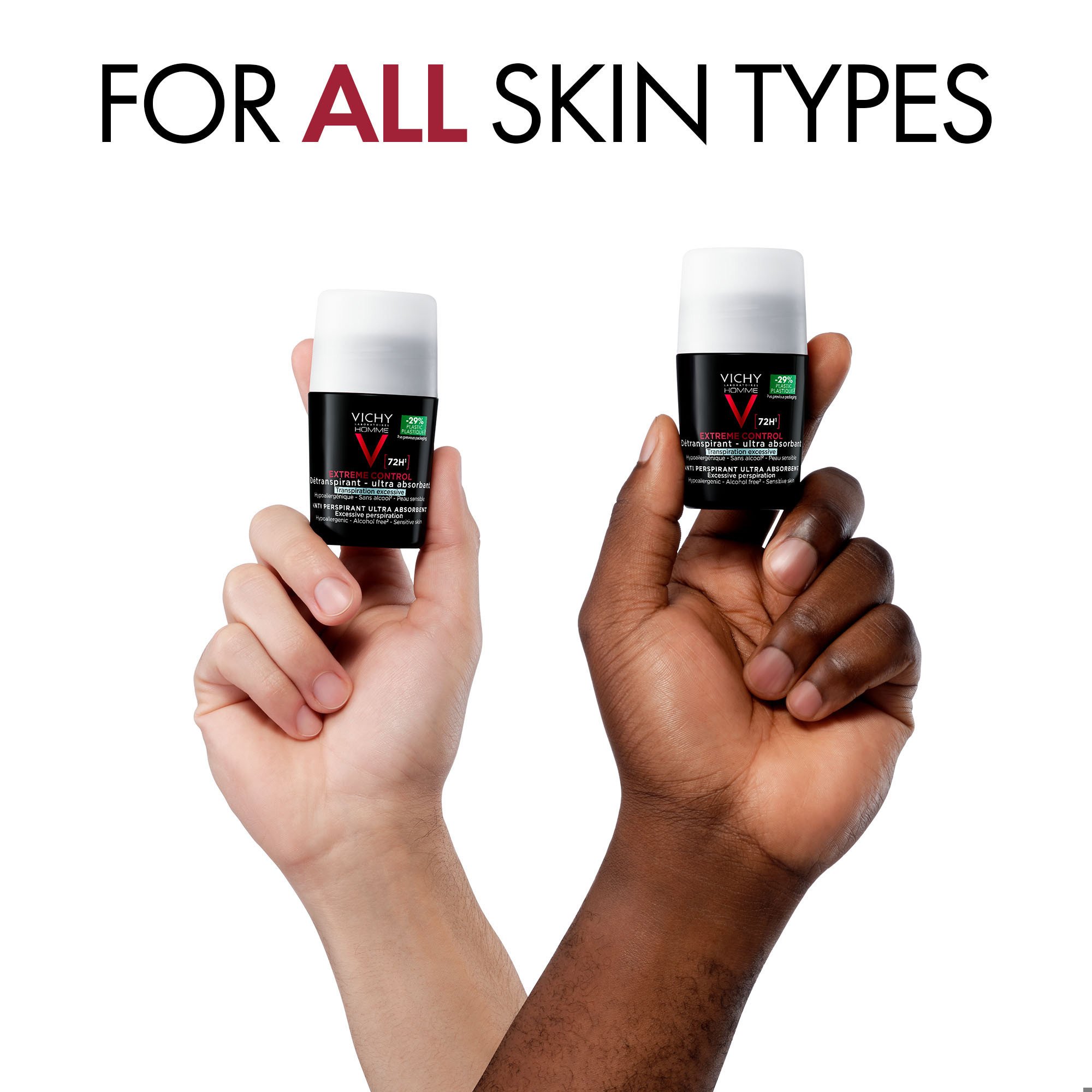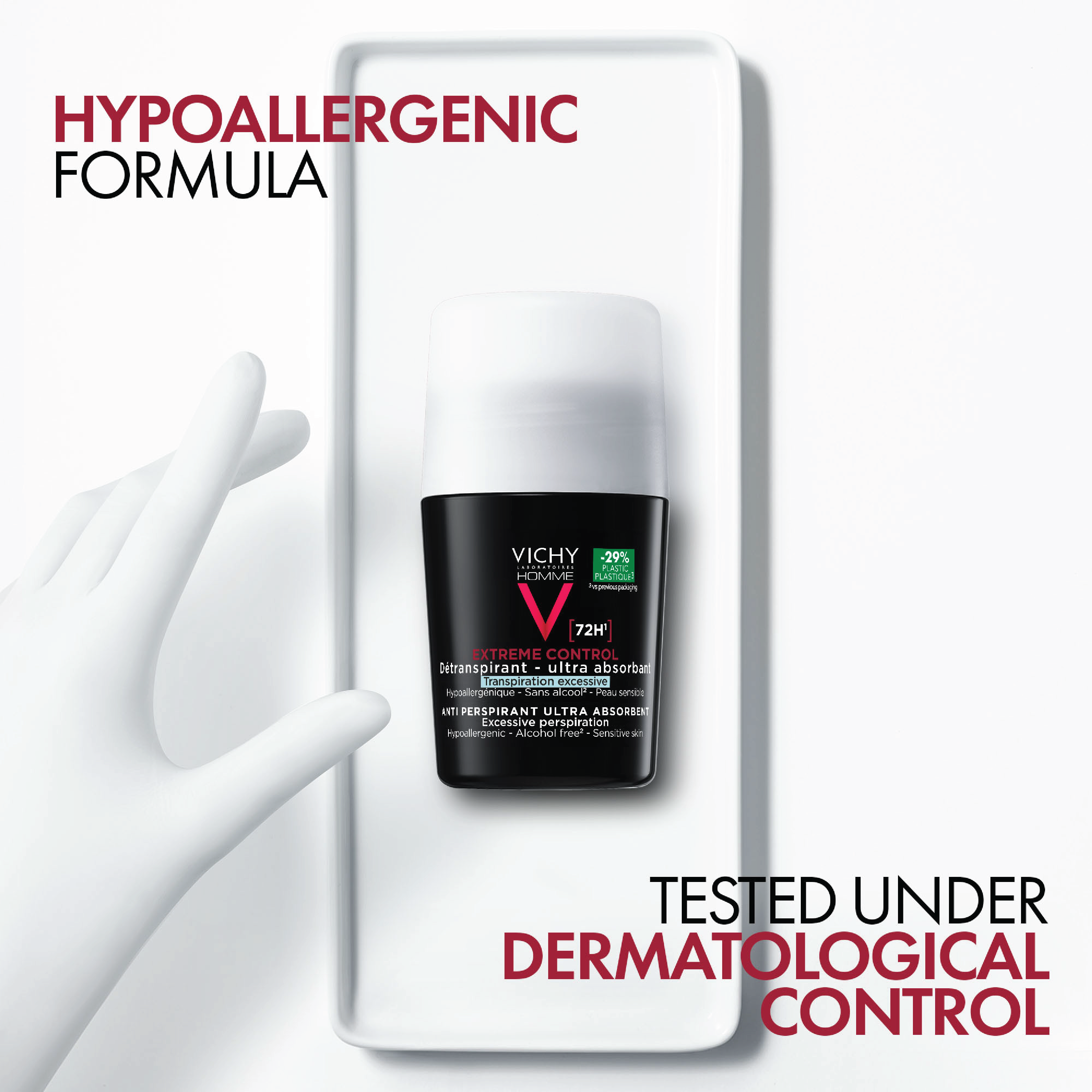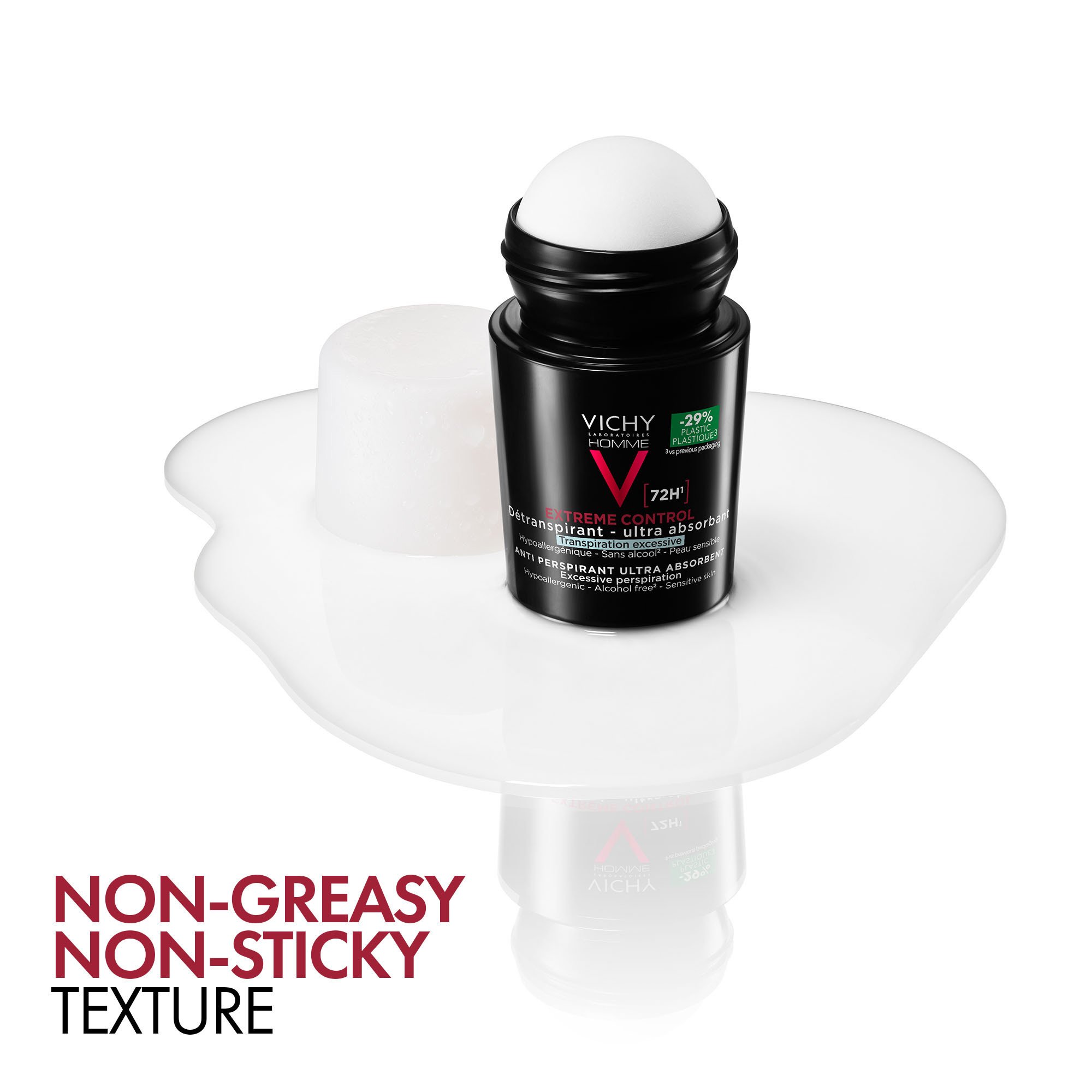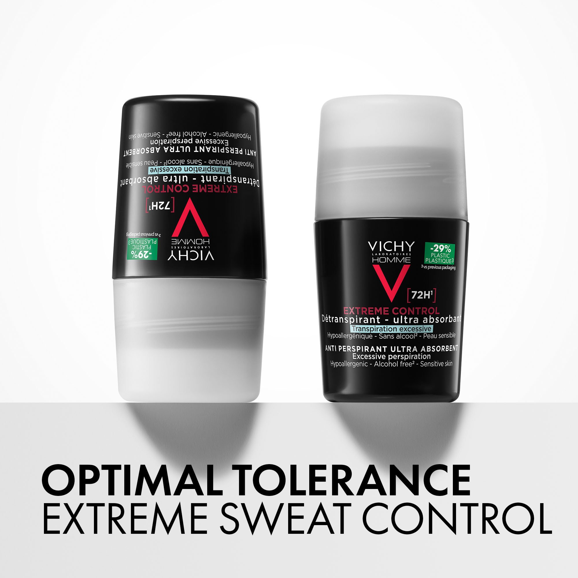 Vichy Homme Anti-Perspirant Extreme Control 72H inneholder antiperspirante ingredienser og ultra-absorberende mineraler er svettekontrollerende i opptil 72 timer. Antiperspiranten er også beriket med styrkende og beroligende termalsk kildevann fra Vichy. Vil kunne gi en langtidsvirkende følelse av friskhet og trekker raskt inn. Etterlater ingen hvite merker.