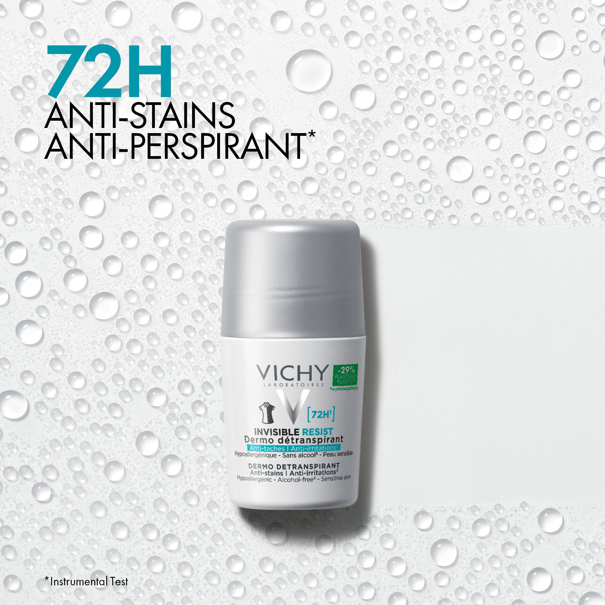 Vichy Invisible Protect 72H Anti-Stain Roll-On gir opptil 72 timers beskyttelse mot svette og lukt. Denne antiperspiranten motvirker gule flekker og hvite merker på klær, slik at tøyet ser rent ut lenger. Formelen lar huden puste og bidrar til å opprettholde hudbarrieren. Den beskytter også mot hudirritasjon, tørrhet og rødhet i armhulen. Roll-on-teksturen fordeles jevnt, absorberes raskt og føles tørr på huden etter påføring. Praktisk i hverdagen når du ønsker langvarig friskhet uten synlige merker. Passer både dame og herre, og kan brukes daglig. Med parfyme. Applikatoren gjør påføringen enkel og presis. Den absorberes raskt og lar huden puste. Samtidig bidrar formelen til å styrke hudbarrieren over tid. Effekten varer i opptil 72 timer, slik at du føler deg trygg gjennom dagen og natten, uten hvite merker på mørke klær eller gule flekker på lyse plagg.