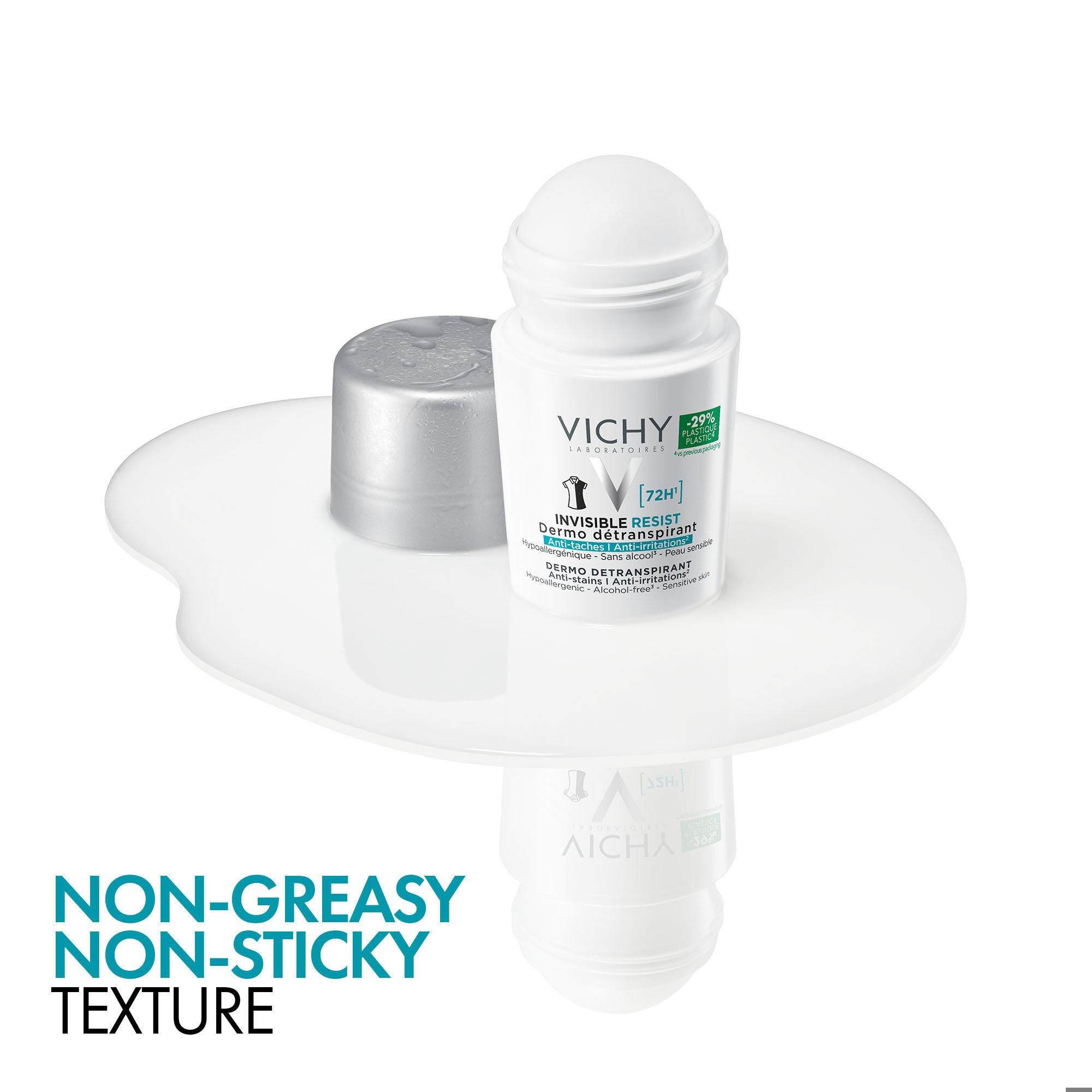 Vichy Invisible Protect 72H Anti-Stain Roll-On er en antiperspirant som gir opptil 72 timers beskyttelse mot svette og lukt, og motvirker gule flekker og hvite merker på tøy.