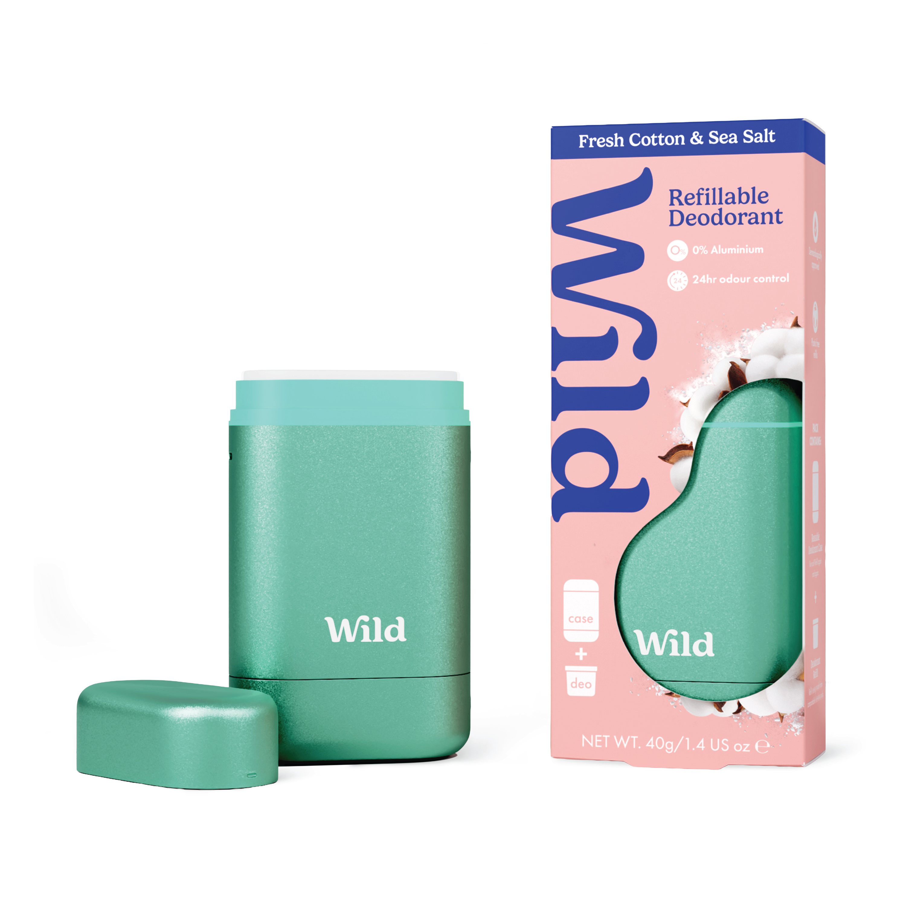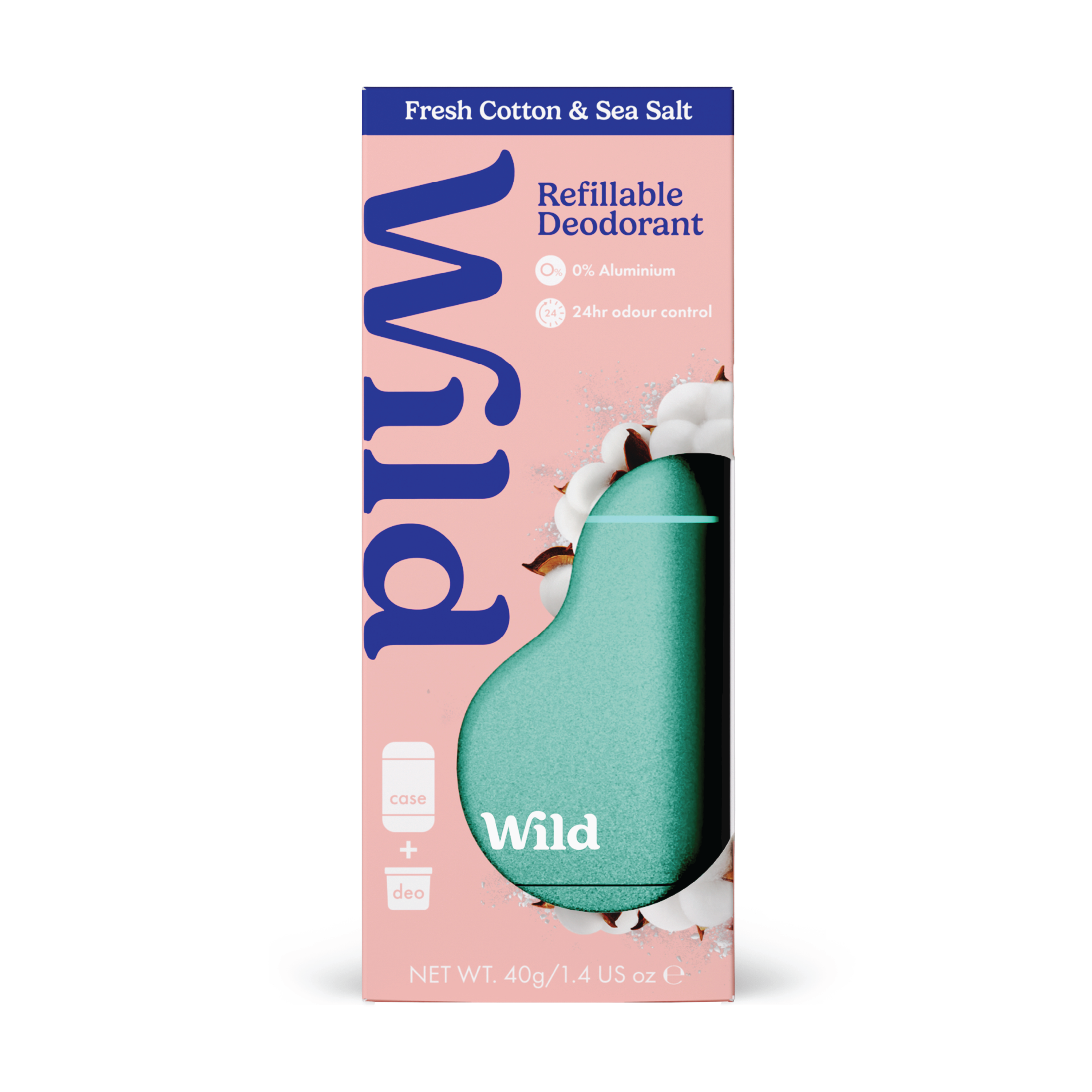 Wild Deo Cotton & Sea Salt Startpakke er en naturlig deodorant i en smart løsning der du beholder etuiet og fyller på med en 100 % komposterbar og plastfri refill når den er tom. Deodoranten inneholder pleiende og effektive ingredienser som gir 24-timers beskyttelse mot vond lukt. Wild hemmer ikke svetteproduksjonen, i stedet fokuserer den på å holde deg tørr og velluktende gjennom dagen. Deodoranten har en forfriskende duft inspirert av nyvasket tøy hengt ut til tørk i en kjølig, frisk sjøluft.
