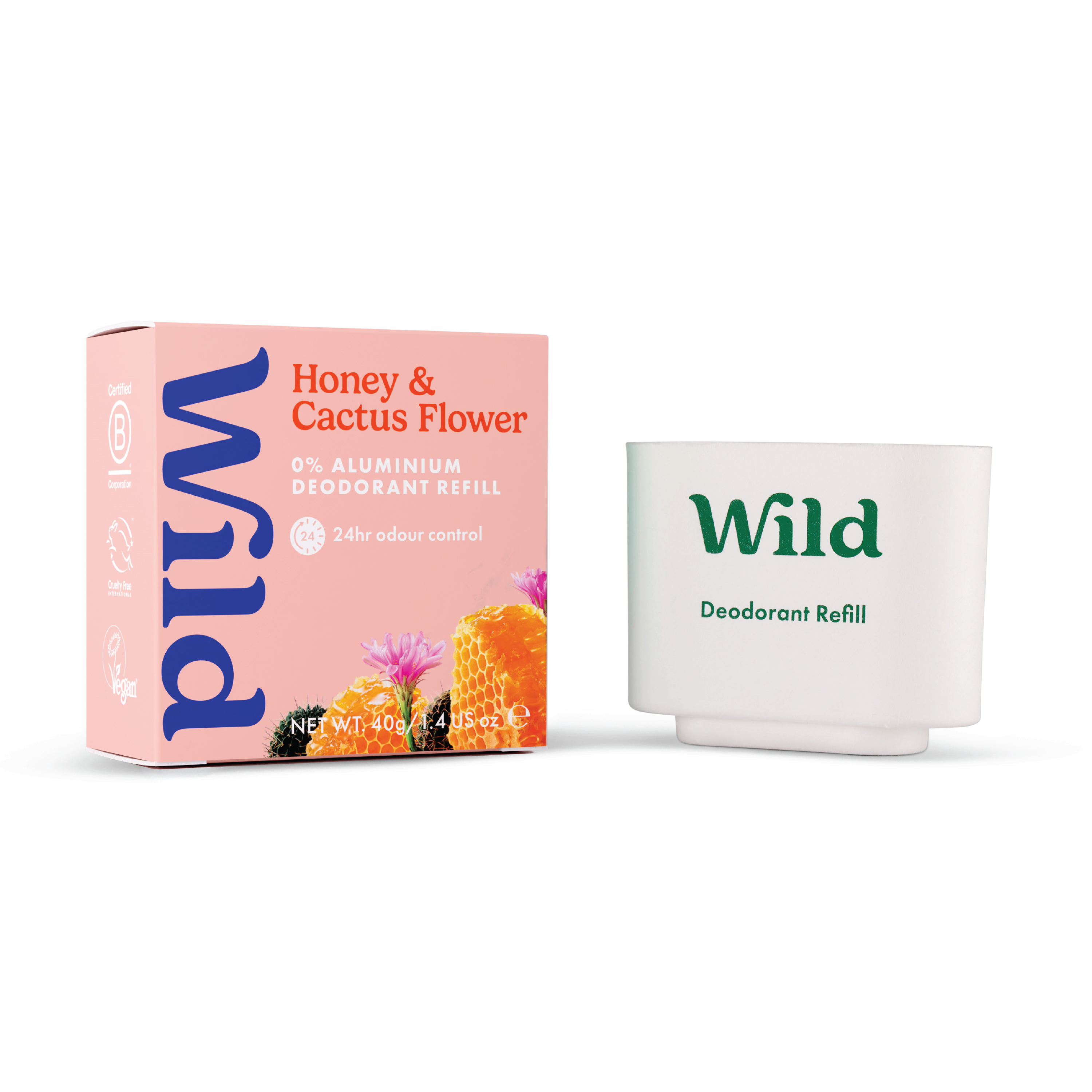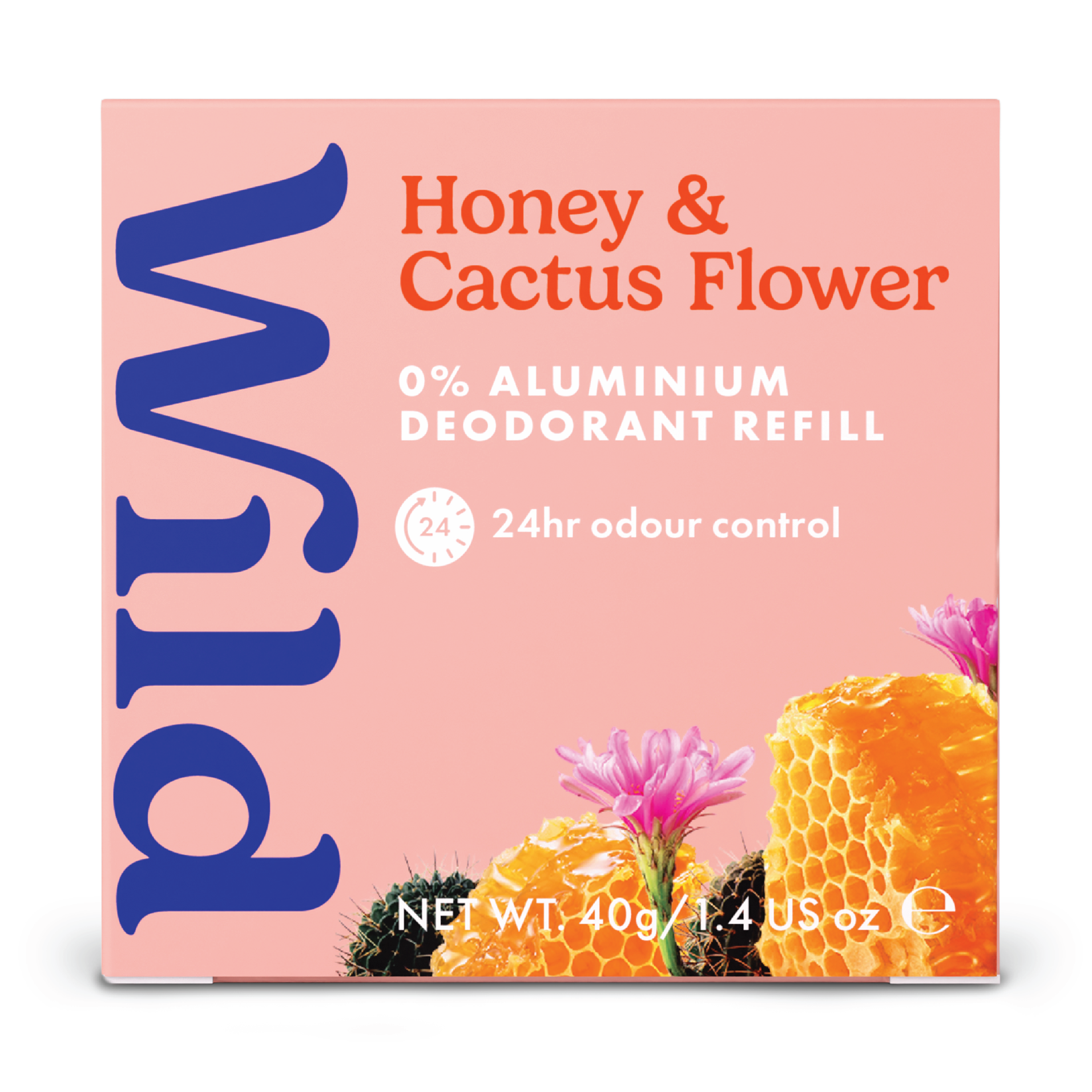 Wild Deo Honey & Cactus Flower Refill er en naturlig deodorant-refill som motvirker vond lukt i opptil 24 timer, med duft av honning og kaktusblomst.