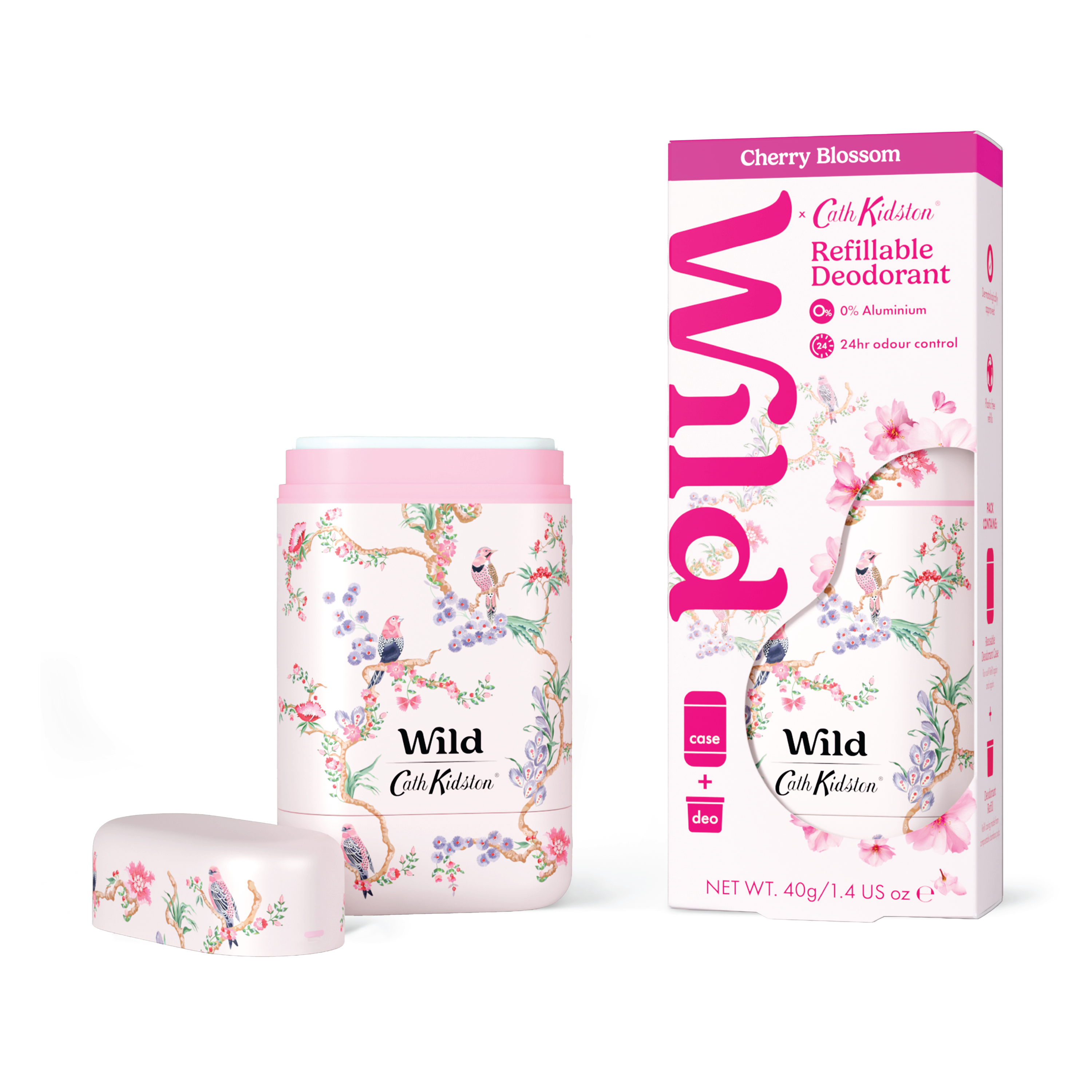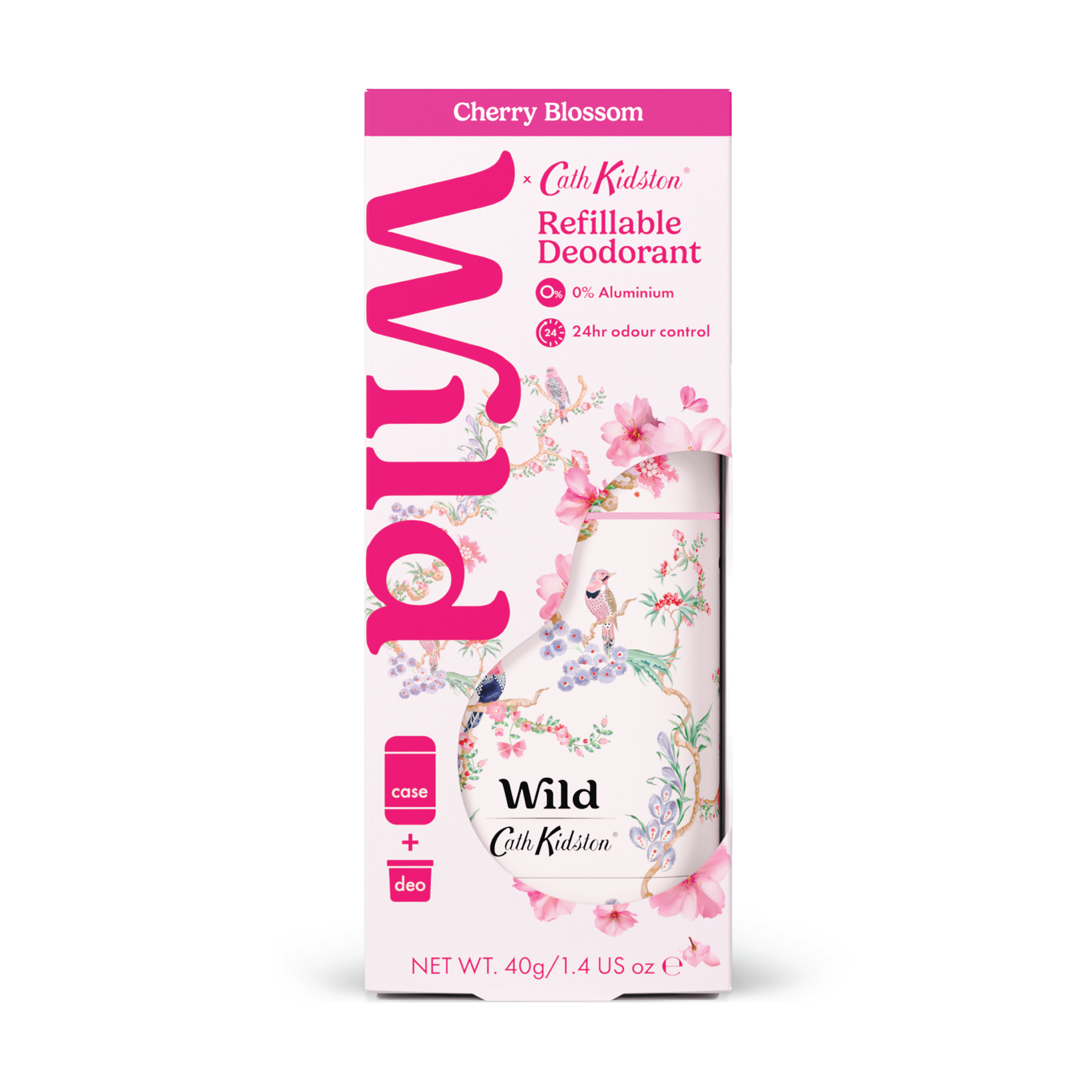 Wild Deo Stick Birds Berries Cherry Blossom Startpakke er en naturlig deodorant uten aluminium, med gjenbrukbart etui og refill, med duft av kirsebærblomst, mandel og vanilje.