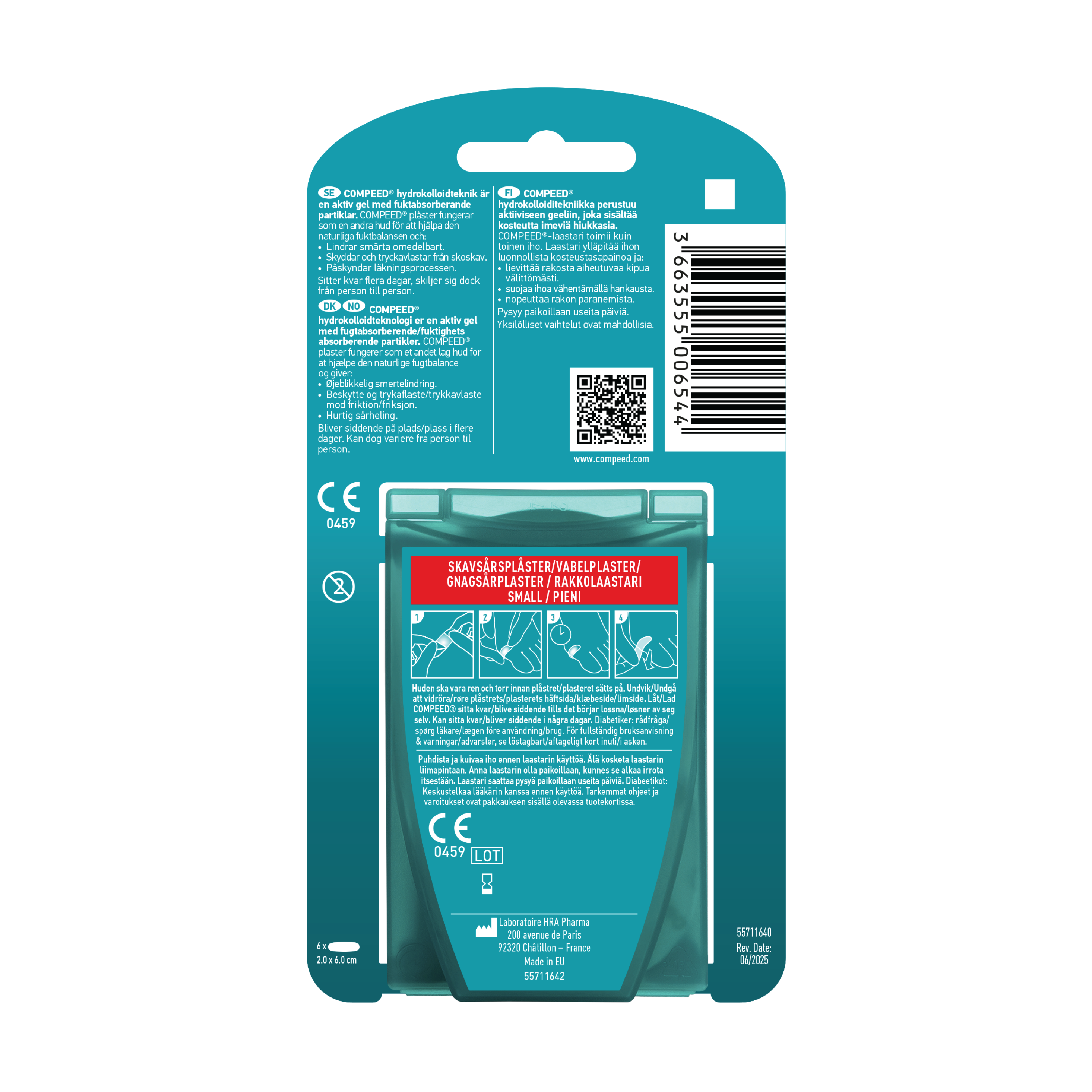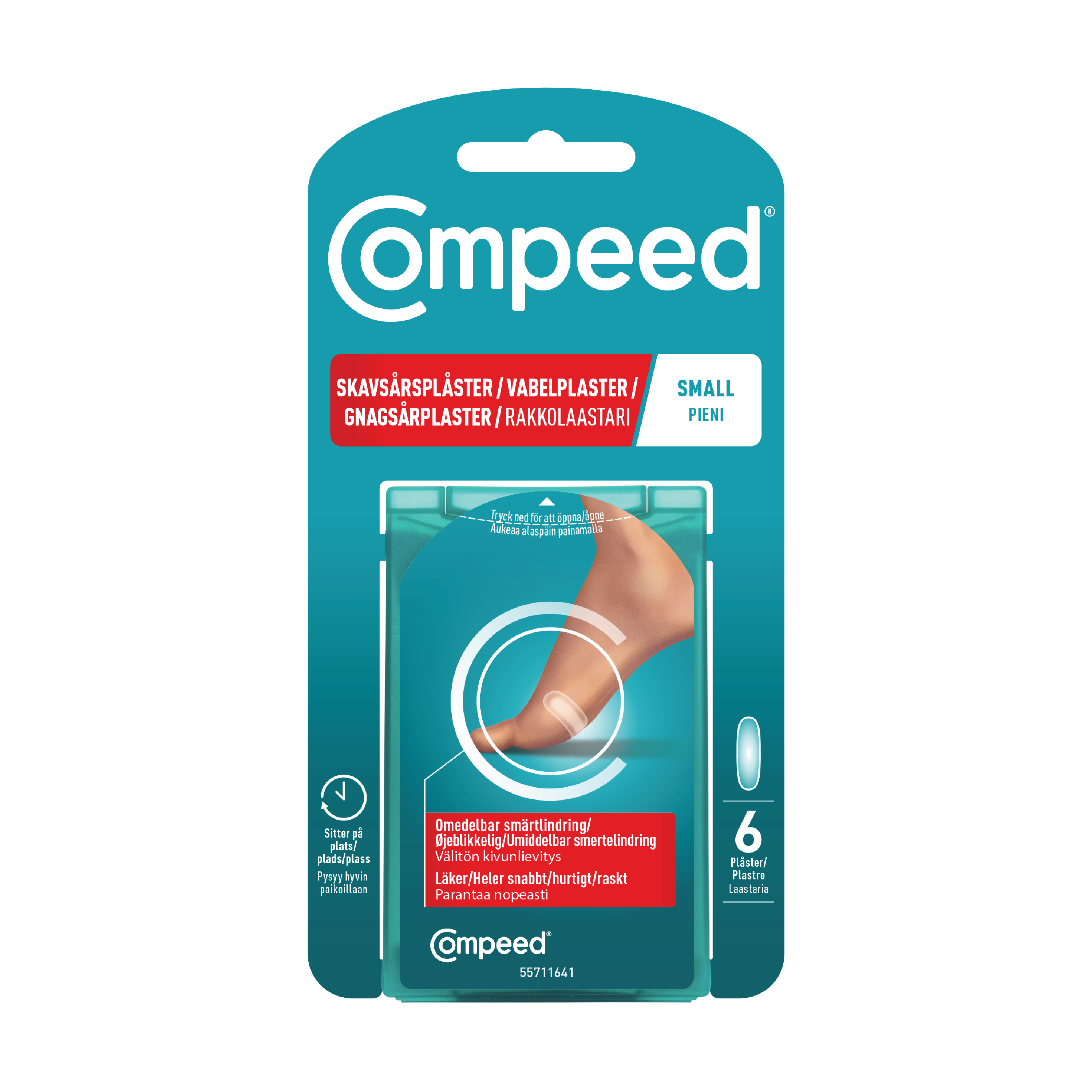 Compeed Gnagsårplaster Small fungerer som et ekstra hudlag som avlaster, reduserer smerten og beskytter mot vann, smuss og bakterier. Gnagsårplasteret er effektivt i alle faser av blemmer, men jo tidligere du påfører plasteret, desto raskere leges blemmen. Plasteret er formtilpasset med selvklebende avsmalnende kanter som følger med bevegelsene dine når du beveger deg, slik at gnagsåret ikke trenger å ødelegge dagen. Compeed gnagsårplaster skaper et fuktig sårmiljø som gir best mulig forutsetning for leging av gnagsåret, slik at det får en raskere og naturlig helbredelse.