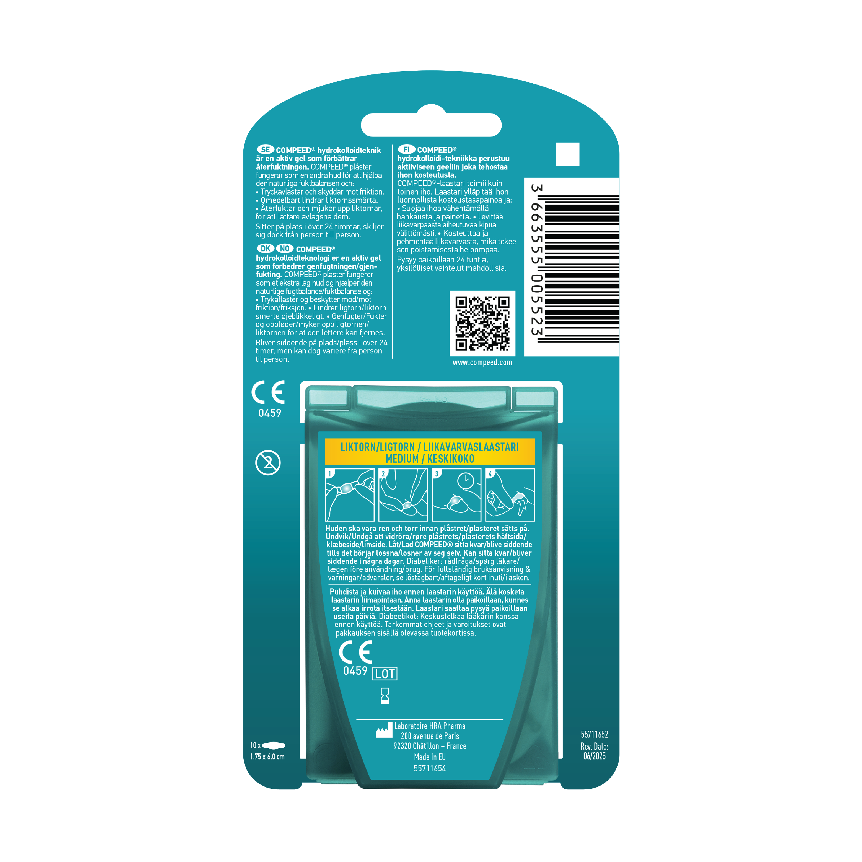 Compeed Liktornplaster Medium kan brukes både til behandling og forebygging av liktorn. Plasteret inneholder den aktive, patenterte ingrediensen hydrokolloidgelé-teknologi som lindrer smerte umiddelbar.t Plasterets kontinuerlig fuktighetsgivende funksjon bidrar til å gjøre huden mykere, slik at liktornen raskere kan fjernes. Plasteret er utviklet for å kunne sitte på i flere dager, det gir også optimal demping mot friksjon og trykk.