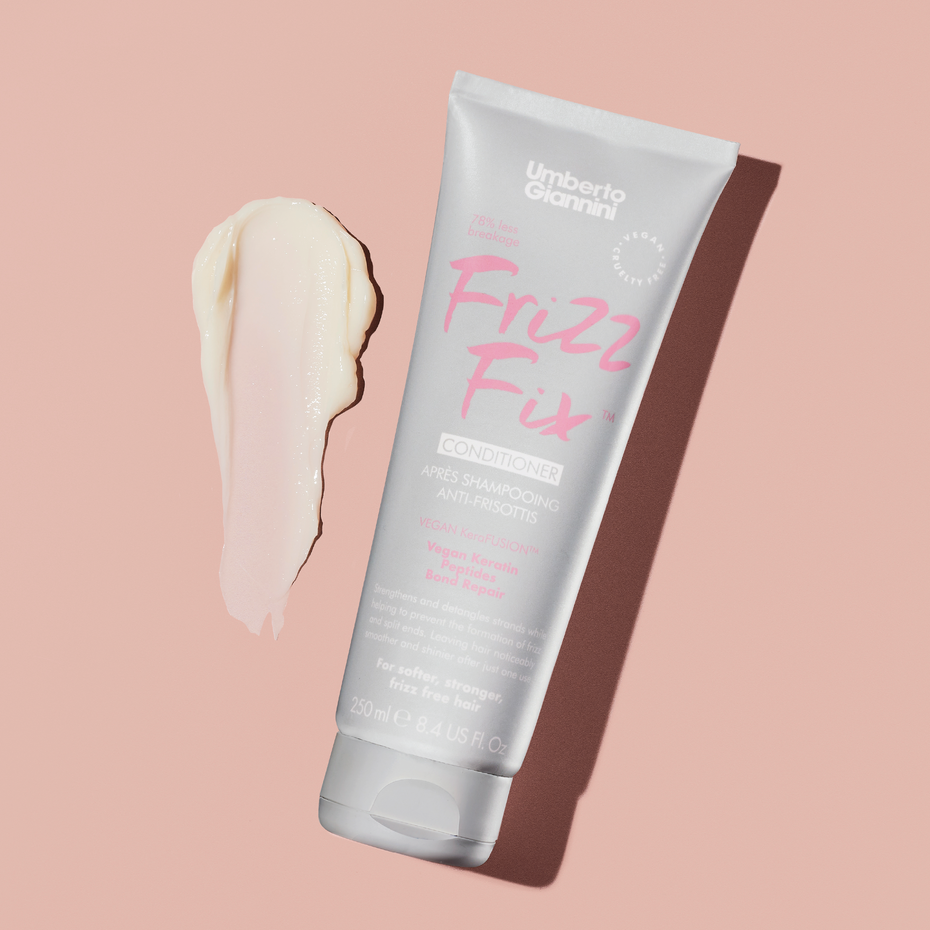 Umberto Giannini Frizz Fix Conditioner gir rikelig med pleie og næring til håret uten å tynge. Balsamen inneholder peptider, kokosolje og vitamin E som nærer håret og bidrar til å forsegle fukt for å gi et mykere og mer glansfullt hår. Den plantebaserte keratinteknologien KeraFushion, utviklet med et biprodukt av melketistel, bidrar til å styrke hårstrukturen og reparere svekkede bindinger i håret. Peptider trenger inn i håret og bidrar til å reparere skader fra innsiden, som forbedrer hårets elastisitet og glans, samt reduserer frizz.