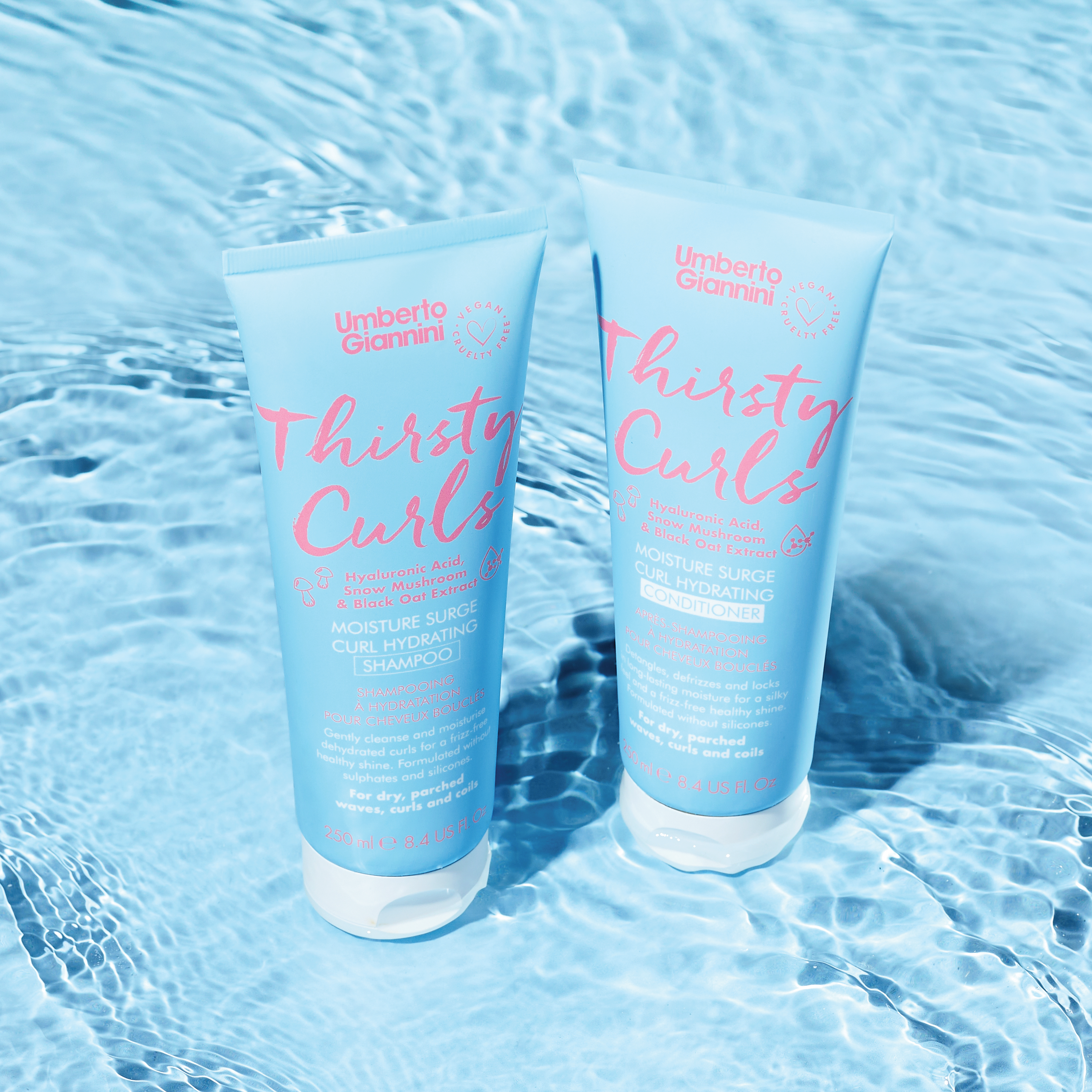 Umberto Giannini Thirsty Curls Conditioner har en unik trippel-hydrerende formel med hyaluronsyre, snøsopp og svarthavre-ekstrakt som forsegler fuktigheten i håret og demper frizz. Håret får langvarig fuktighet uten at det tynges. Balsamen pleier dehydrerte krøller, og bidrar til et mer håndterbart og silkemykt hår med mindre frizz og økt glans. Med en mild duft av sitrus, bergamott og musk.