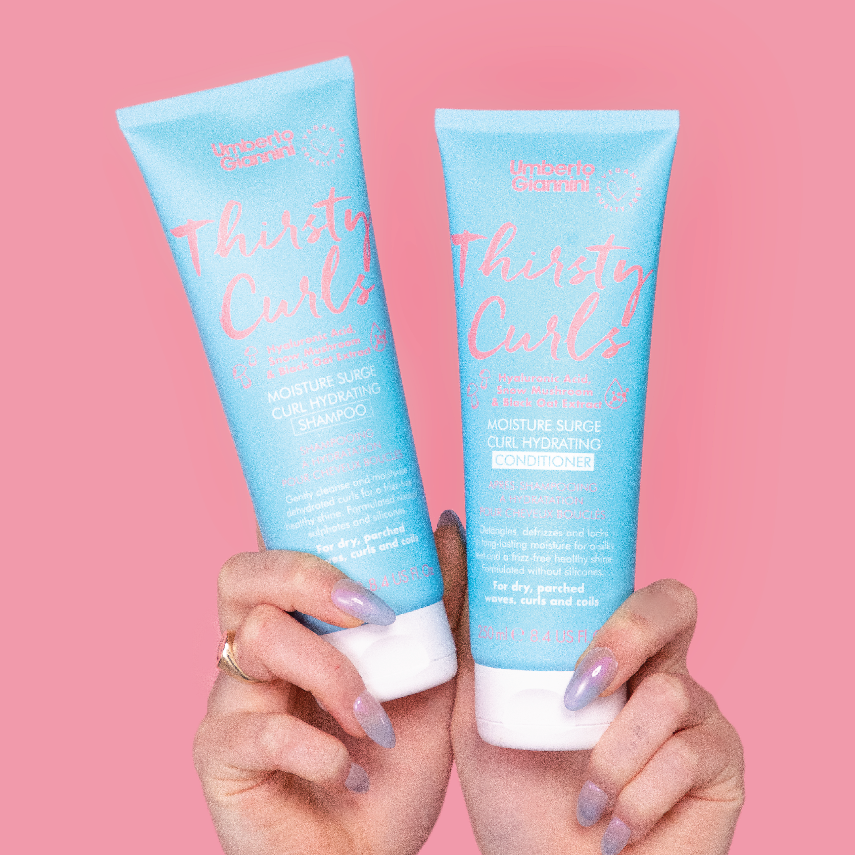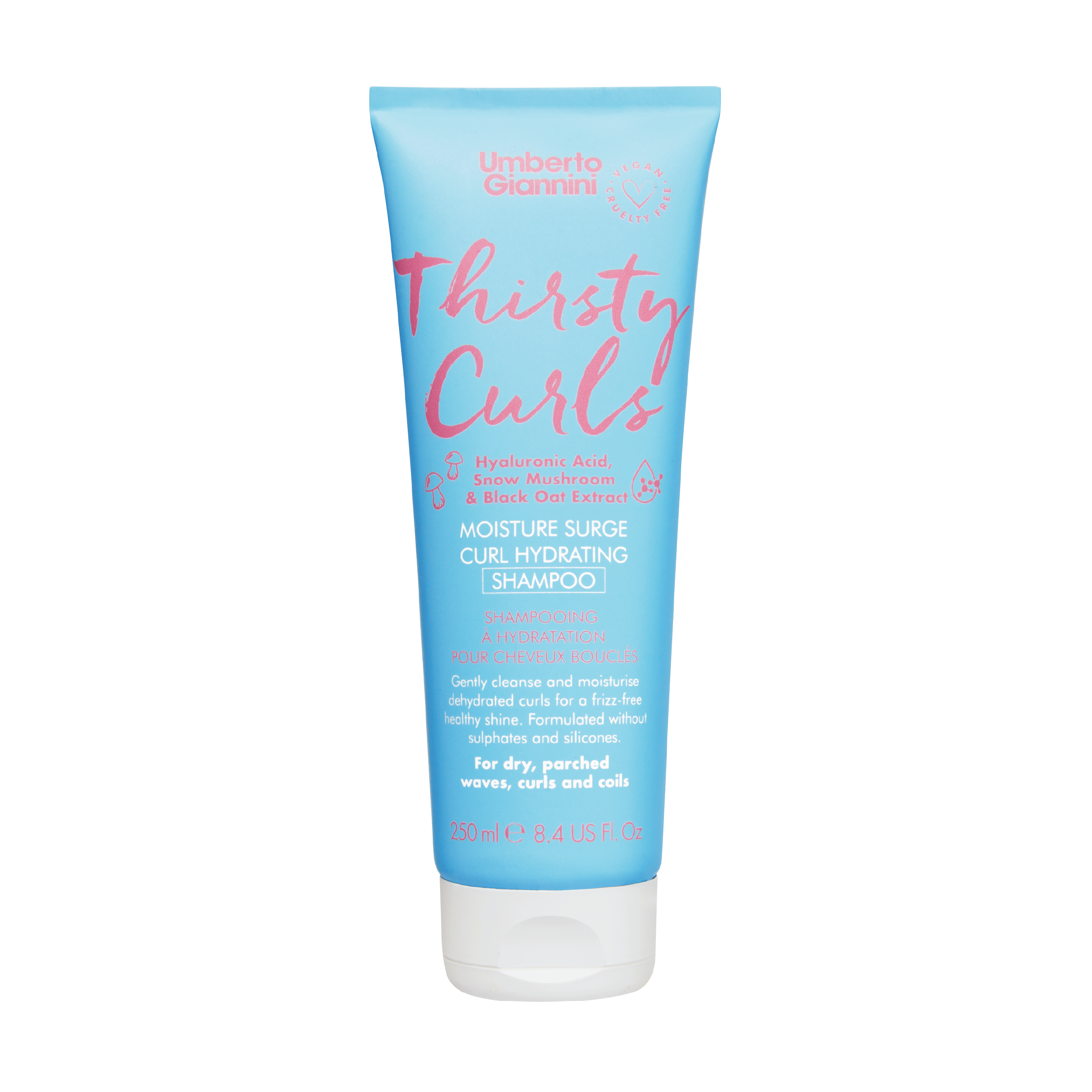 Umberto Giannini Thirsty Curls Shampoo har en unik trippel-hydrerende formel med hyaluronsyre, snøsopp og svarthavre-ekstrakt som forsegler fuktigheten i håret og demper frizz. Håret oppnår langvarig fuktighet uten at det tynges. Sjampoen renser godt både hår og hodebunn, og gjør håret mer håndterbar og glansfullt uten frizz. Med en mild duft av sitrus, bergamott og musk.