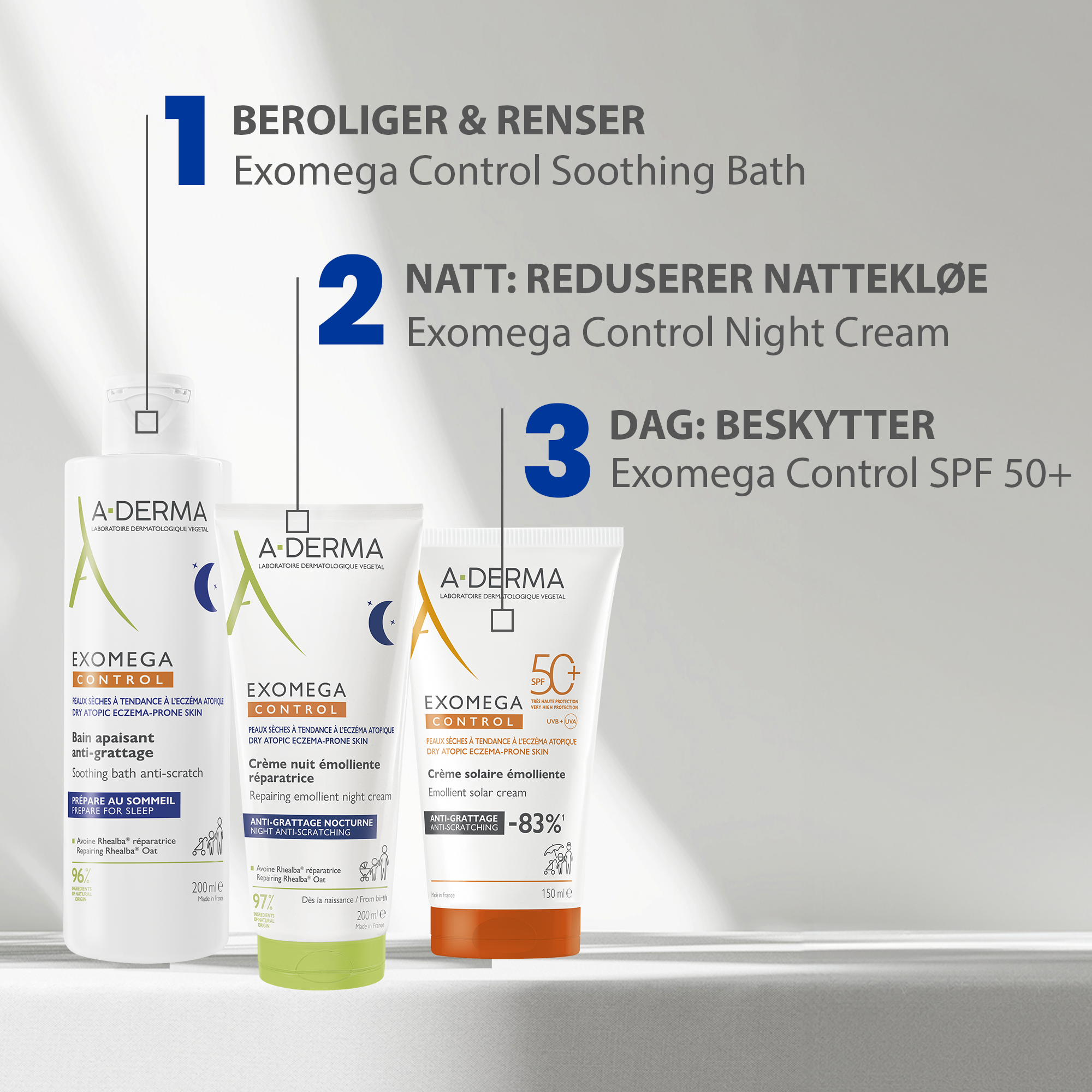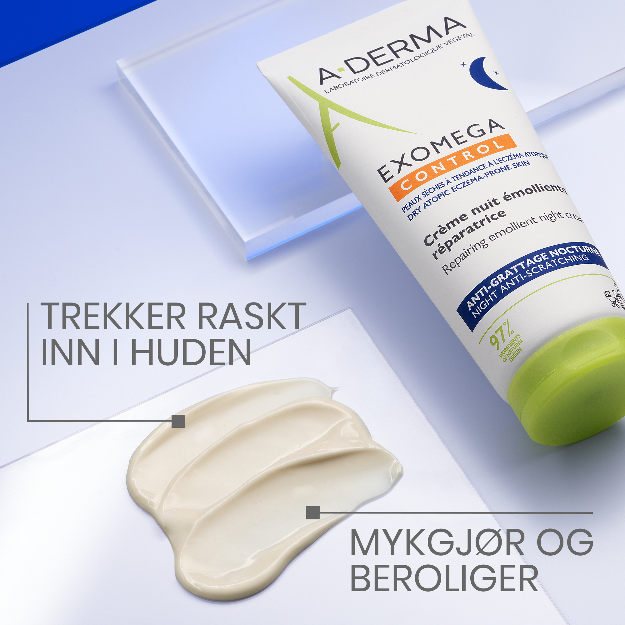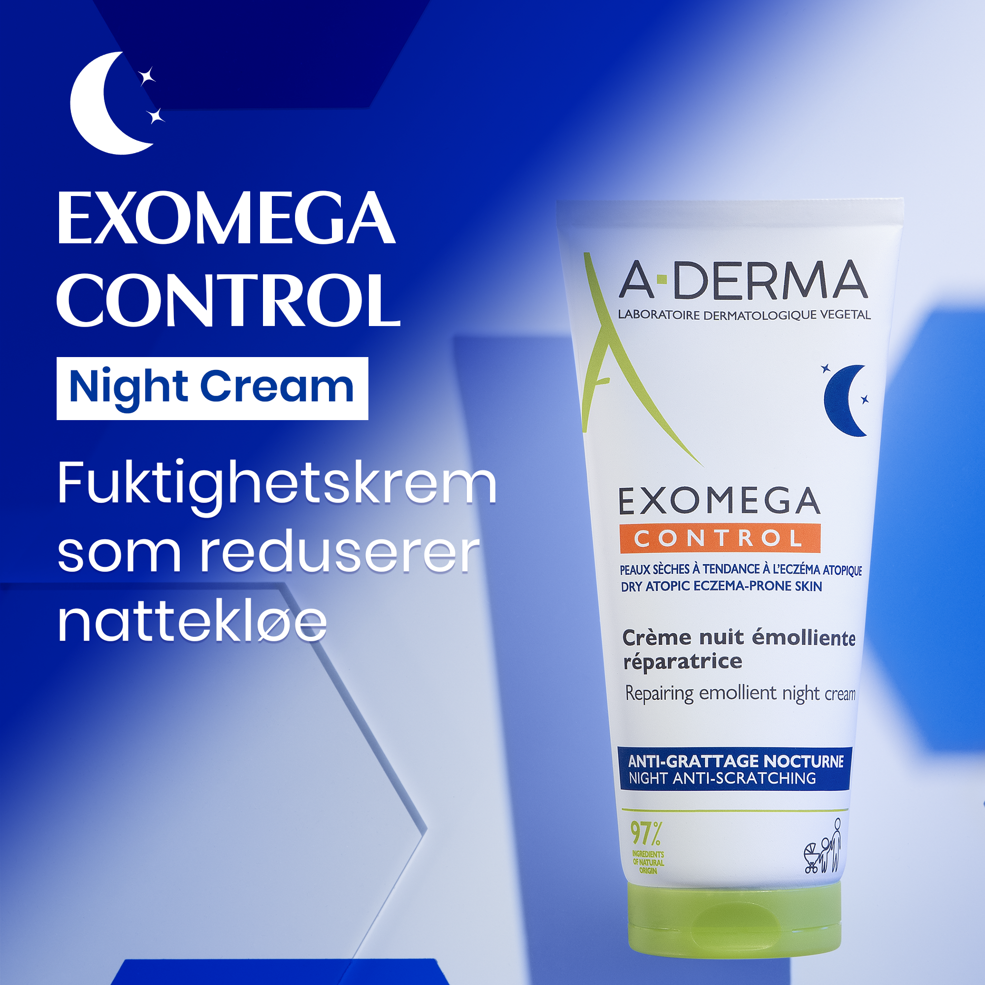 A-Derma Exomega Control Night Cream virker beroligende og nærende på huden, og trekker raskt inn uten å føles klissete. Kremen inneholder Rhealba® havrekimekstrakt og Helichrysum®, som bidrar til å redusere kløe og beroliger huden, slik at antall oppvåkninger grunnet kløe reduseres. Kan brukes både på kropp og ansikt.