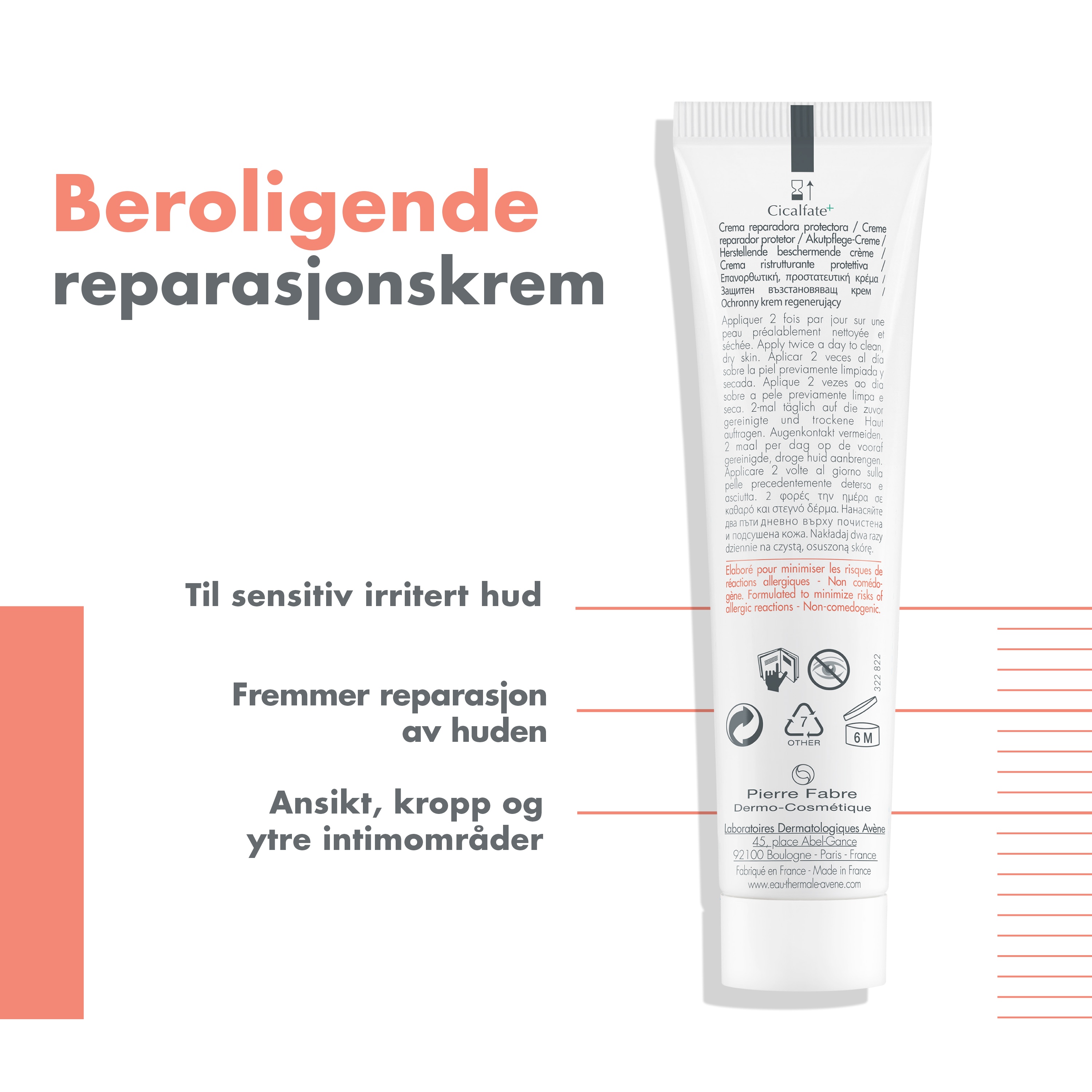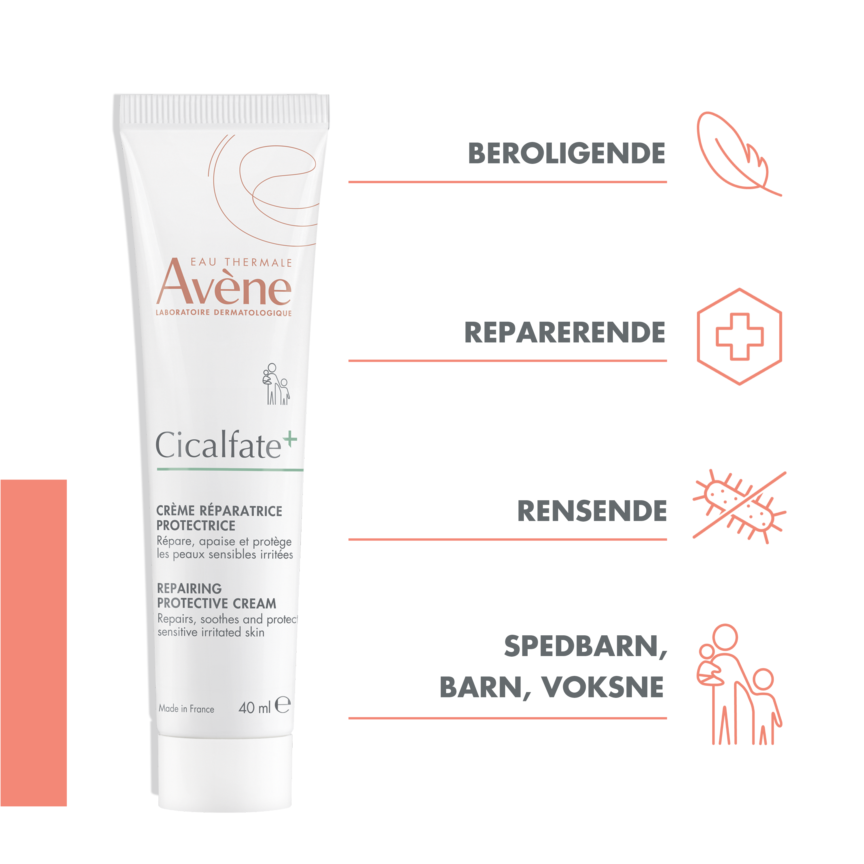 Avenè Cicalfate Cream er en reparerende krem til bruk på røde og irriterte områder i ansiktet og på kroppen. Kremen kan brukes på tørr, sprukken og solbrent hud, i tillegg til å kunne brukes på arr og andre irriterte hudområder. Kremen forebygger også sekundærinfeksjoner forårsaket av sopp og bakterier, og kjennes beroligende, mykgjørende og beskyttende. Kremen har en lett og behagelig konsistens som er enkel å smøre ut.