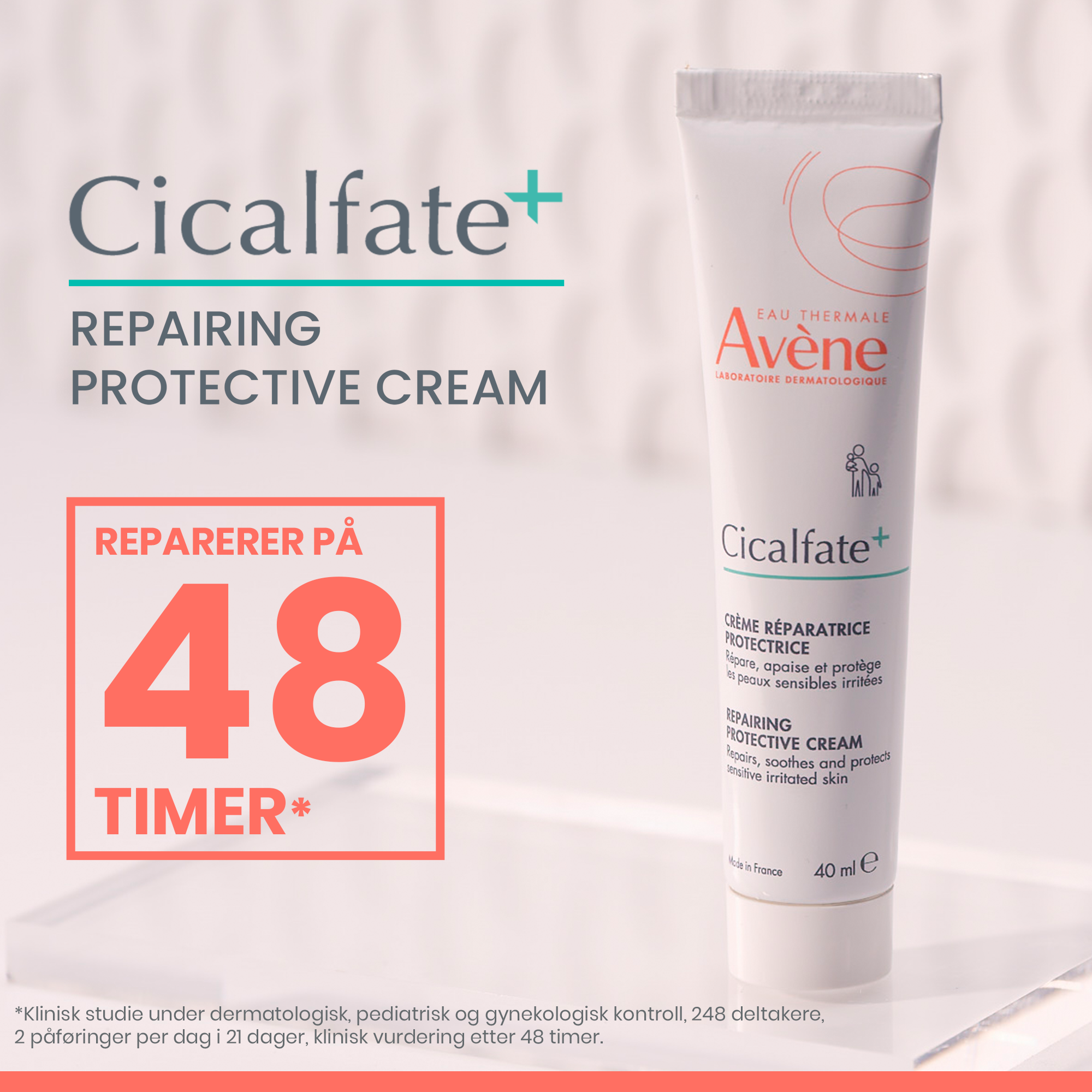 Avenè Cicalfate Cream er en reparerende krem til bruk på røde og irriterte områder i ansiktet og på kroppen. Kremen kan brukes på tørr, sprukken og solbrent hud, i tillegg til å kunne brukes på arr og andre irriterte hudområder. Kremen forebygger også sekundærinfeksjoner forårsaket av sopp og bakterier, og kjennes beroligende, mykgjørende og beskyttende. Kremen har en lett og behagelig konsistens som er enkel å smøre ut.