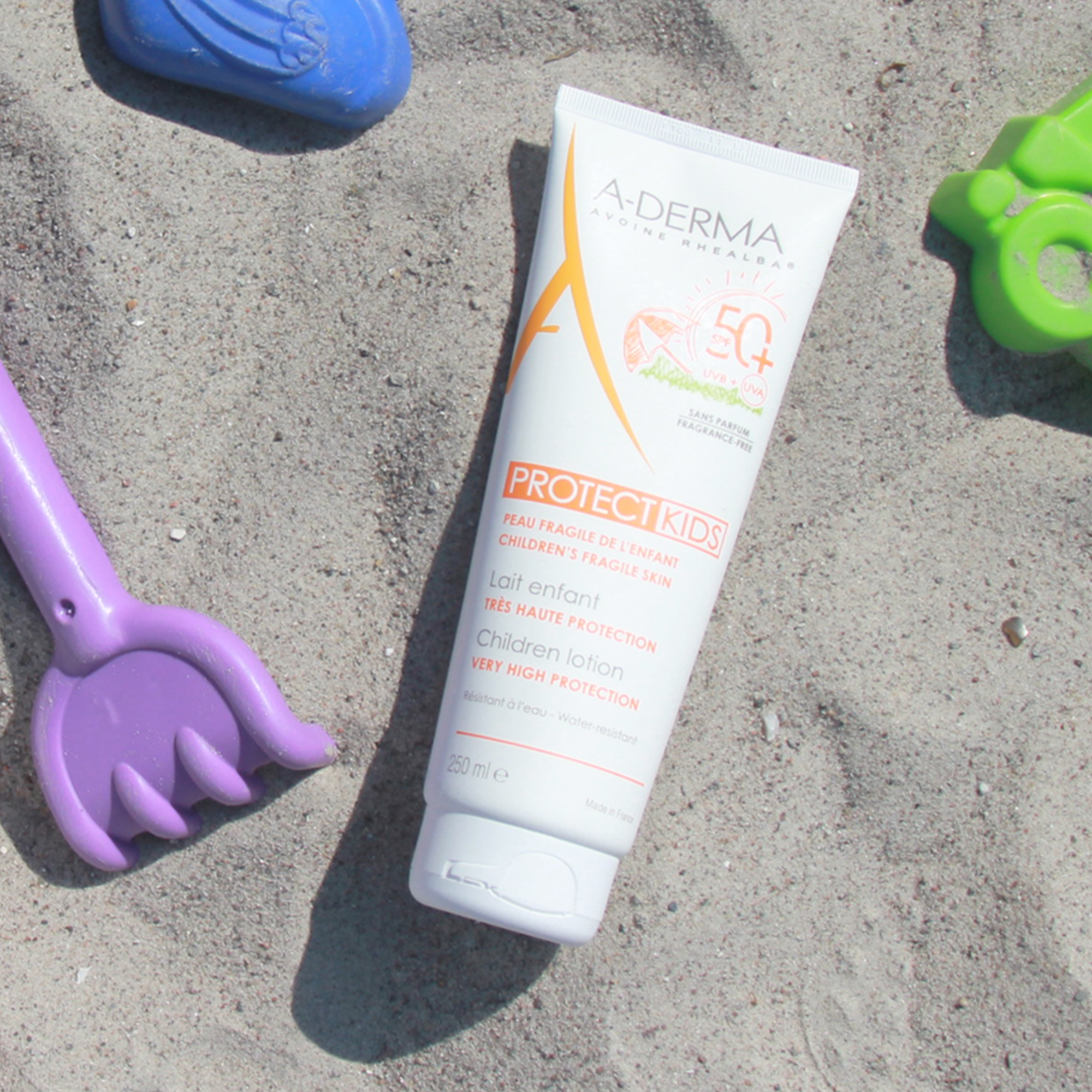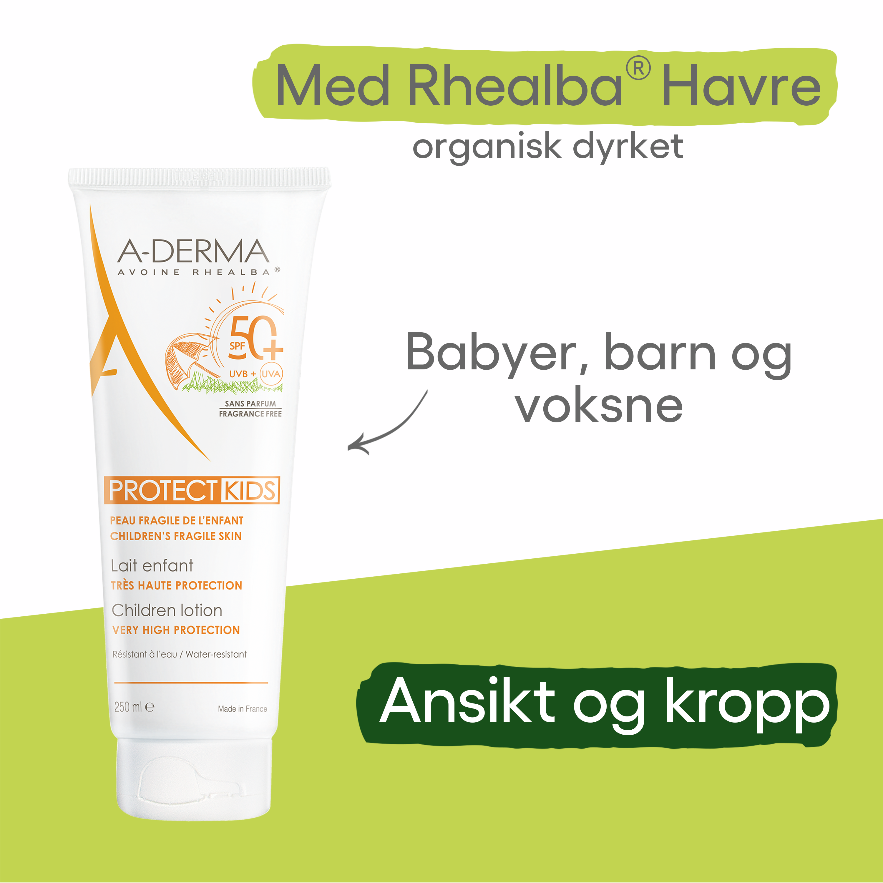 A-Derma Protect Kids Lotion er en solkrem til barn med solfaktor 50+, som gir meget høy solbeskyttelse til sart barnehud.