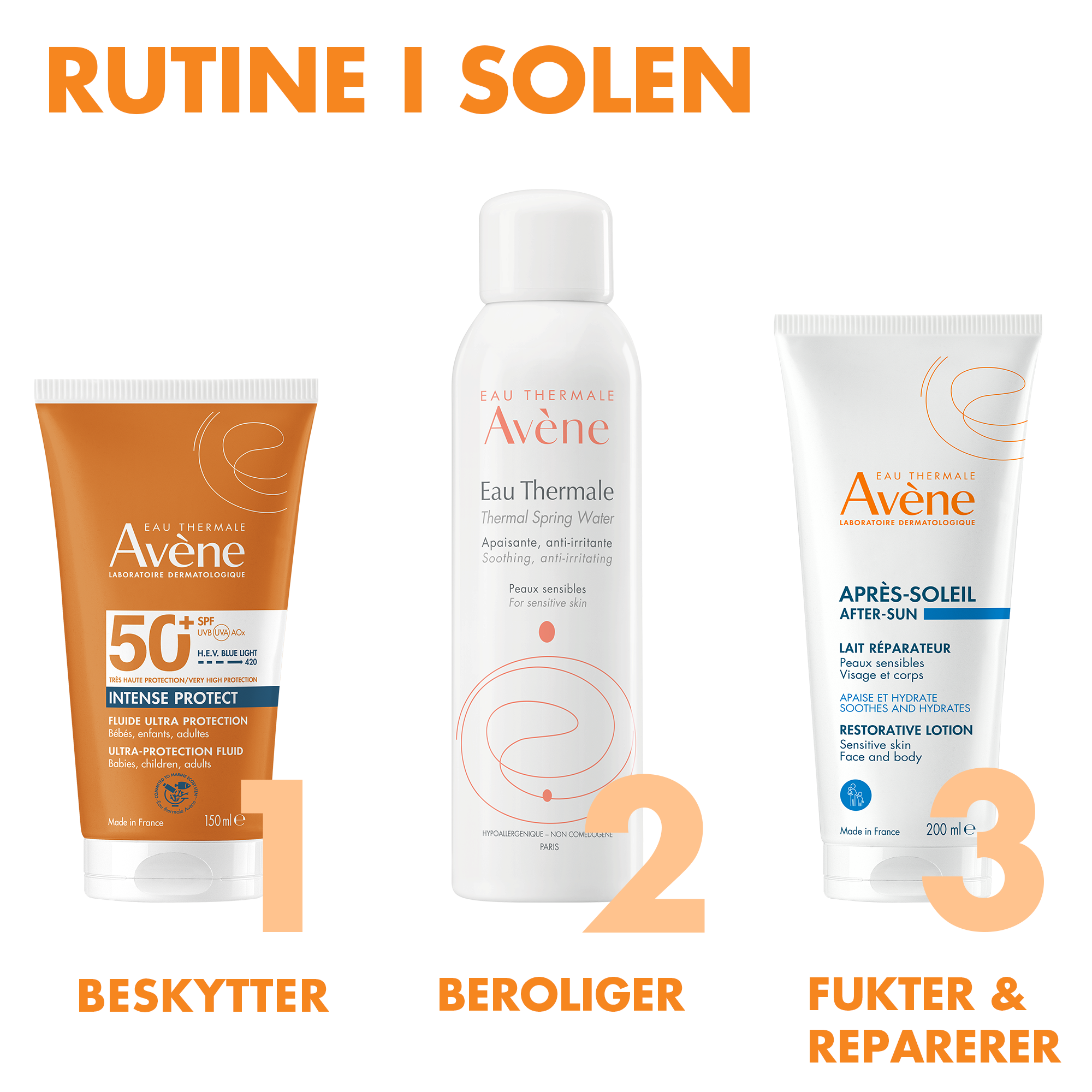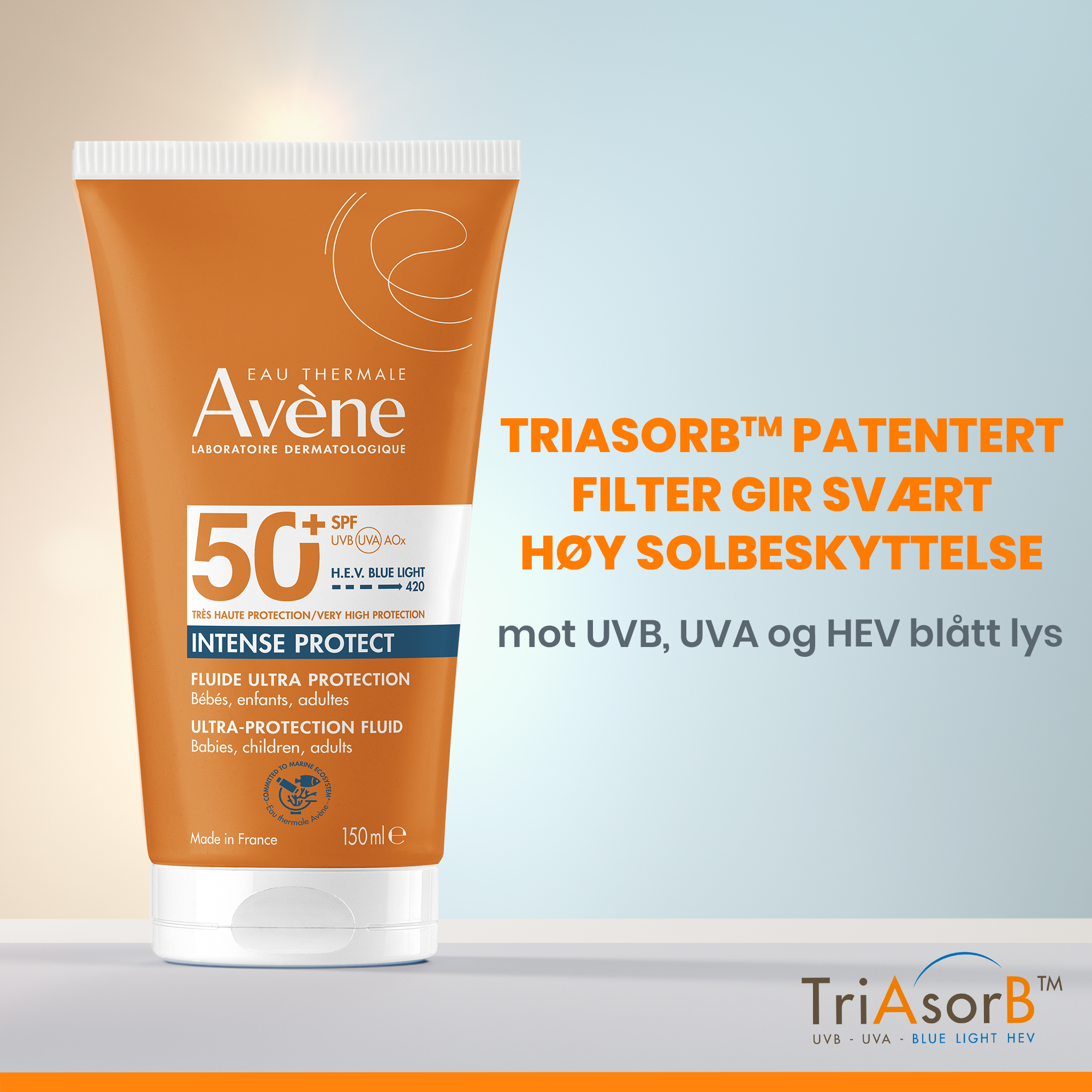 Avène Sun Intense Protect SPF50+ er en solkrem med et nytt patentert solfilterkompleks med kun 4 solfiltre; TriAsorB™, Tinosorb S™, Uvinul A+ og Uvinul T150. Solfiltrene sikrer optimal beskyttelse mot UVA, UVB, høyenergi blått lys og synlig lys. Solkremen har en ultralett konsistens og trekker raskt inn i huden. Solkremen er velegnet for både ansikt og kropp, motvirker uttørring, er svetteresistent og ekstra vannresistent.