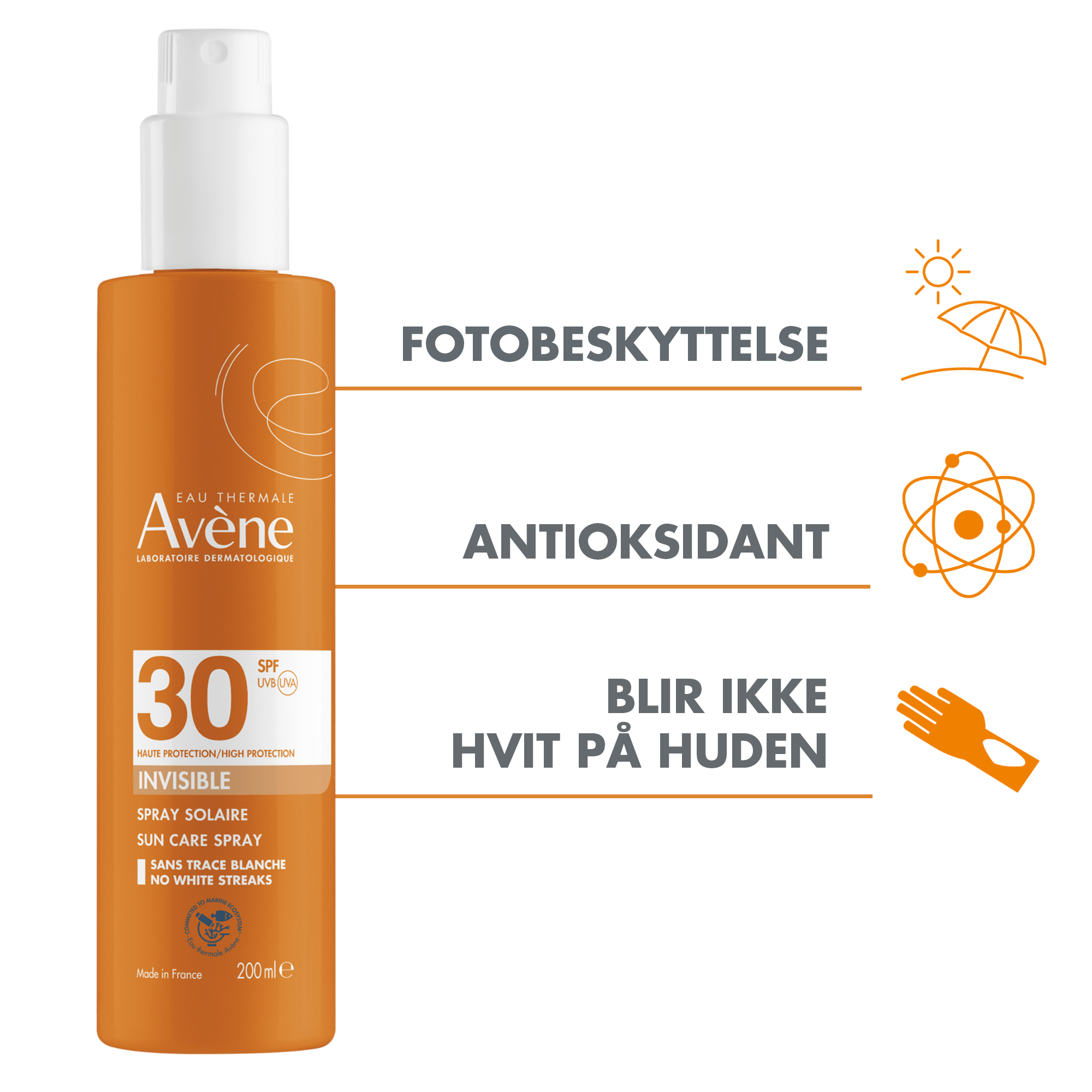 Avène Sun Spray SPF30 er formulert med Avènes SunSitive®-kompleks som er et unikt fotobeskyttelsessystem med et minimum av filtre, langvarig stabilitet og effektivitet som gir høy beskyttelse mot UVA- og UVB-stråler. Solkremen virker ikke fet eller klebrig, trekker raskt inn og etterlater ingen white cast på huden. Solsprayen inneholder antioksidanten Pre-Tocopheryl som beskytter mot frie radikaler, og et høyt innhold av Avène Termalkildevann som har beroligende og anti-irriterende egenskaper.