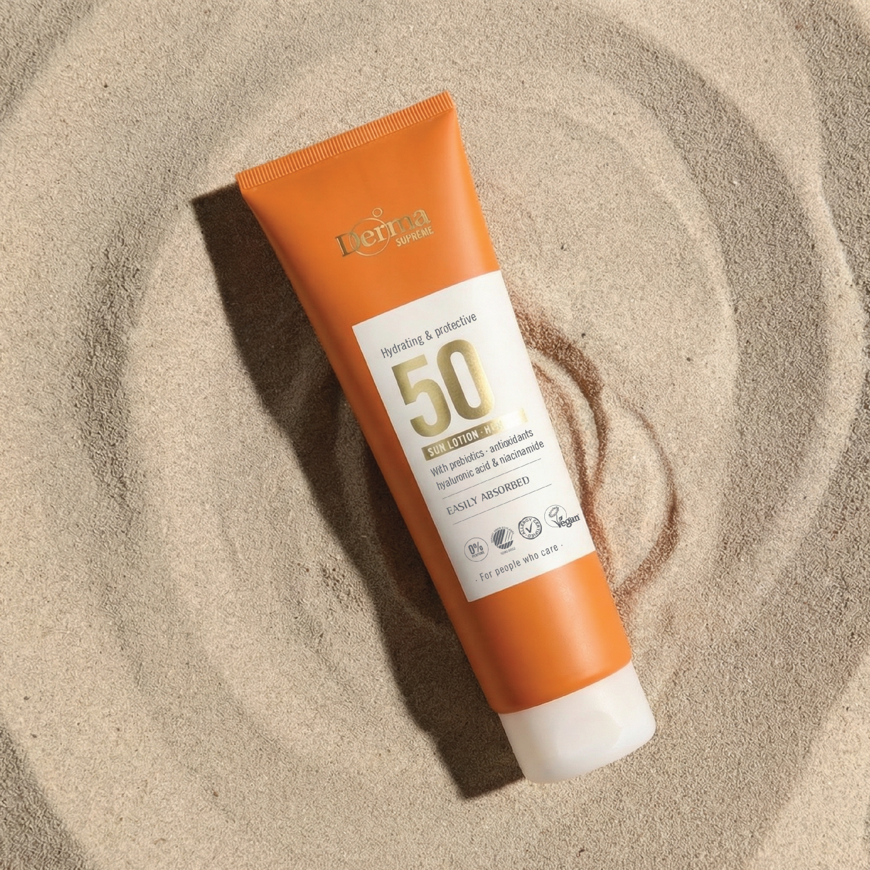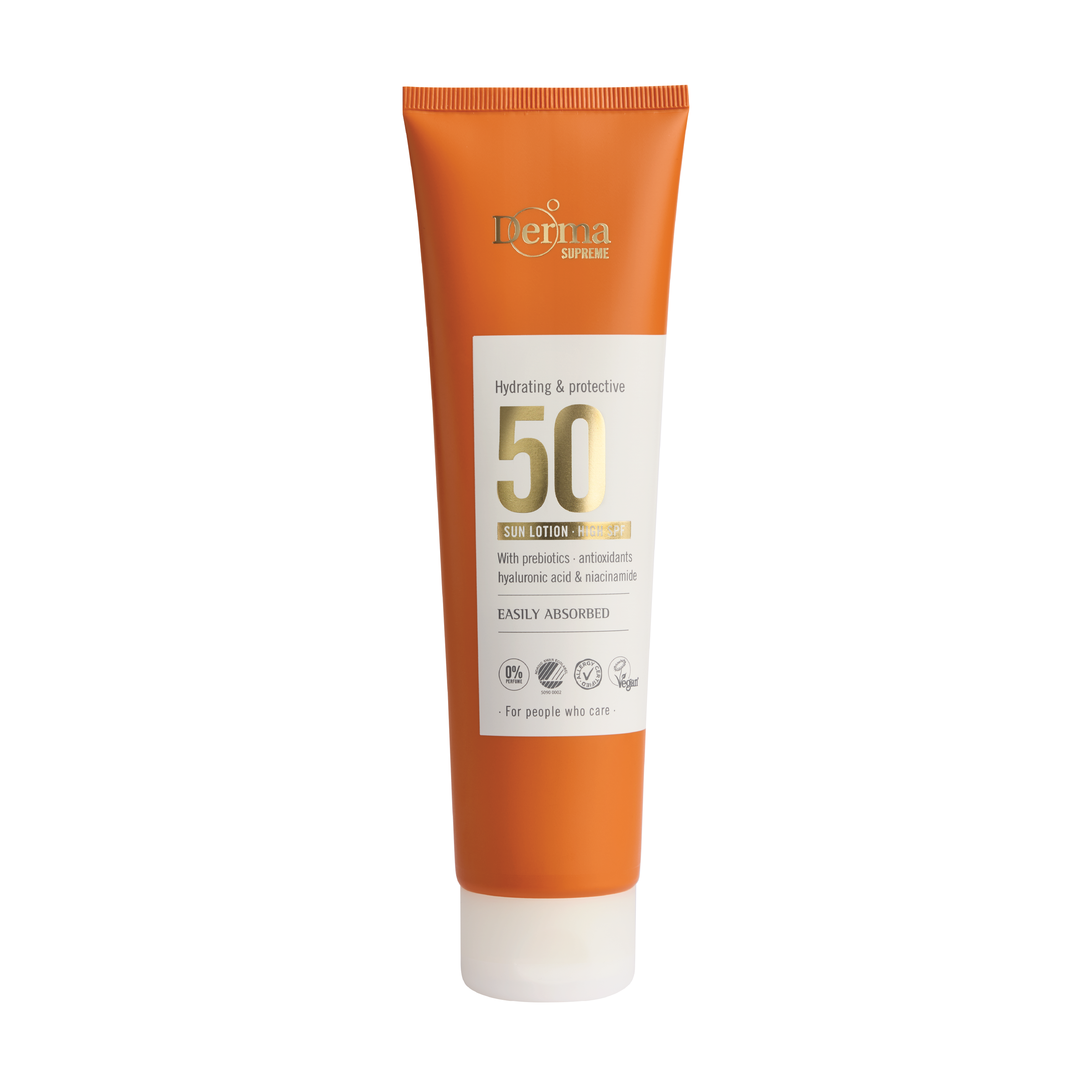 Derma Supreme Sun Lotion SPF50 er formulert med antioksidanter og aktive ingredienser som sammen med høy solfaktor bidrar til å beskytte og pleie huden. Solkremen inneholder prebiotika som bidrar til å opprettholde hudens naturlige balanse, niacinamid som bidrar til å styrke hudbarrieren, hyaluronsyre tilfører fukt og gjør huden myk og smidig, E-vitamin bidrar til å beskytte mot frie radikaler, samt naturlige oljer som sørger for en smidig og elastisk hud. Med sin silkemyke konsistens glir solkremen lett over huden og etterlater en behagelig følelse.