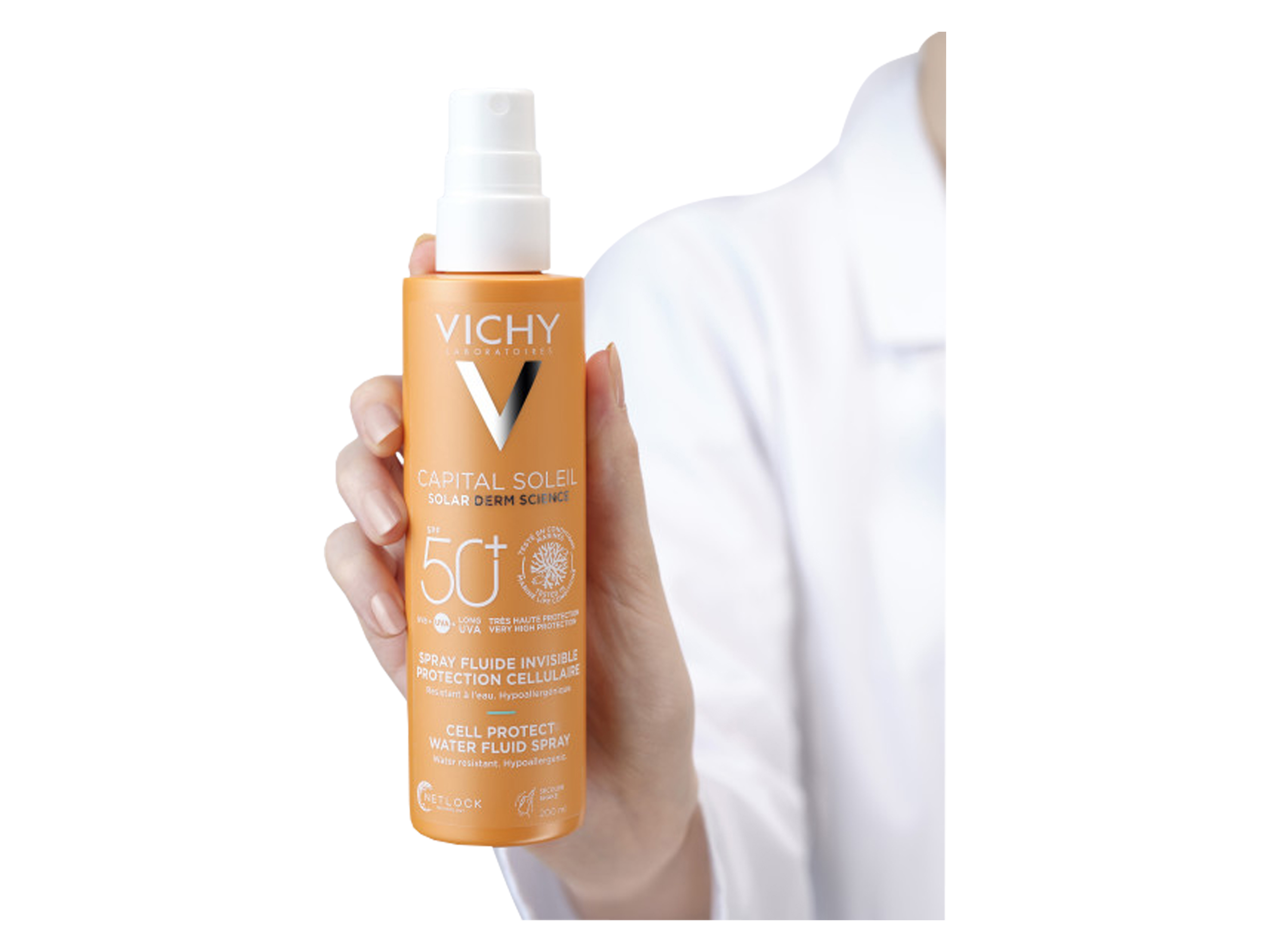Vichy Capital Soleil Cell Protect UV Spray SPF50+ er en ultralett solspray som er spesielt egnet for solsensitiv hud som ønsker høy solfaktor. Solkremen er beriket med probiotiske fraksjoner dyrket i Vichy vulkansk vann som styrker huden og E-vitamin som forsterker hudens antioksidantforsvar for skadelige, frie radikaler. Hyaluronsyre reduserer solens uttørkende effekt. Med avansert Netlock-teknologi som gir en bredspektret beskyttelse mot UVA- og UVB-stråler i en svært flytende, vannaktig konsistens, som absorberes umiddelbart. Virker ikke fet på huden, og etterlater ingen hvite merker. Ekstra vannresistent, samt svette- og sandresistent.
