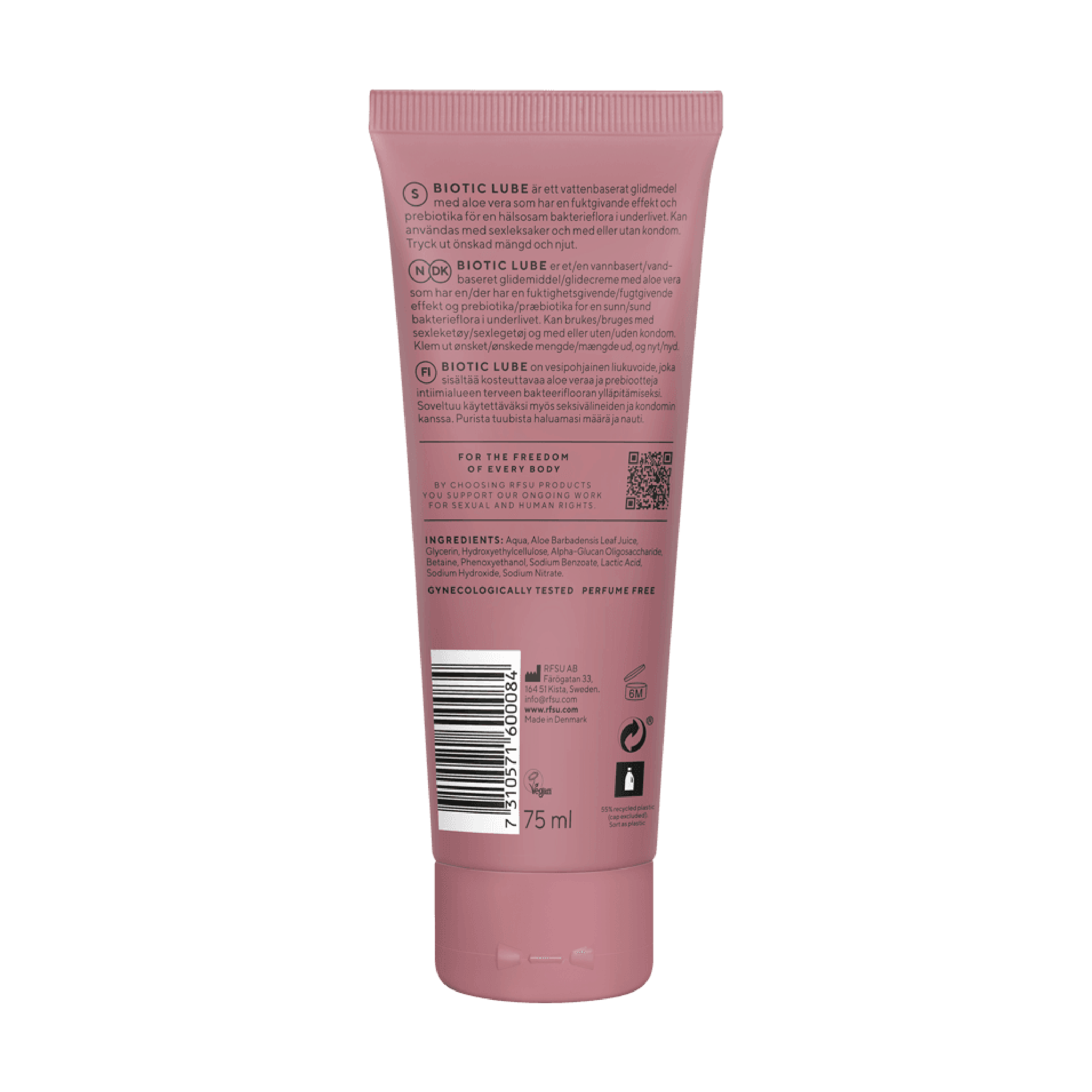 rfsu Biotic Lube er formulert med prebiotika og aloe vera som bidrar til å opprettholde en sunn bakterieflora i underlivet. Glidemiddelet er utviklet for å gi en skånsom, men effektiv glid, og er spesielt egnet for sensitive slimhinner eller for deg som lett opplever ubalanse i bakterieflora i forbindelse med sex. Glidemiddelet kan brukes vaginalt og analt, ved onani, sammen med kondom og ved bruk av sexleketøy. Glidemiddelet er gynekologisk testet og utviklet for god toleranse.