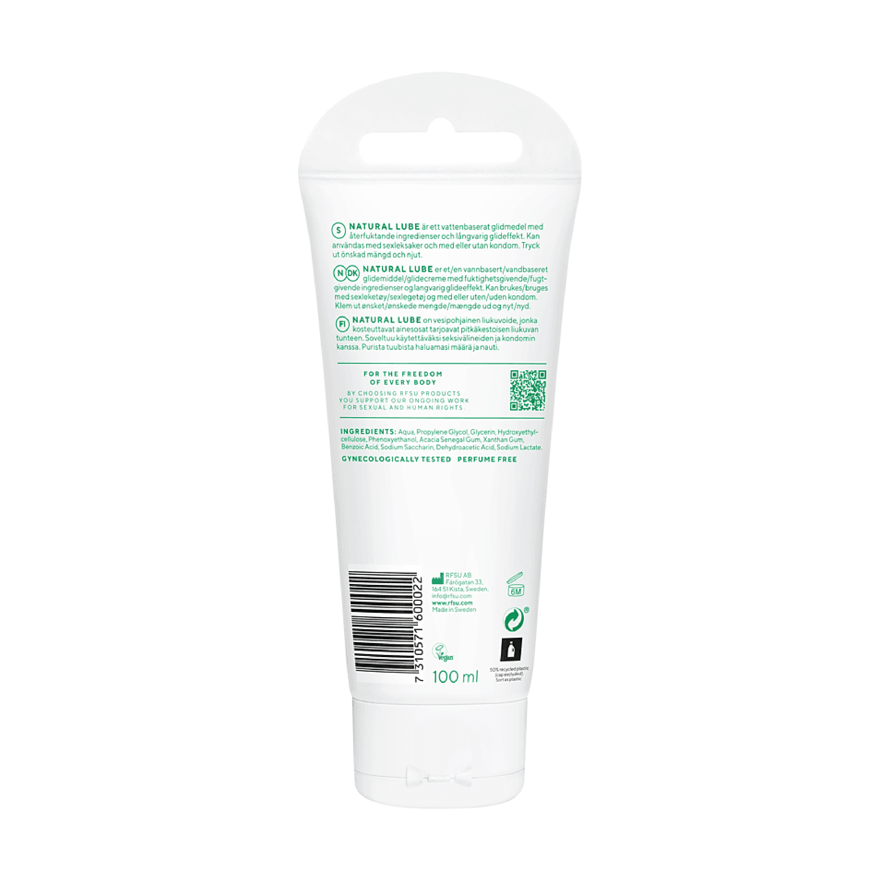 rfsu Natural Lube gir en langvarig glideeffekt og er naturlig og skånsom mot kroppen. Glidemiddelet etterlater hverken flekker eller tørker ut. Gelen har en nøytral pH-verdi på 5,0 som er tilpasset det sensitive miljøet i kjønnsorganene. Glidemiddelet er dermatologisk og gynekologisk testet.