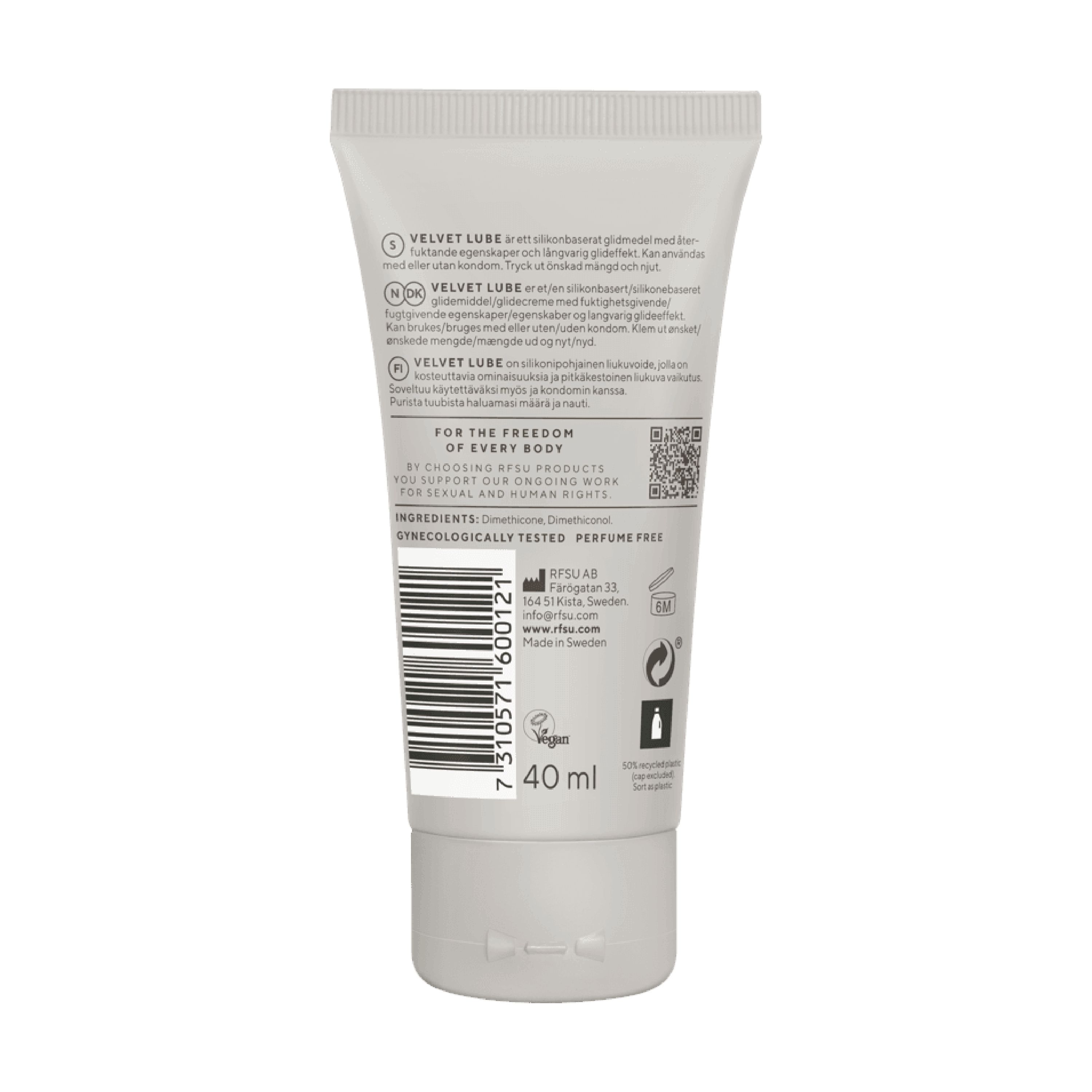 rfsu Velvet Lube er et silikonbasert glidemiddel som gir en silkemyk følelse. Kan brukes med kondom. Glidemiddelet er svært drøyt i bruk. Gelen er dermatologisk og gynekologisk testet.