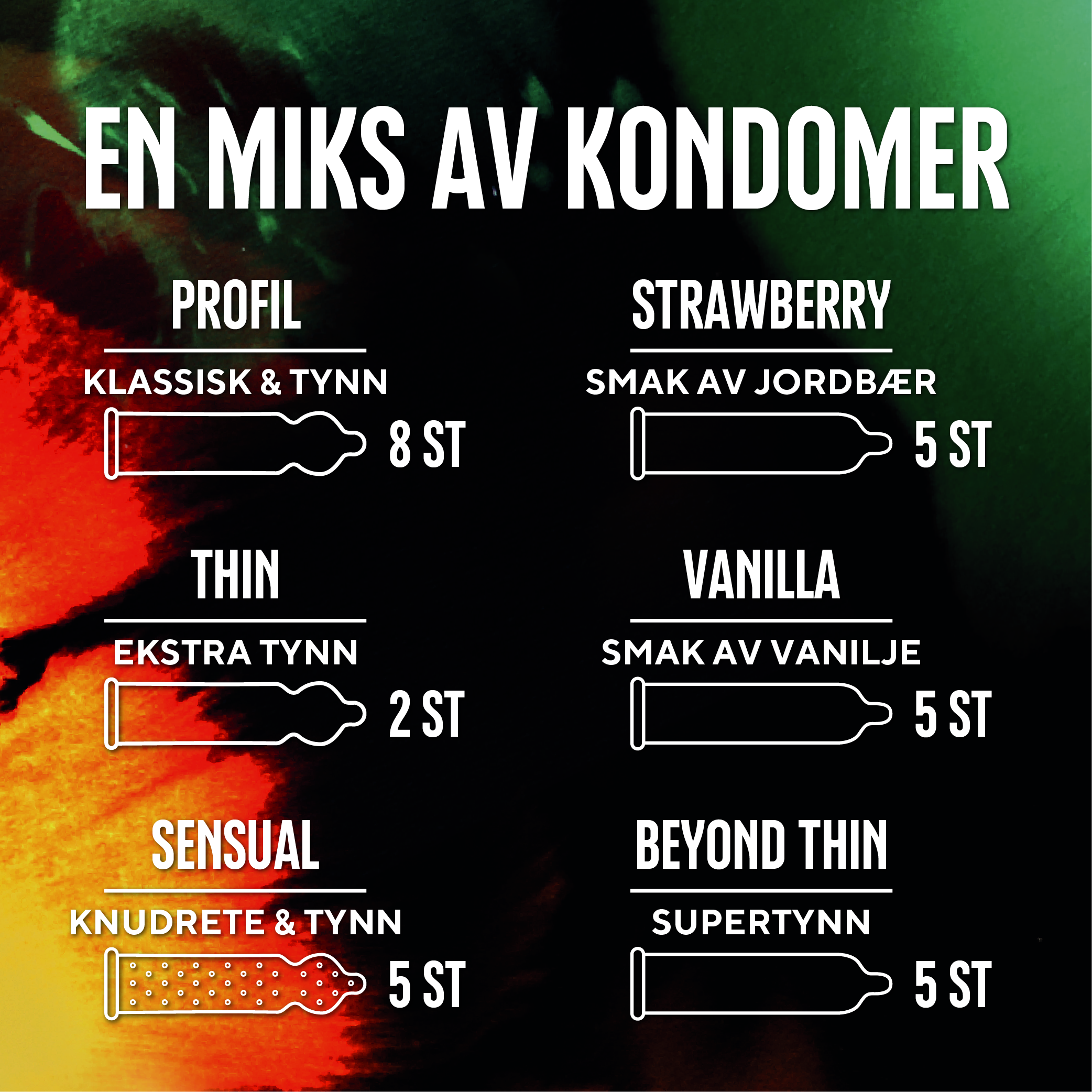 Rfsu Kondom Enjoy er pakken for deg som vil kjenne etter, prøve noe nytt eller bare ønsker variasjon. Her får du kondomer med ulik passform, tynnhet, struktur og aroma i glidemiddelet. Rfsu sine kondomer har gjennomgått strenge tester og er av høy kvalitet.