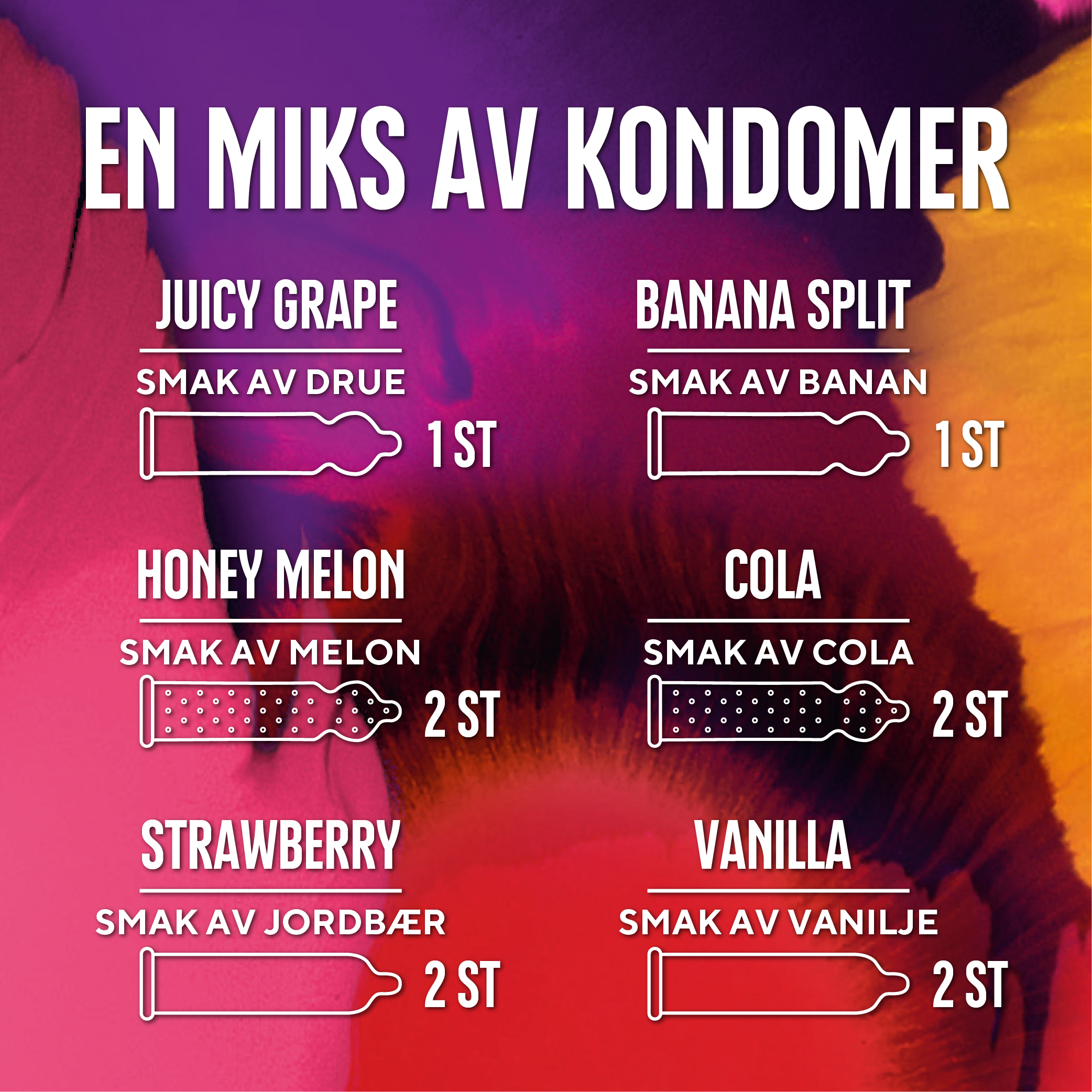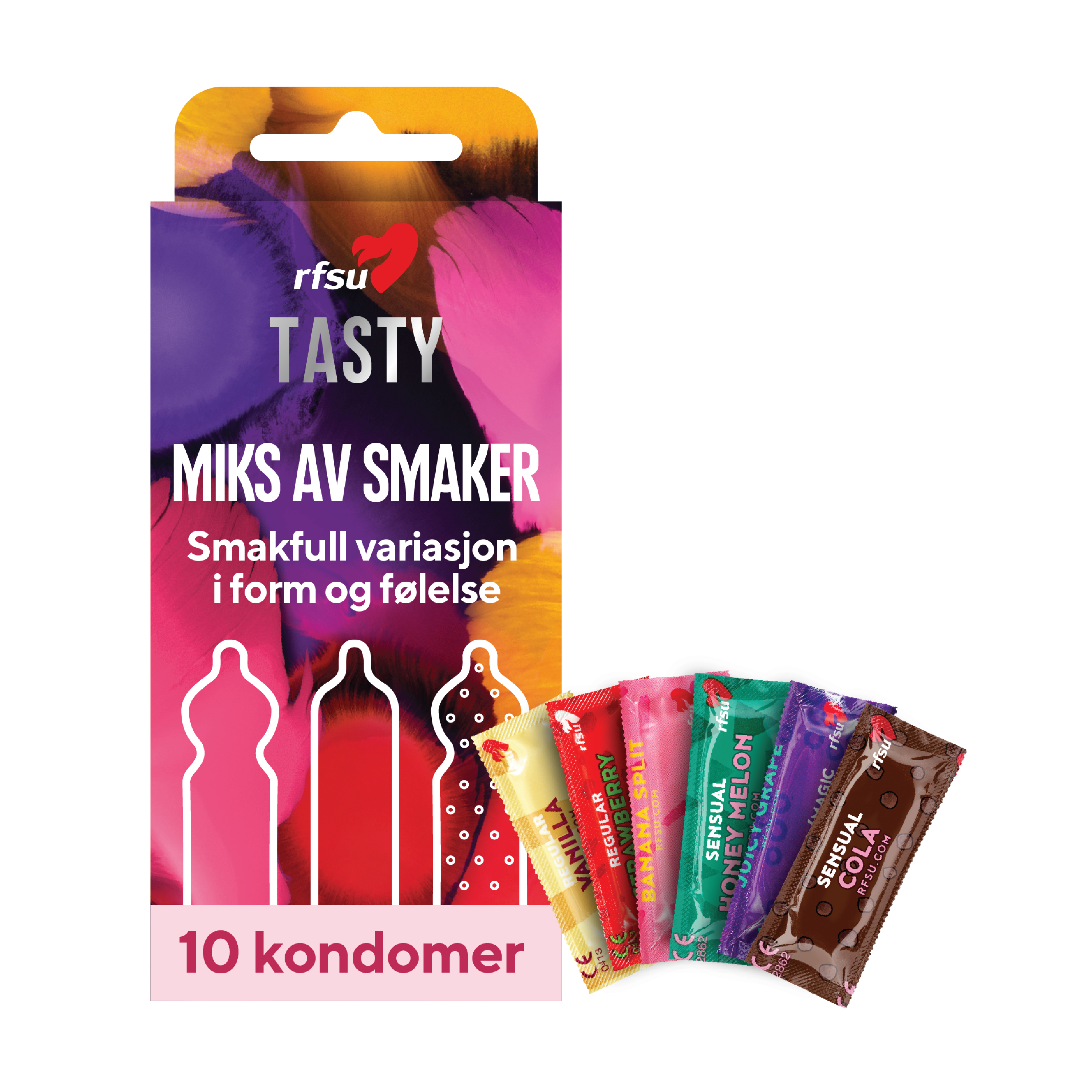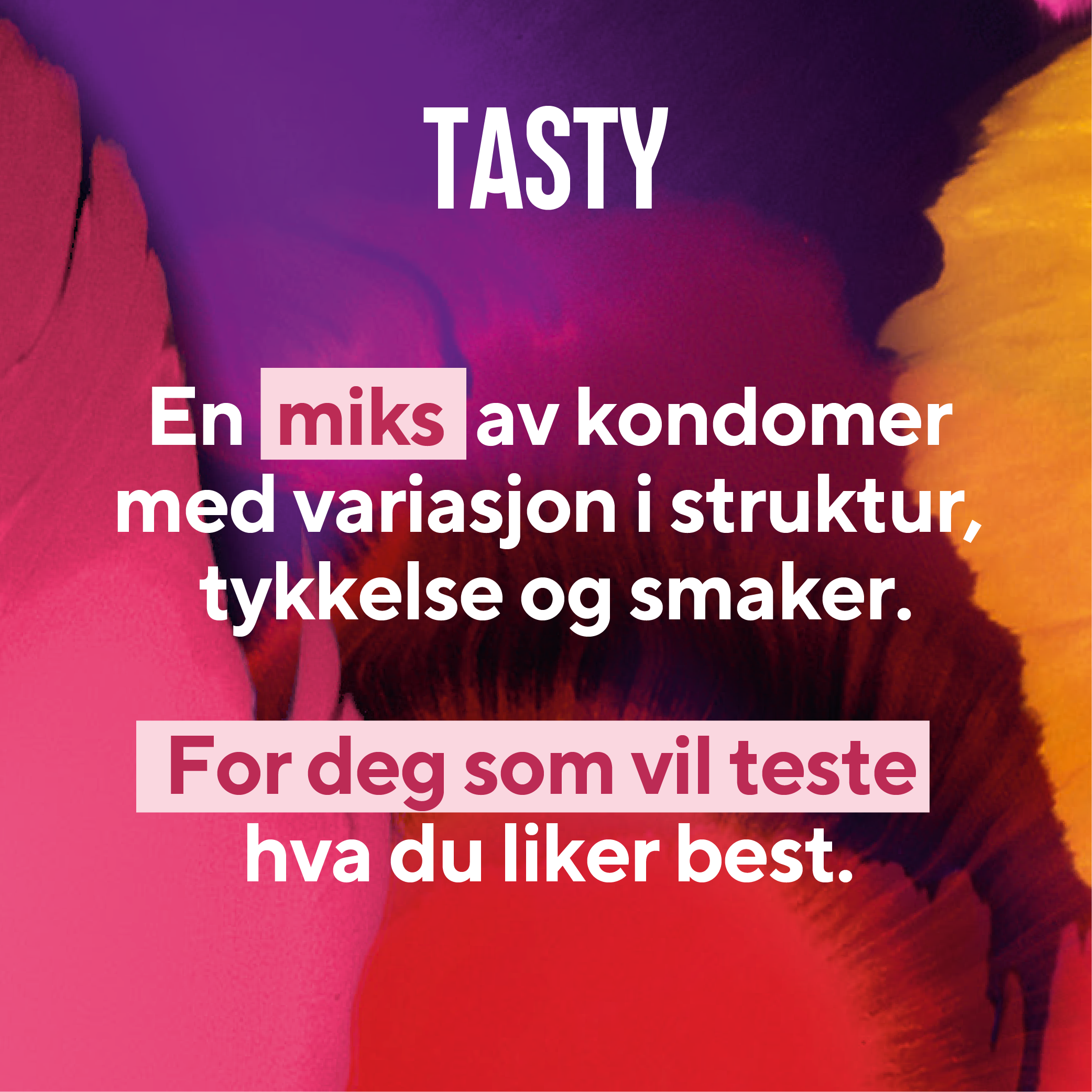 Rfsu Kondom Tasty er glidemiddelbehandlede kondomer med lomme på tuppen og en kombinasjon av både glatte og med dotter for økt følelse. Rfsu sine kondomer har gjennomgått strenge tester og er av høy kvalitet. Pakken inneholder flere spennende smaksvarianter, perfekt når du ønsker litt variasjon: