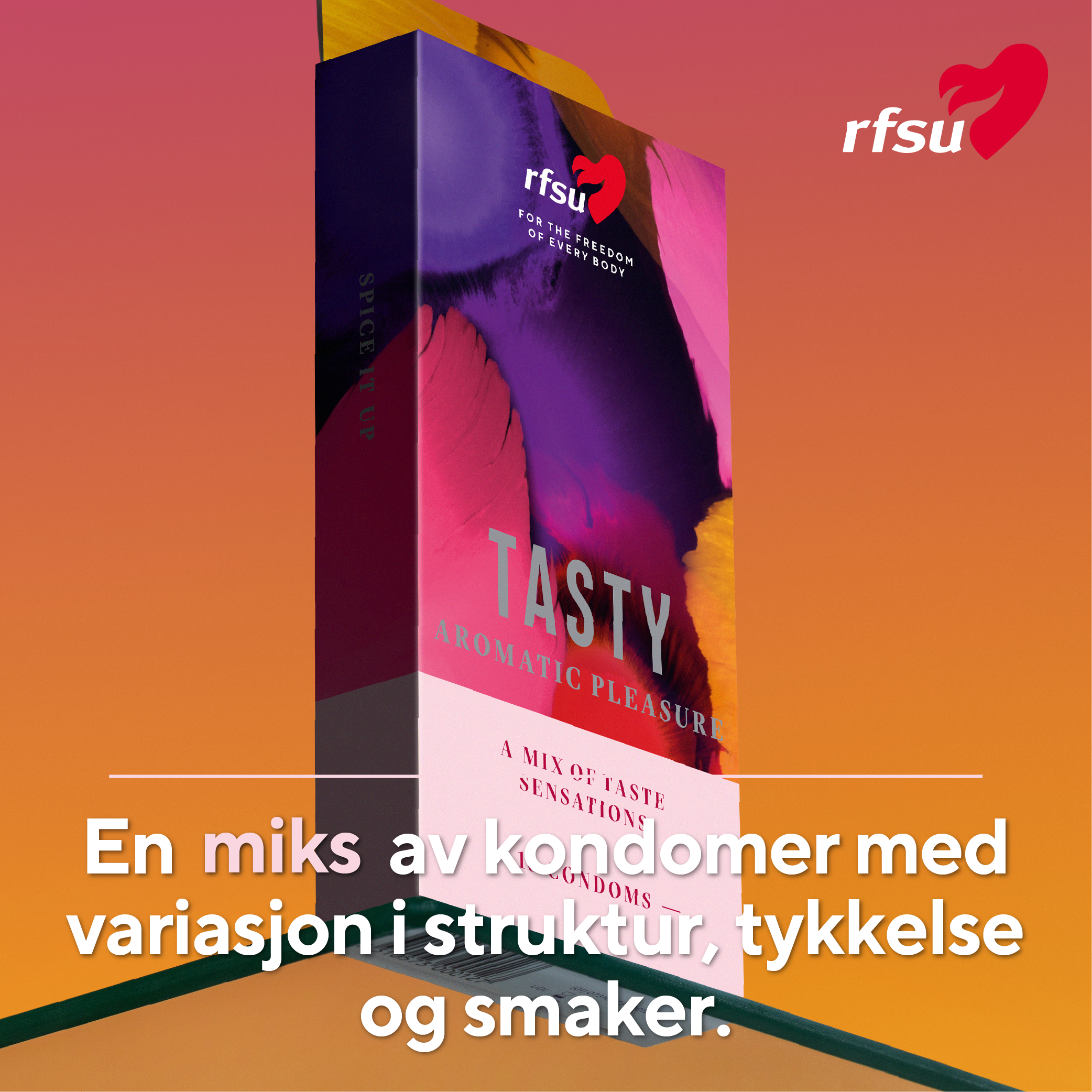 Rfsu Kondom Tasty er en velduftende miks av transparente latekskondomer med ulike smaker og overflater.