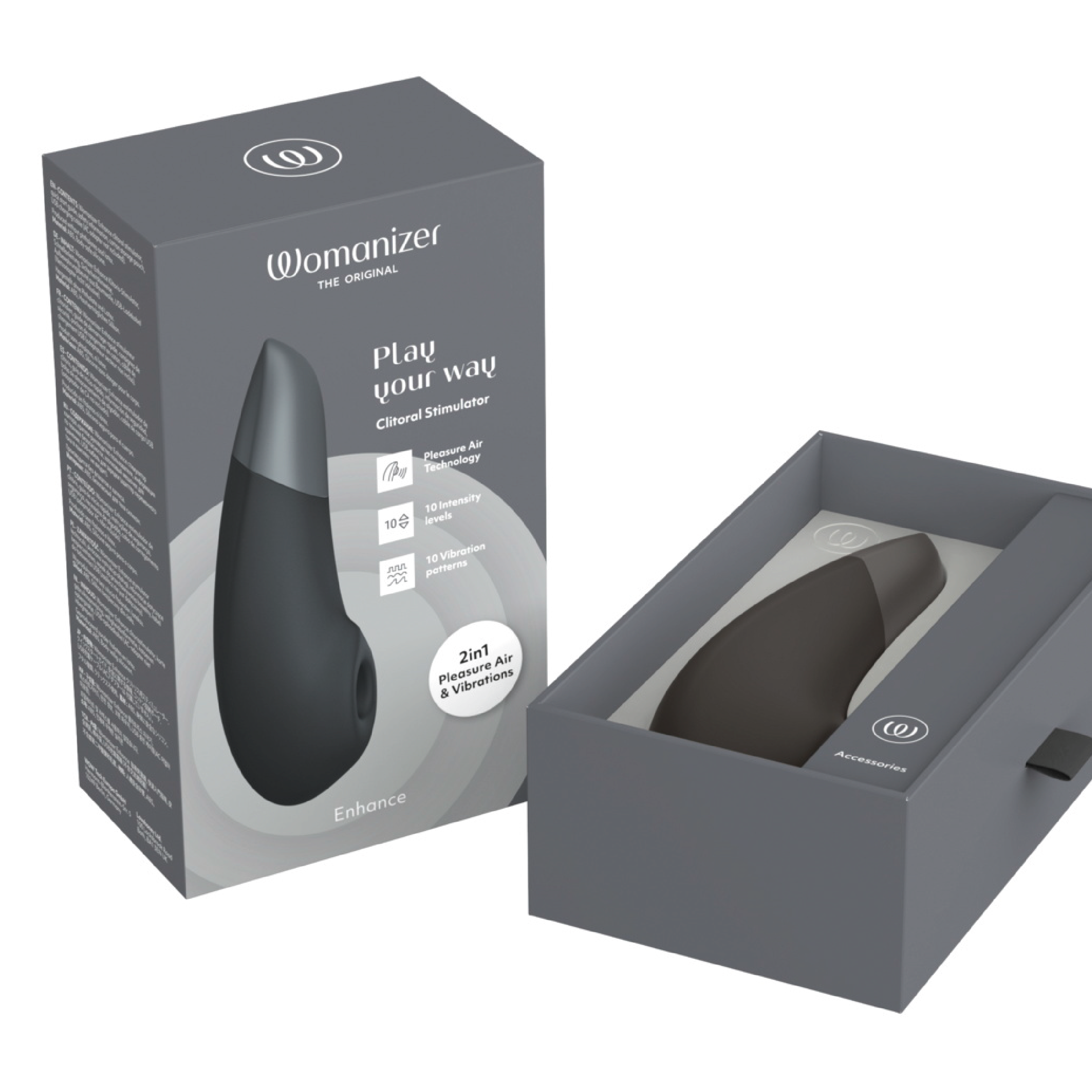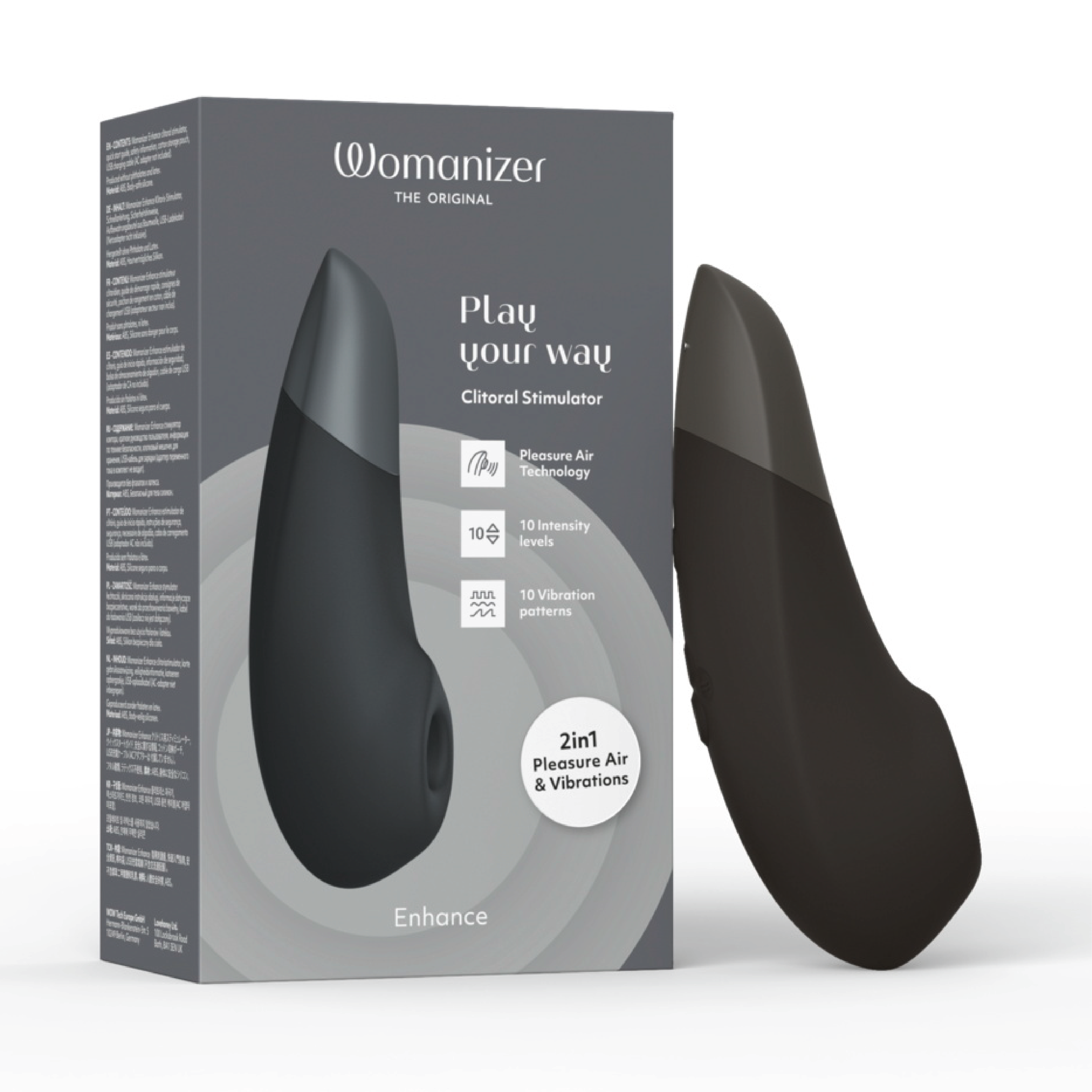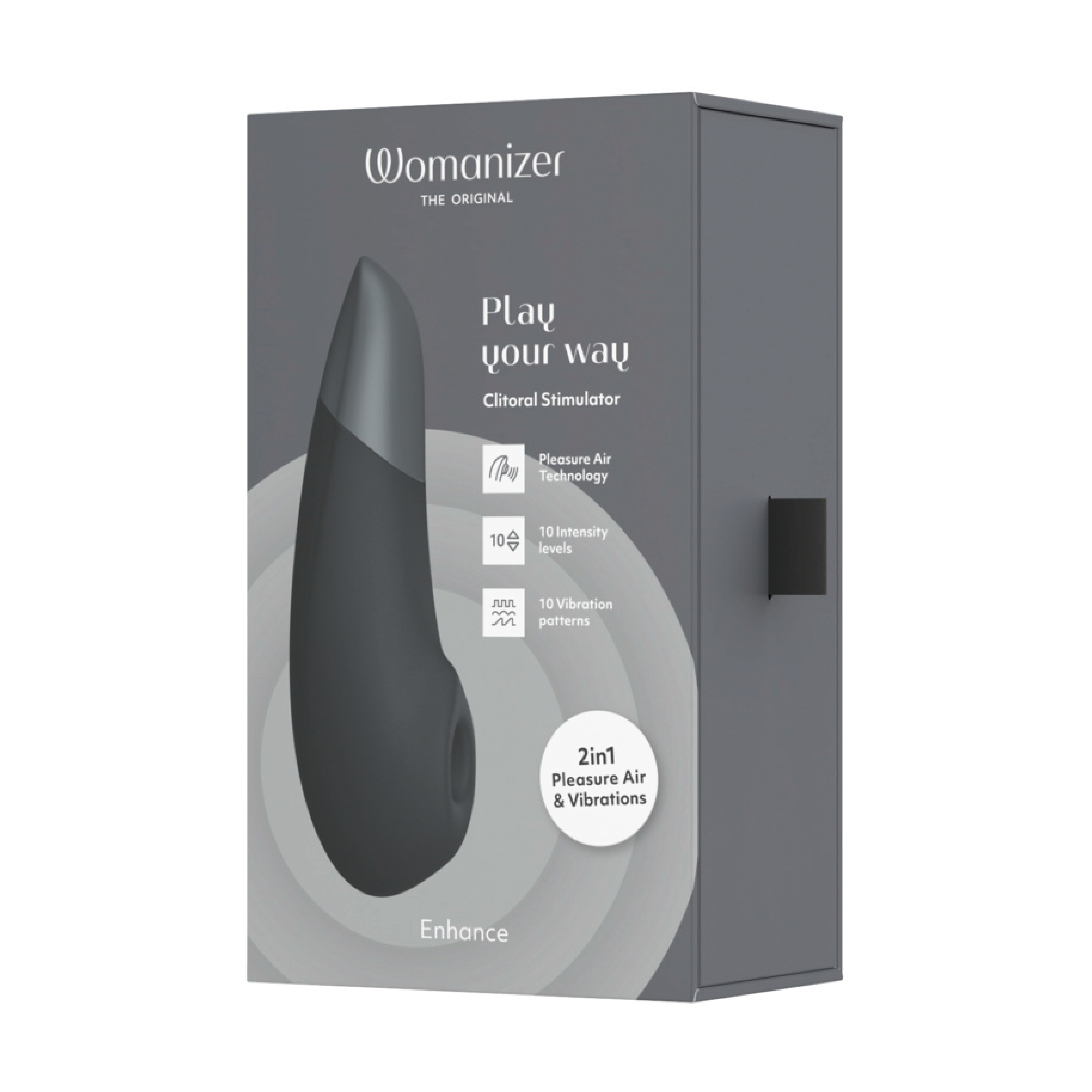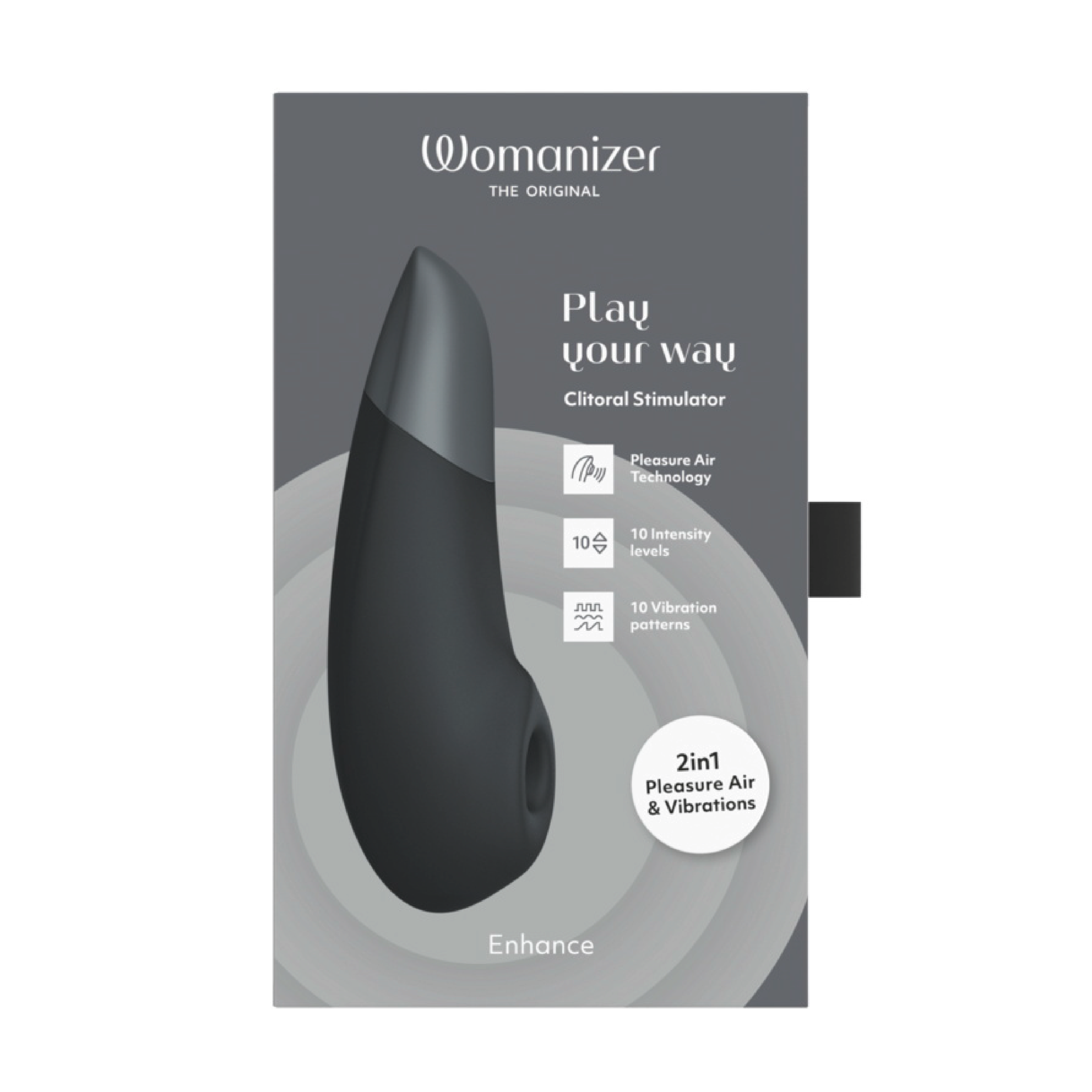 Womanizer Enhance kombinerer Pleasure Air Technology med kraftige We-Vibe-vibrasjoner. Pulserende trykkbølger stimulerer klitoris uten direkte berøring, mens dype vibrasjoner sprer seg over vulvaområdet. Produktet har tilnærmet lydløs dobbel motor for diskret bruk. Trykkbølger og vibrasjoner kan styres separat og justeres med ett tastetrykk. Enheten har 10 moduser og 10 intensitetsnivåer for begge funksjoner, noe som gir over 1000 mulige kombinasjoner. Stimulatoren er vanntett og kan brukes i dusj og badekar. Det ergonomiske designet og det brede stimuleringshodet er utviklet for klitoris- og vulvastimulering, og kan også brukes på andre ytre erogene soner. Den myke silikonoverflaten gjør at produktet glir lett mot huden. Womanizer Enhance er oppladbar og leveres med USB-kabel og oppbevaringspose.