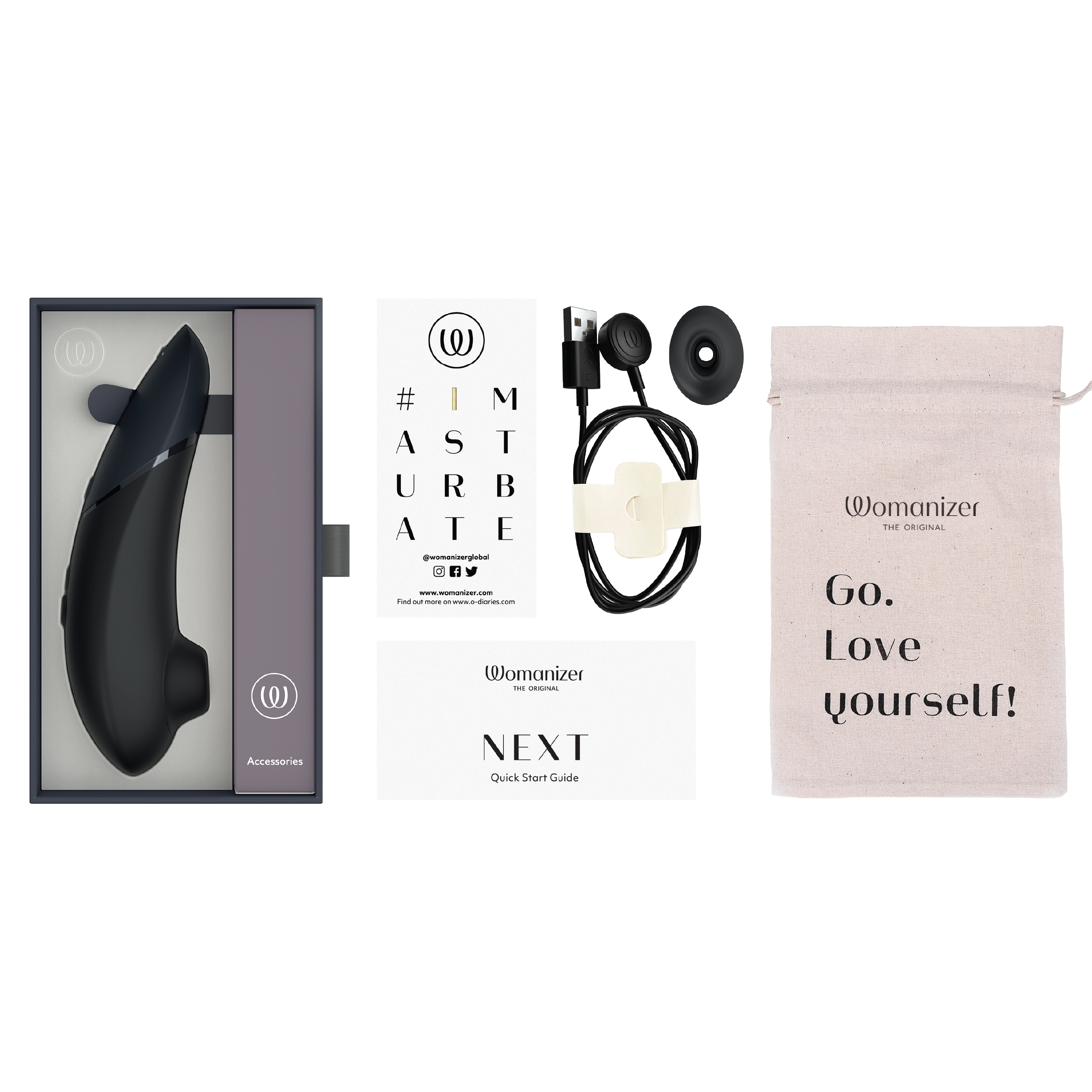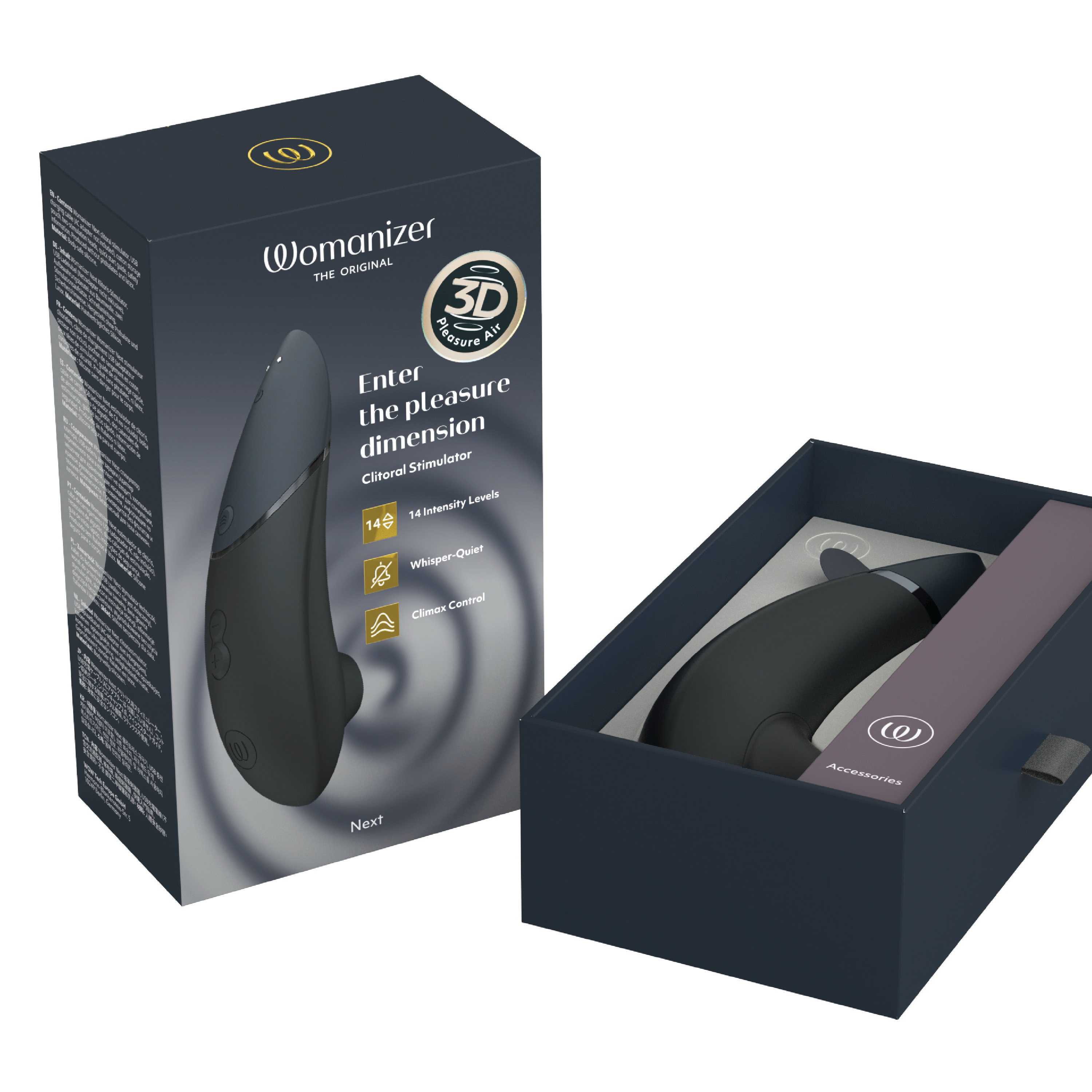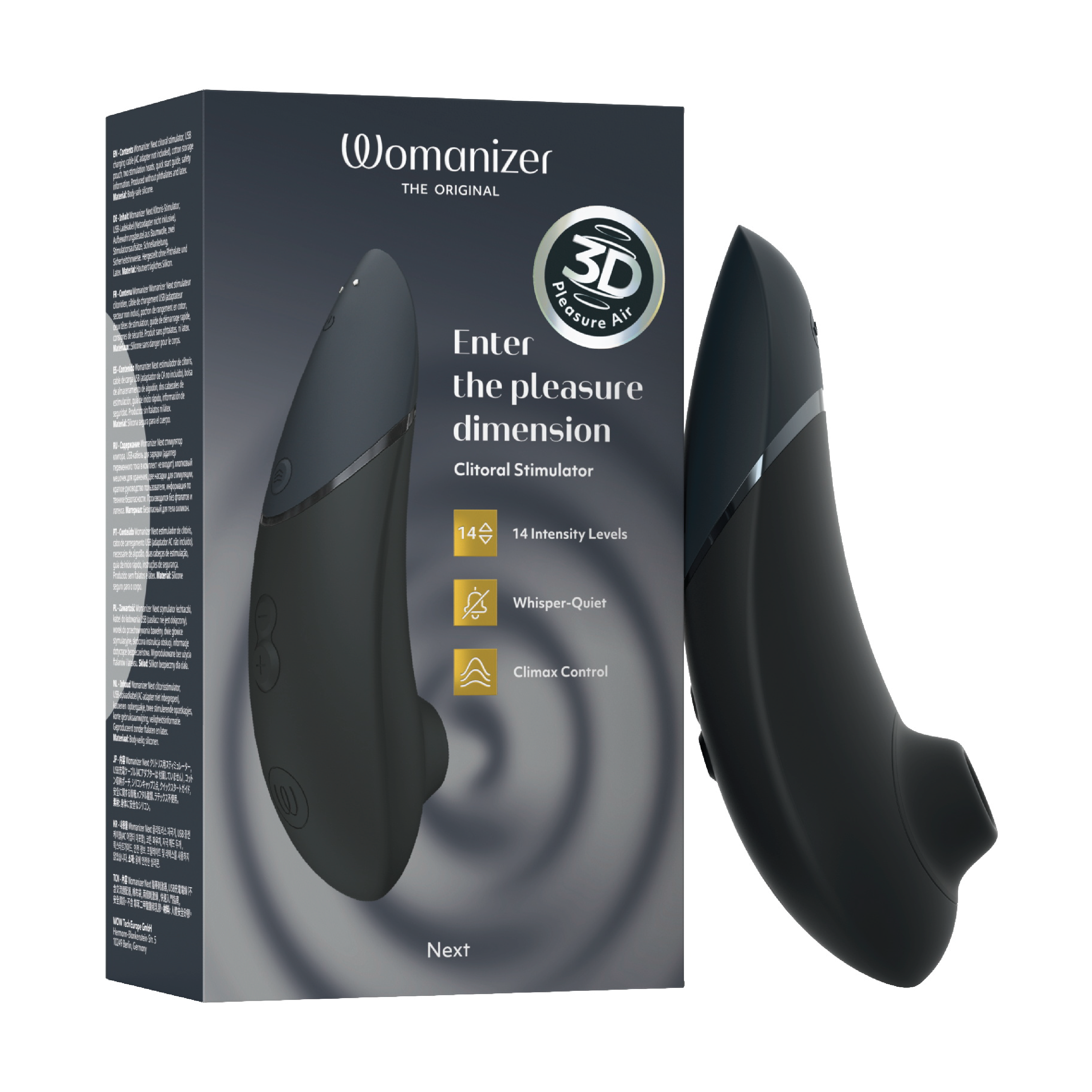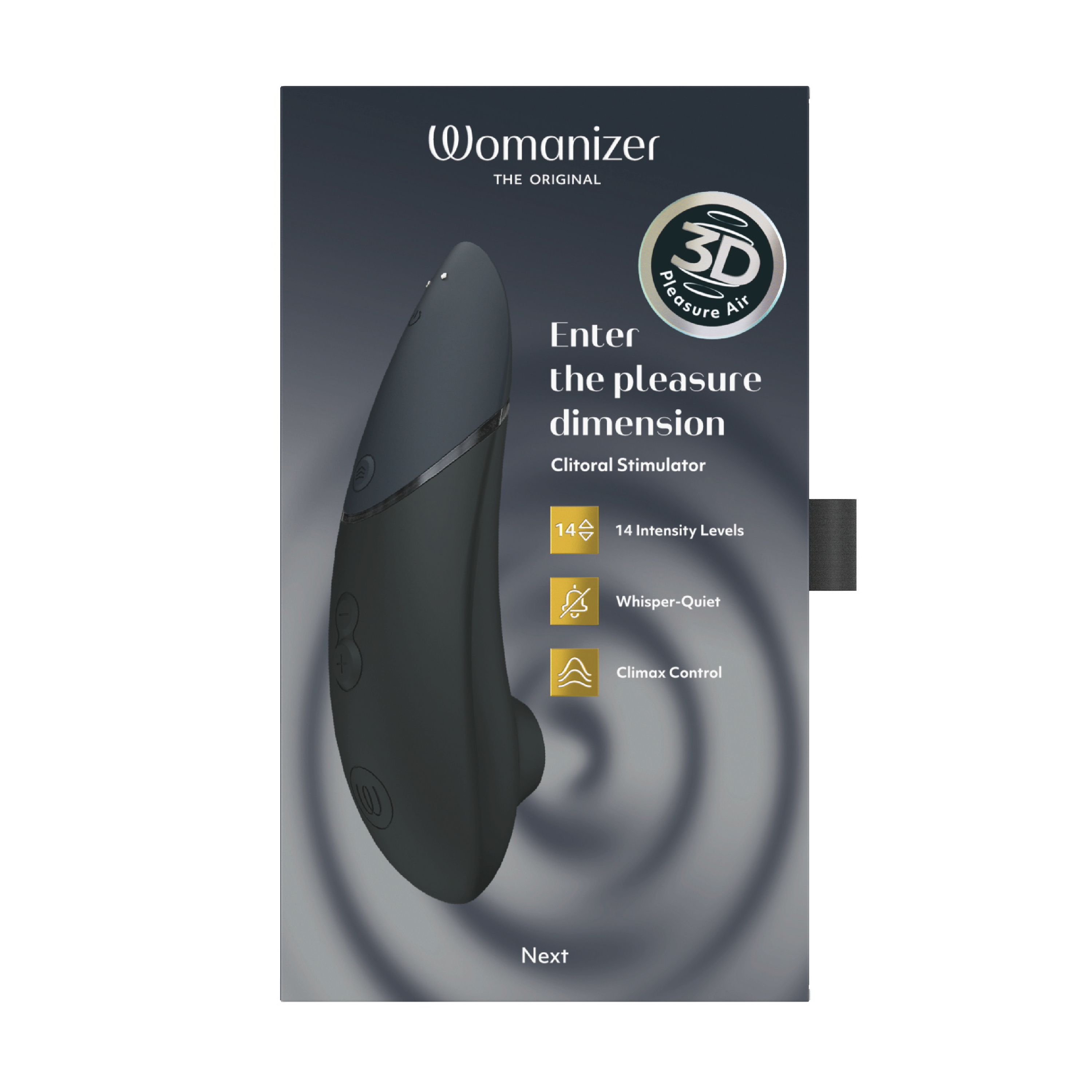 Womanizer Next benytter tilnærmet lydløs 3D Pleasure Air Technology som stimulerer klitoris uten direkte kontakt. Stimulatoren har 14 justerbare intensitetsnivåer (+/-) og Climax Control i tre nivåer, slik at både intensitet og dybde på de pulserende trykkbølgene kan tilpasses. Etter orgasme kan produktet settes tilbake til laveste nivå med ett tastetrykk (afterglow-funksjon). Autopilot-funksjonen endrer intensiteten automatisk og tilfeldig for en variert opplevelse. Smart Silence-funksjonen gjør at enheten kun aktiveres ved kontakt med huden og ellers er i standby-modus. Womanizer Next er vanntett og kan brukes i dusj og badekar. Den slanke og kompakte stimulatoren har en helhetlig soft-touch-overflate og er enkel å håndtere. Stimuleringshodet og ekstrahodet er laget av myk silikon.