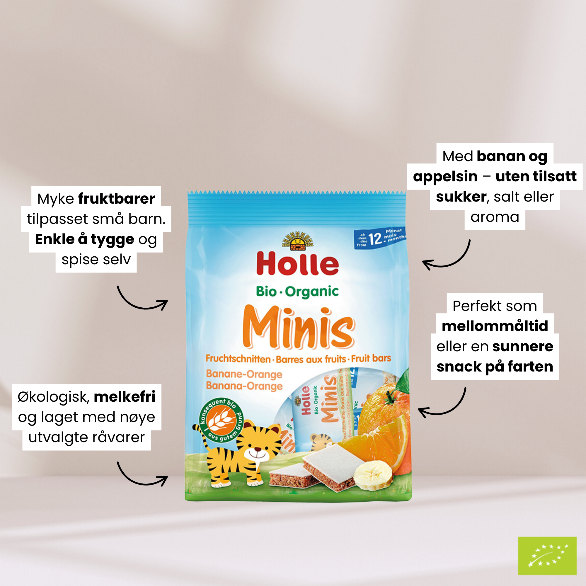 Holle Øko Minis Fruktbar Banan og Appelsin er en økologisk fruktbar med smak av banan og appelsin. Takket være basen av fullkorn, slipper du å bekymre deg for klissete barnefingre. Perfekt når dere er ute på tur, humøret på vei ned, og det er lenge til neste måltid.