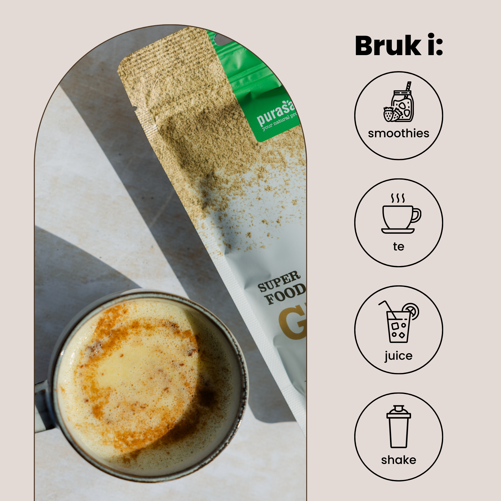 Purasana Ginger Powder er pulverisert ingefær som har svært mange anvendelsesområder.