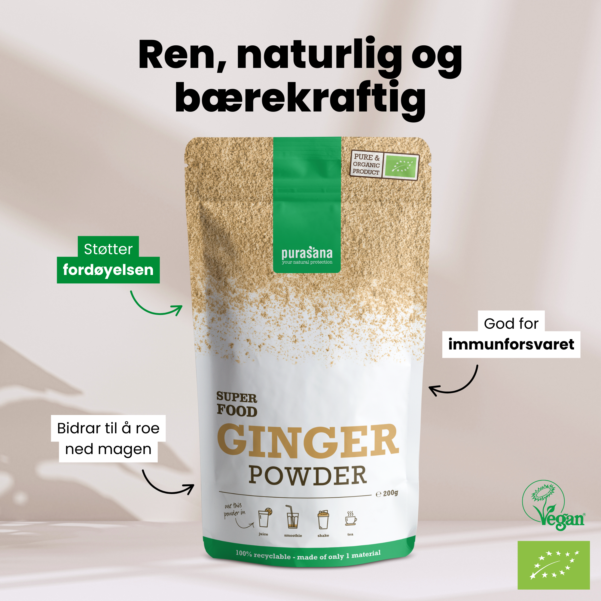 Purasana Ginger Powder er fremstilt av ingefær som er en tradisjonsrik rot med mange gode egenskaper. Ingefær kan blant annet bidra til en god fordøyelse og motvirke lett kvalme. Den kan også virke lindrende på ømme og stive ledd, samt virke betennelsesdempende.