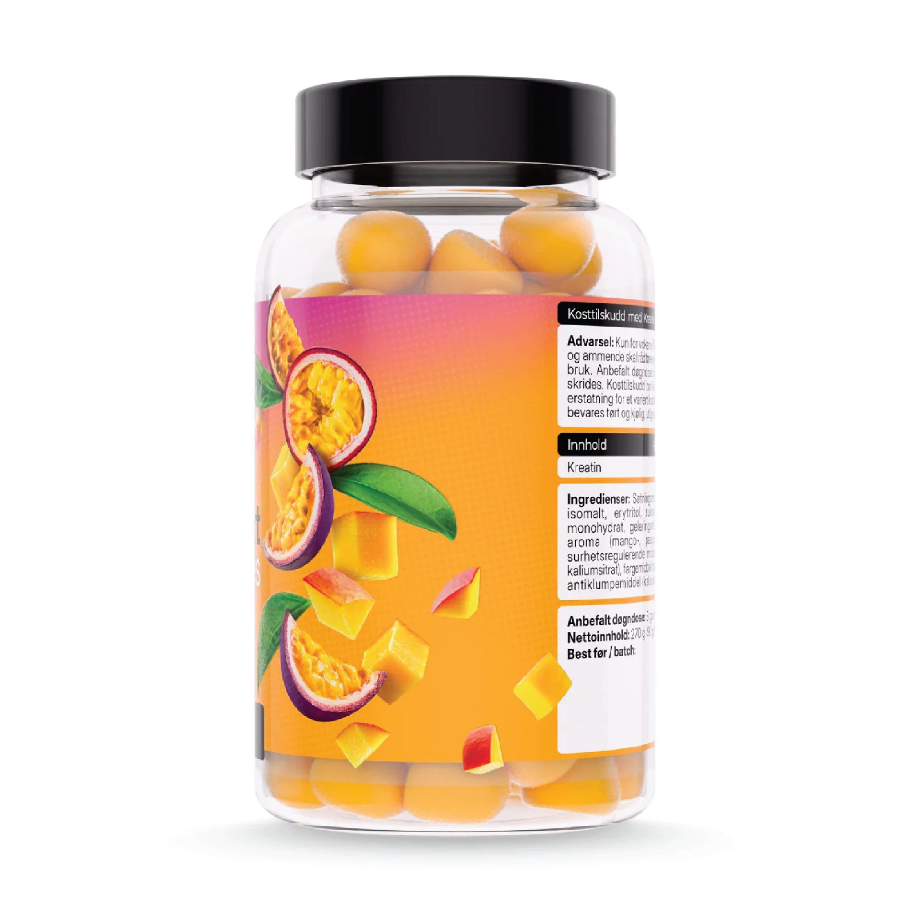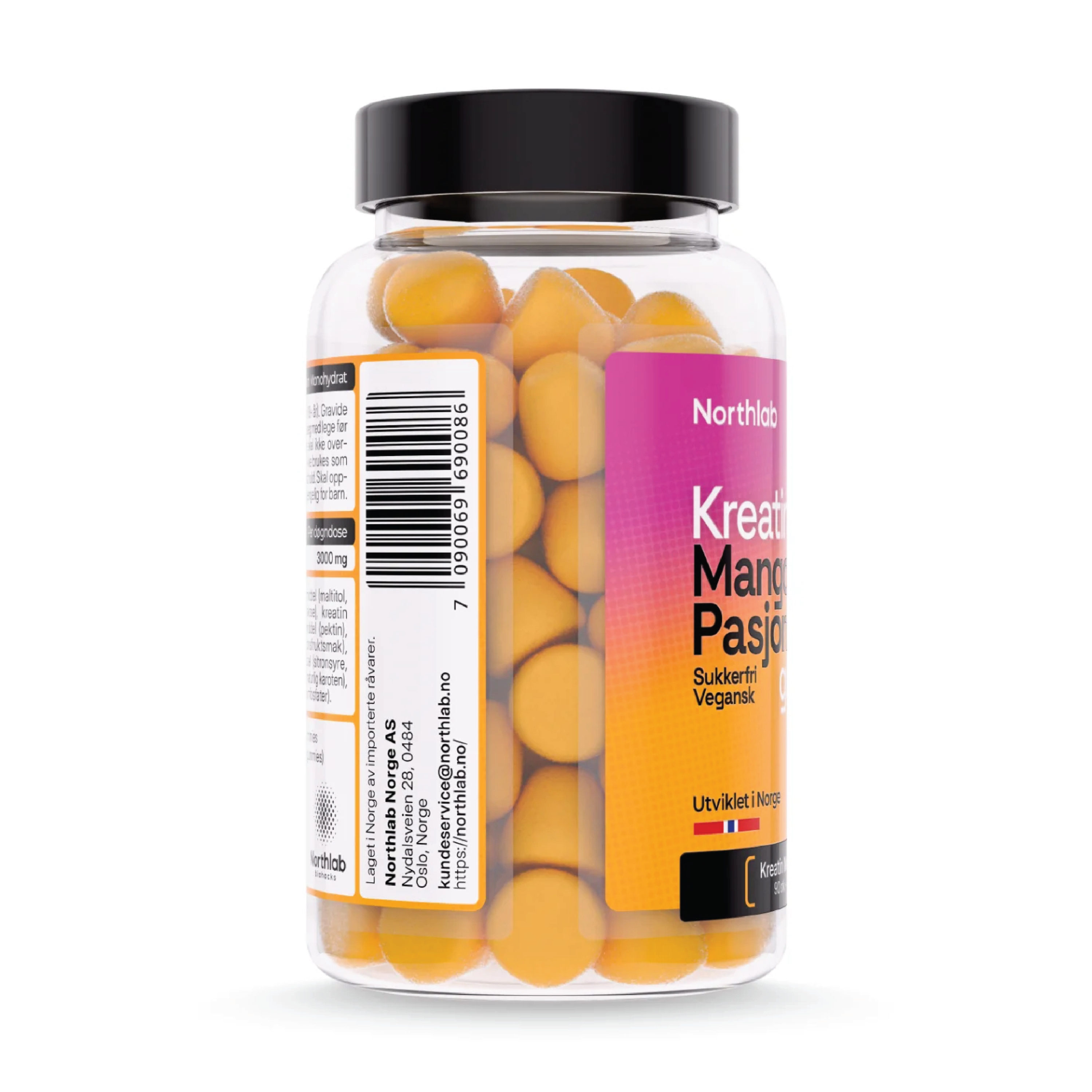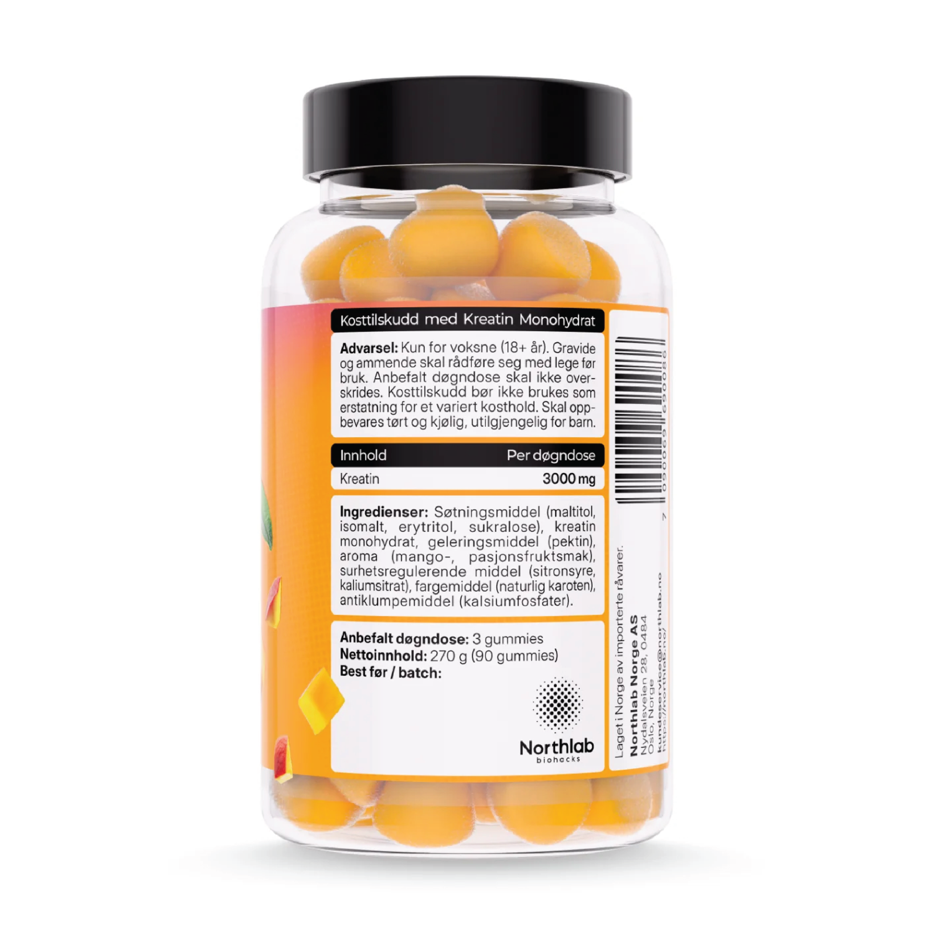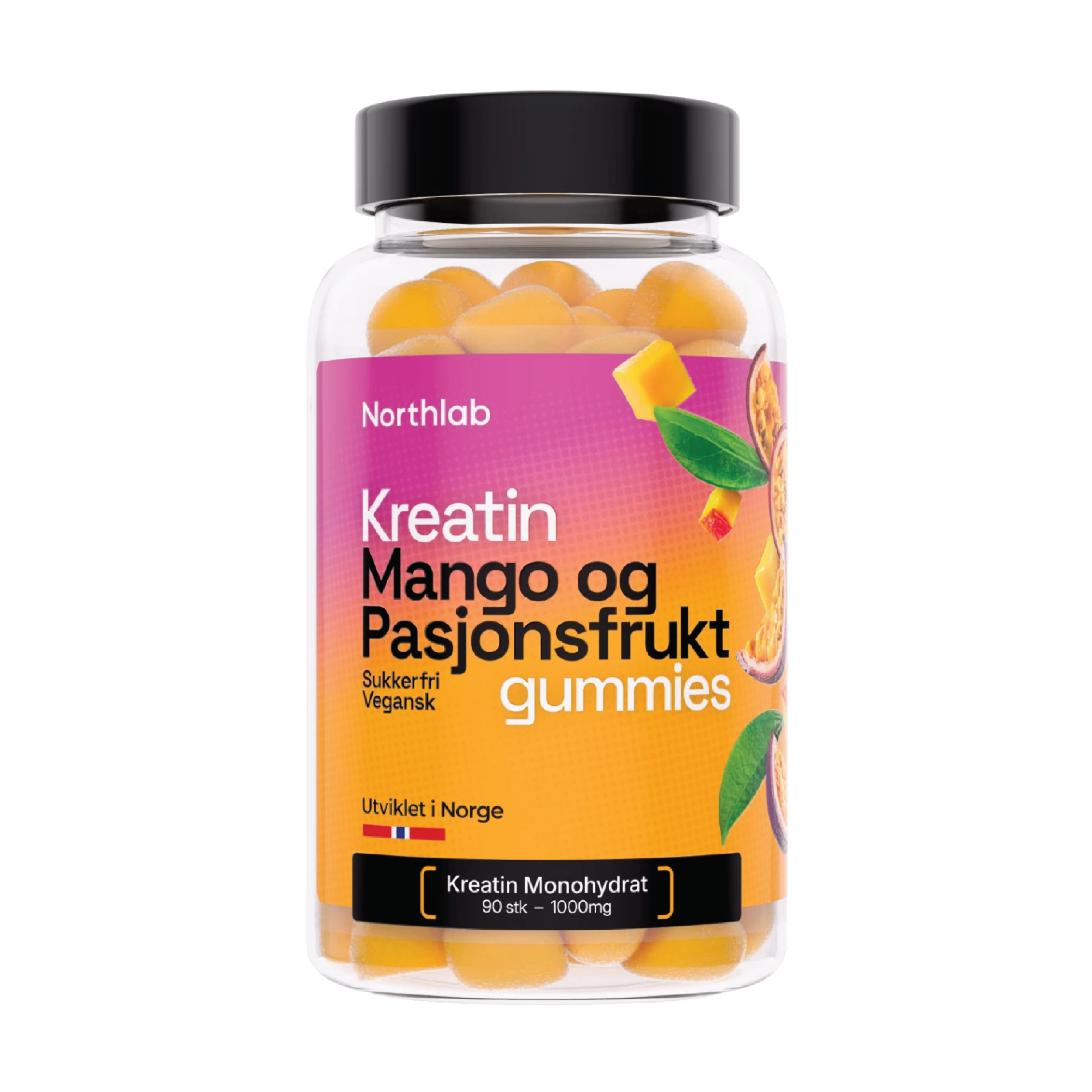 Northlab Kreatingummies inneholder 1000 mg kreatin monohydrat pr gummy, og kan bidra til å øke prestasjonsevnen ved gjentatte kraftanstrengelser under kortvarig, høyintensiv trening. Kreatin er et stoff som produseres naturlig i kroppen. Det meste av kroppens kreatin utnyttes av muskulaturen. Tyggebitene har en deilig smak av mango og pasjonsfrukt, og er sukkerfrie og veganske.