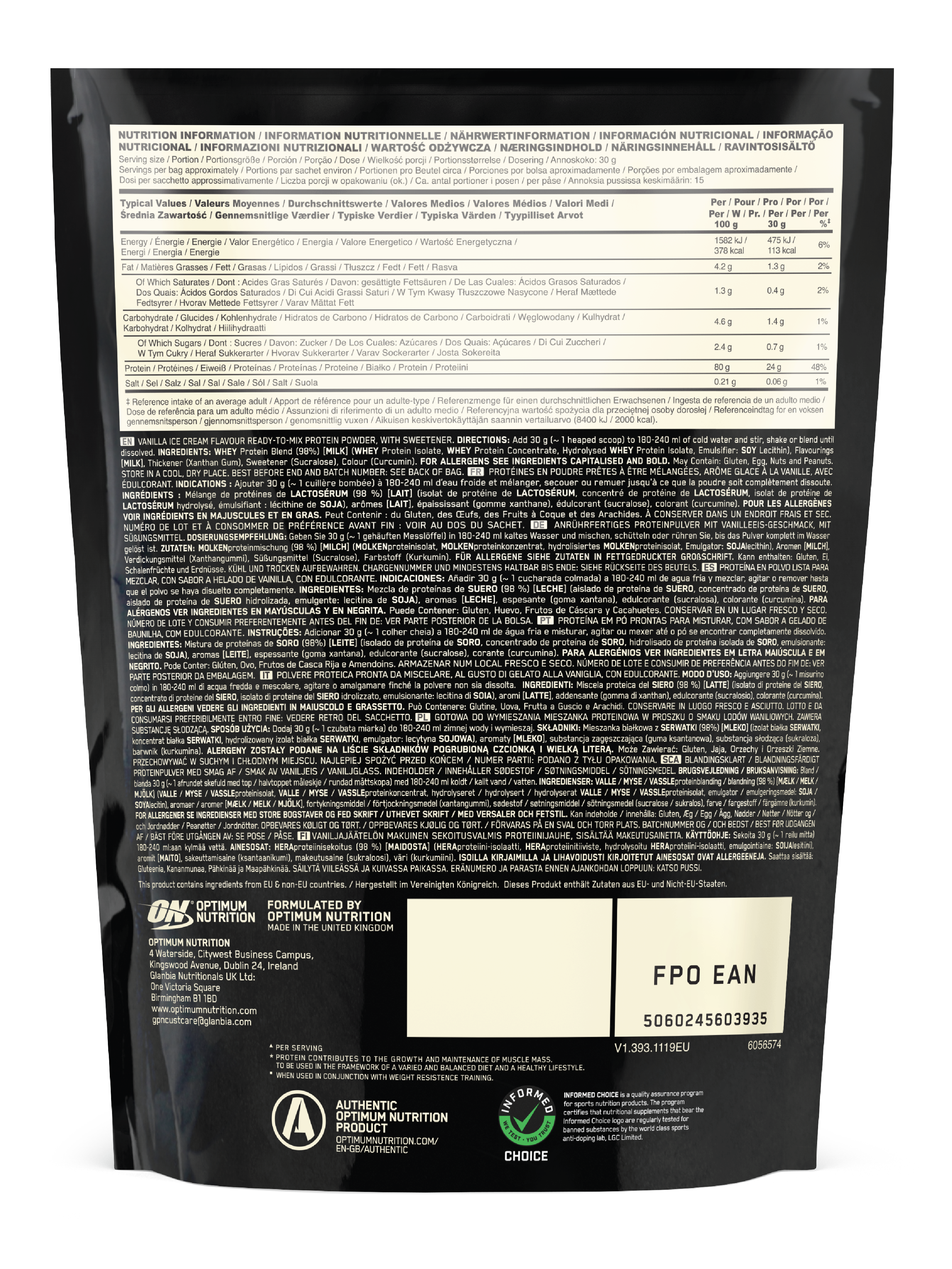 Optimum Nutrition 100% Whey GOLD Standard Whey Vanilla Ice Cream inneholder et høyt proteininnhold som bidrar til å opprettholde og bygge sterkere muskler. Proteinpulver fra Optimum Nutrition inneholder isolert myseprotein som består av mer enn 90 % protein. At mysen er blitt isolert betyr at man ved avanserte metoder har isolert mysen fra uønsket innhold som fett, kolesterol og laktose for å gi et renest mulig produkt. Denne rene formen kalles for myseisolat (WPI) og er den mest forekommende ingrediensen i Optimum Nutrition 100 % Whey Gold Standard. Innholdet av protein i det ferdige produktet ligger på mellom 79 - 82 %. For lettere opptak og nedbryting er det tilsatt enzymer, mer mysepeptider, høyt innhold av glutamin og grenede aminosyrer (BCAA).