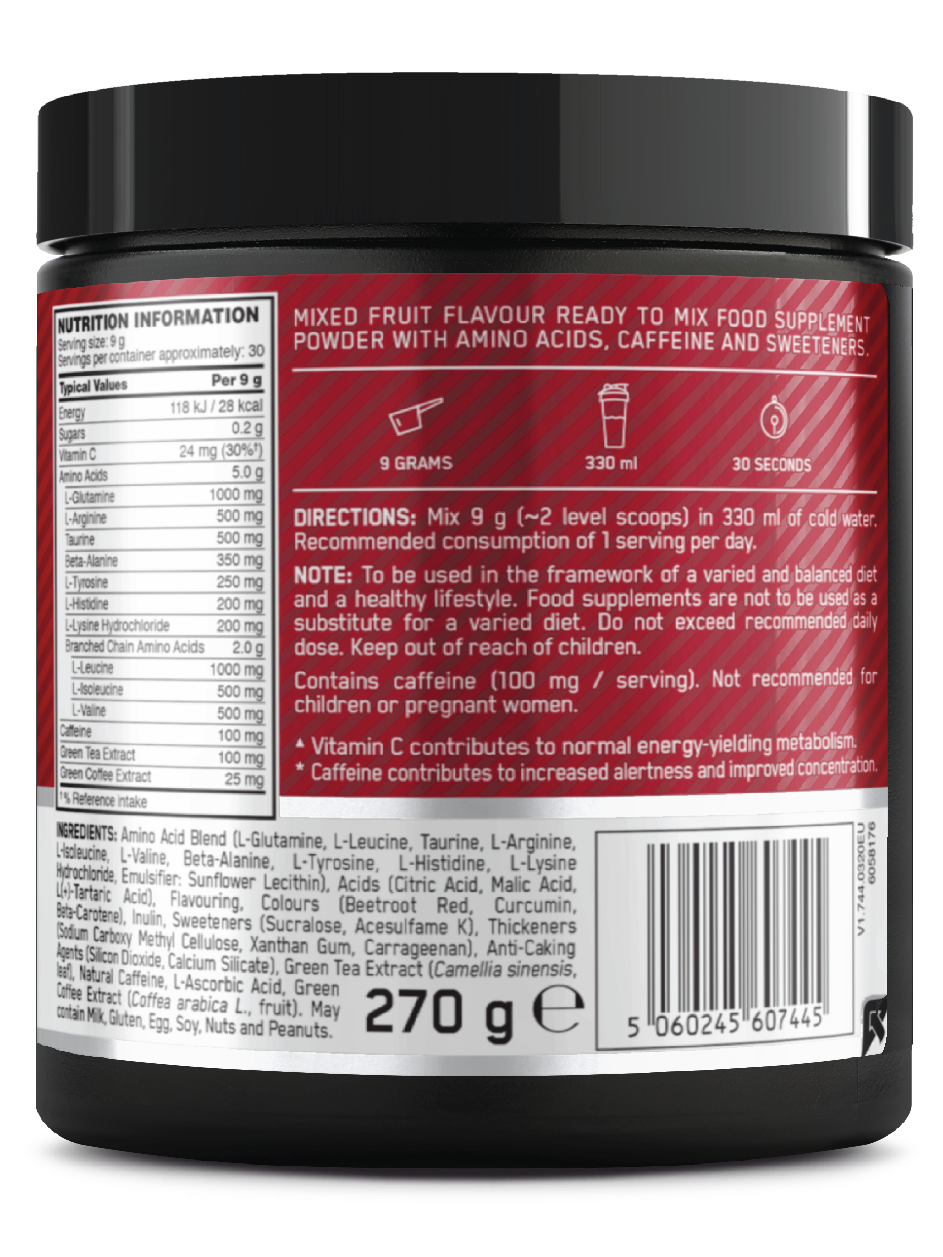 Optimum Nutrition Essential Amino Energy er et kosttilskudd som er beriket med koffein, Carnosyn®, grønn te og grønn kaffebønne. Carnosyn® og koffein er tilsatt slik at du kan bruke Amino Energy både før, under og etter treningen. Med smak av ulike frukter.