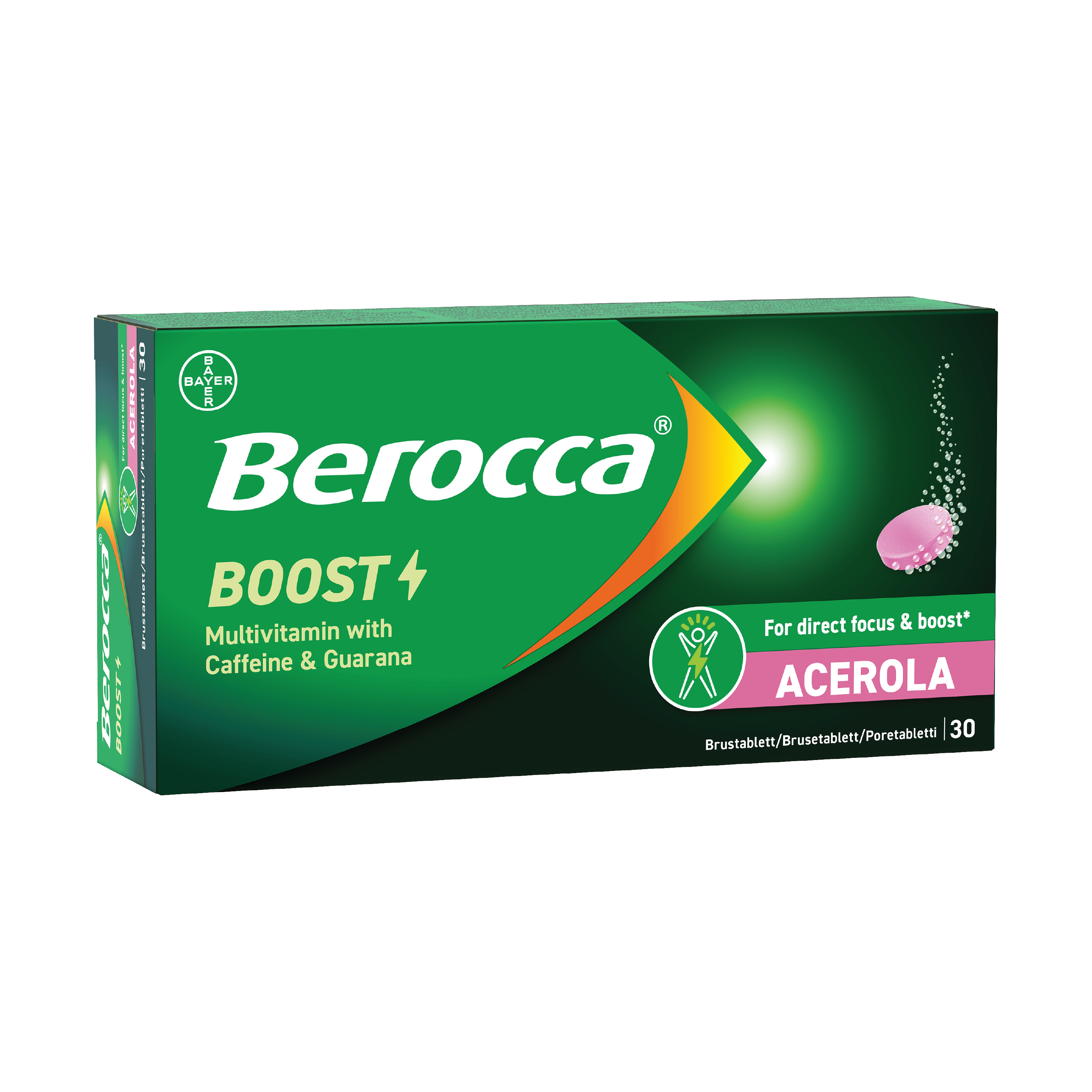 Berocca Boost brusetabletter er et multi vitamin- og mineraltilskudd med koffein. Den skreddersydde sammensetningen av vitaminene B2, B3, B5, B12, C og magnesium kan bidra til å redusere tretthet og utmattelse. Inneholder koffein, fra blant annet guarana, som kan øke oppmerksomheten og forbedre konsentrasjonen. Inneholder søtstoffer. Uten sukker. Uten gluten. Vegansk. Med smak av kirsebær.